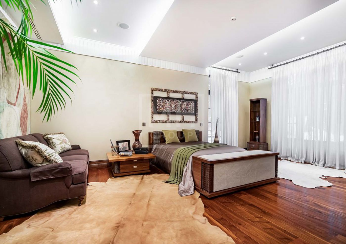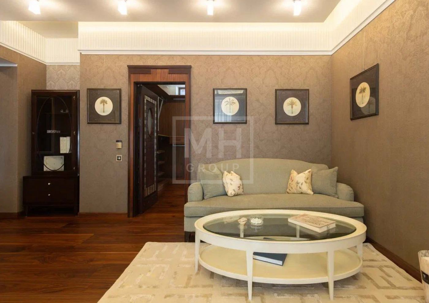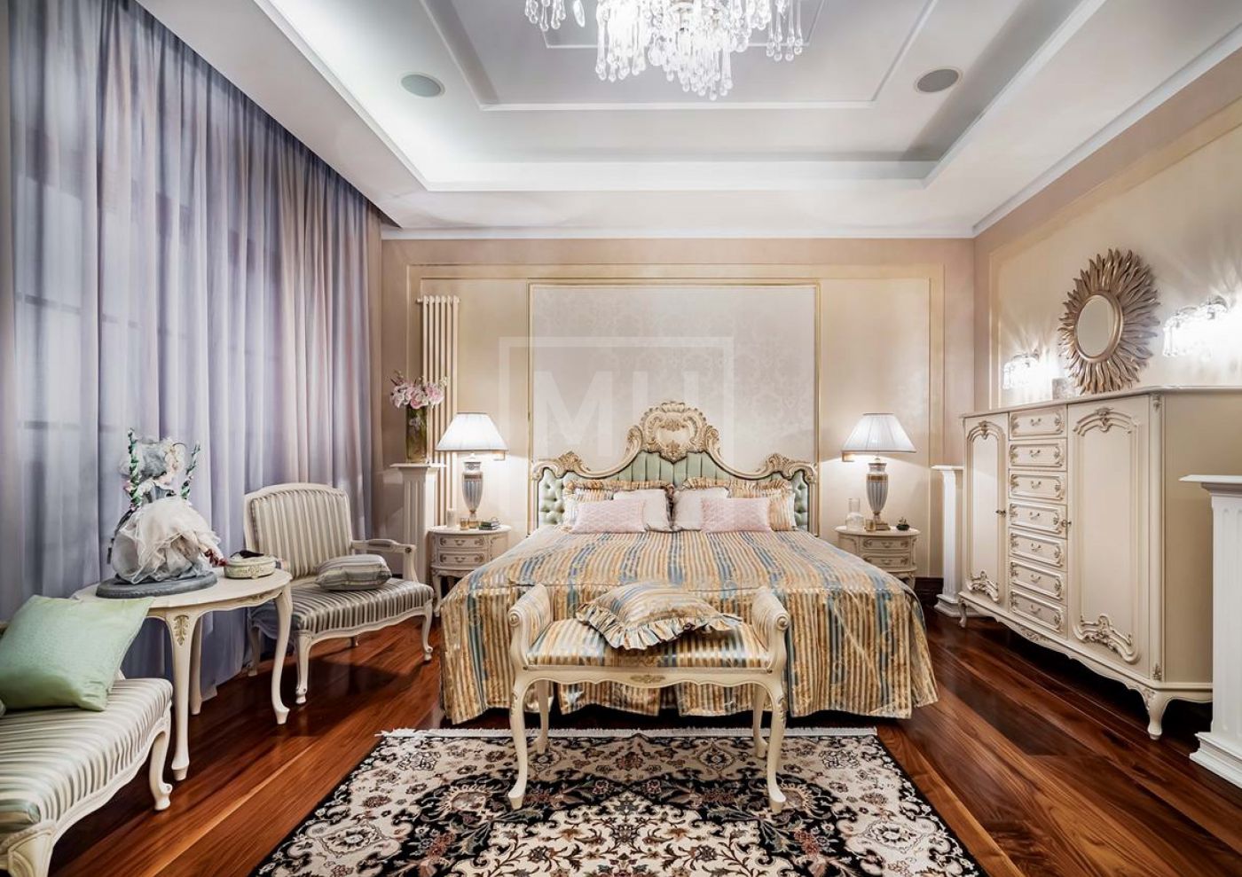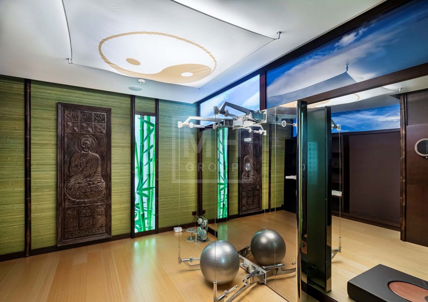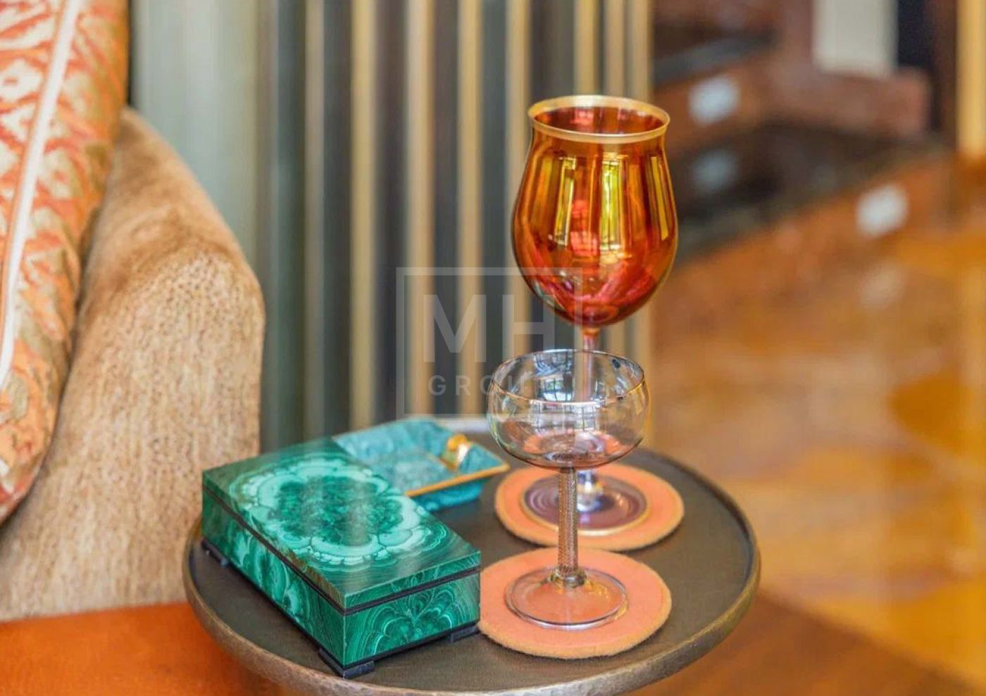 Восхитительная кухня, с нотками стиля Прованс, имеет панорамные окна в пол и выход на уютную террасу, оборудована профессиональной печью La Cornue (Франция), над которой выполнен вытяжной зонт, декорированный медью в старинной технике французских кухонь. Зона библиотеки и арт объектов, мастер-спальня со своей просторной гардеробной и санузлом с джакузи, который полностью облицован ониксом медового оттенка – слэбами и в мозаике.