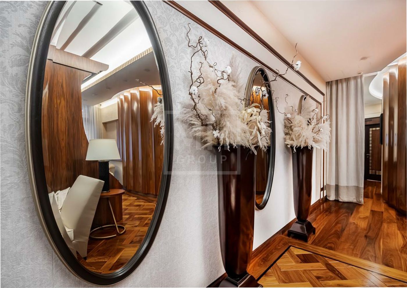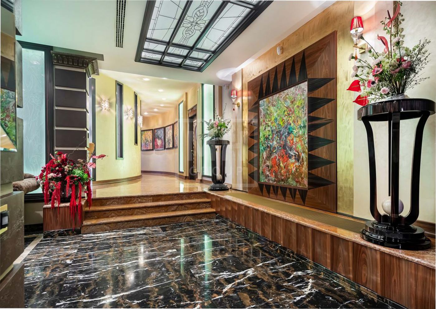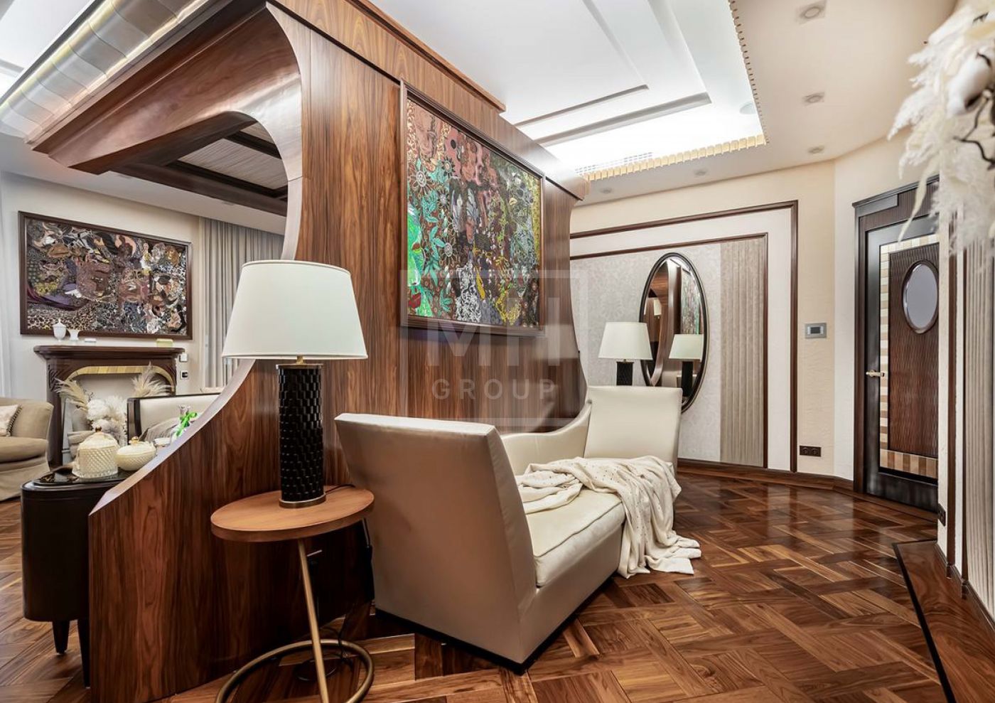 Интерьеры выдержаны в стиле Ар-деко с современными элементами. В отделке использованы только высококлассные дорогостоящие материалы и оборудование. Паркет – из массива американского ореха и дуба. Настенные деревянные панели из массива карельской березы, ореха, махагона, и др. Панно из полудрагоценных камней: агат, содалит, оникс. Пол в холле выполнен из мрамора Portoro Nero – одного из самых редких и дорогих видов мрамора, добываемого под толщей вод Средиземного моря в Италии. В доме собрана коллекция картин, арт объектов, художественной керамики.