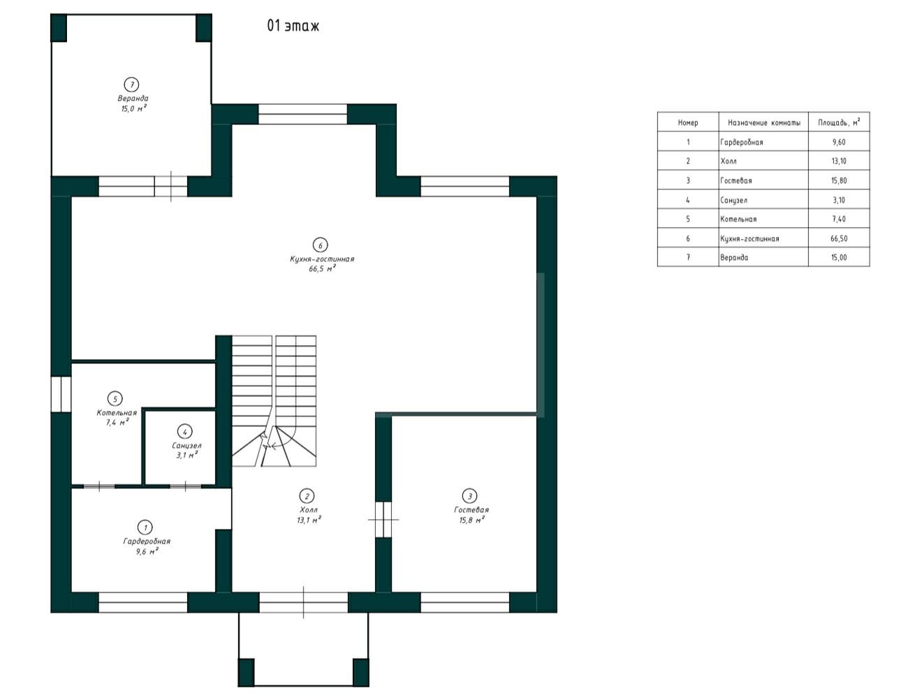 Этаж 1: холл, гардеробная, гостиная, кухня с выходом на веранду, комната гостевая, с-у, постирочная, котельная.