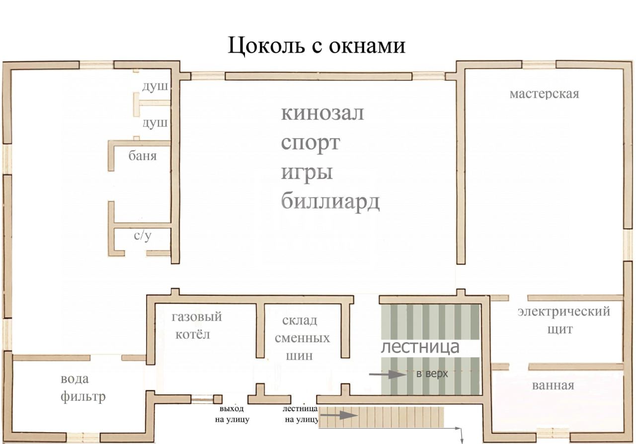 Цоколь: кинозал, спортивная зона, мастерская, хоз.помещения