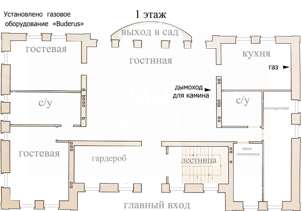 Этаж 1: гостиная 70 кв.м с камином, 2 гостевые спальни, кухня, 2 с/узла, гардеробная, постирочная, подсобное помещение