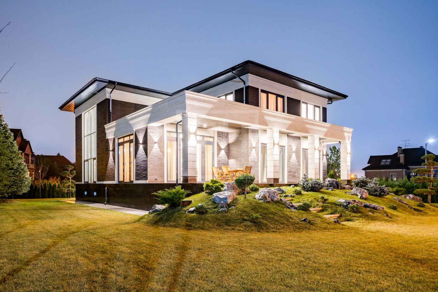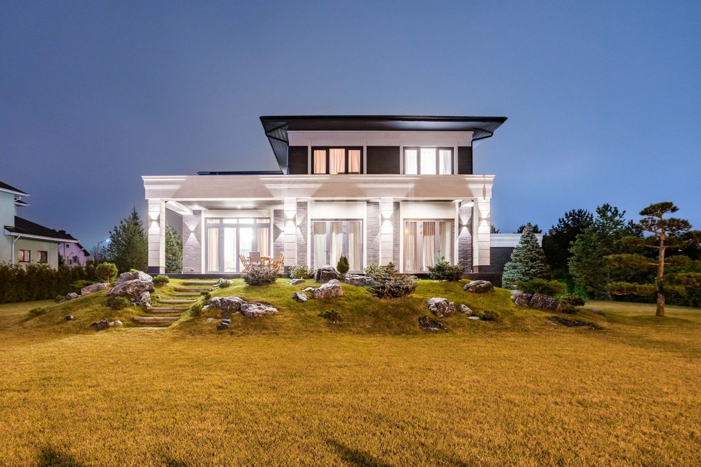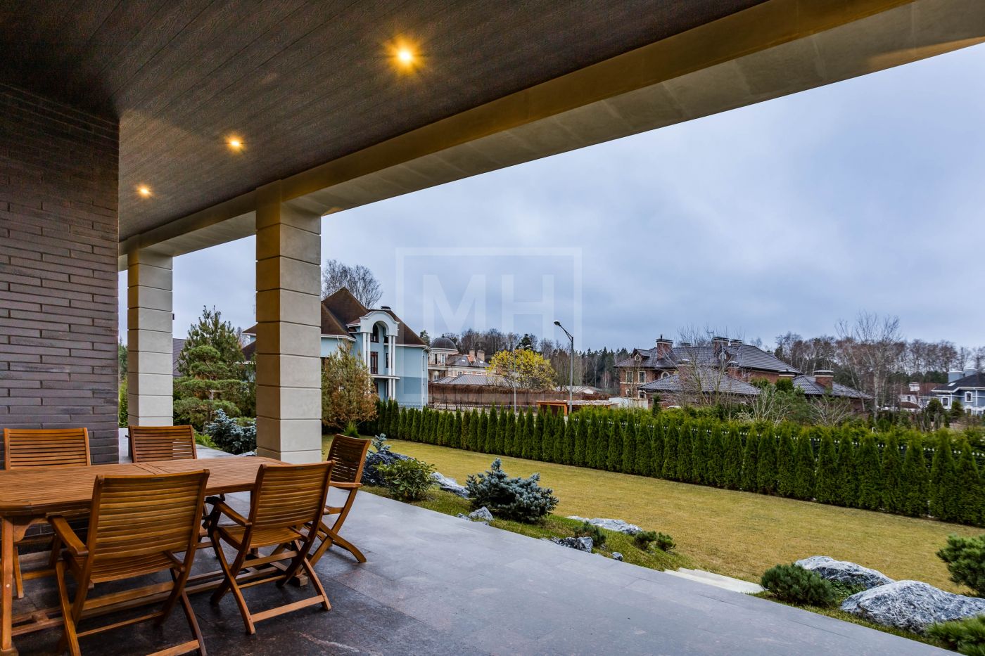 На участке газон, бонсай, туи, деревья, голубые ели, можжевельник. Установлен автоматический полив. Забор по периметру участка. Ворота с электроприводом, откатные.