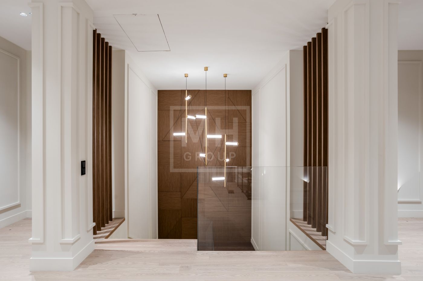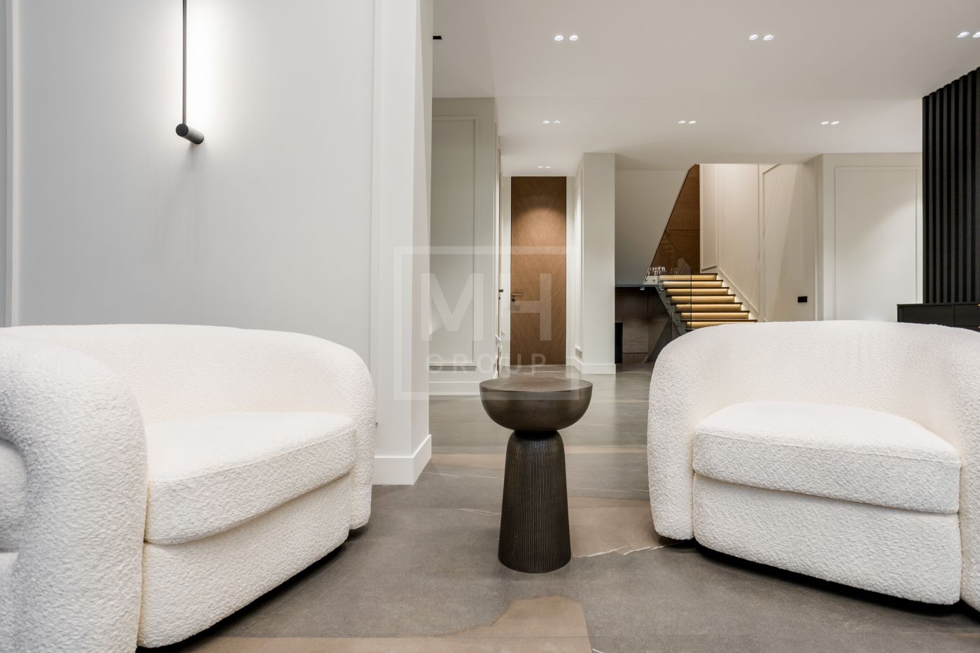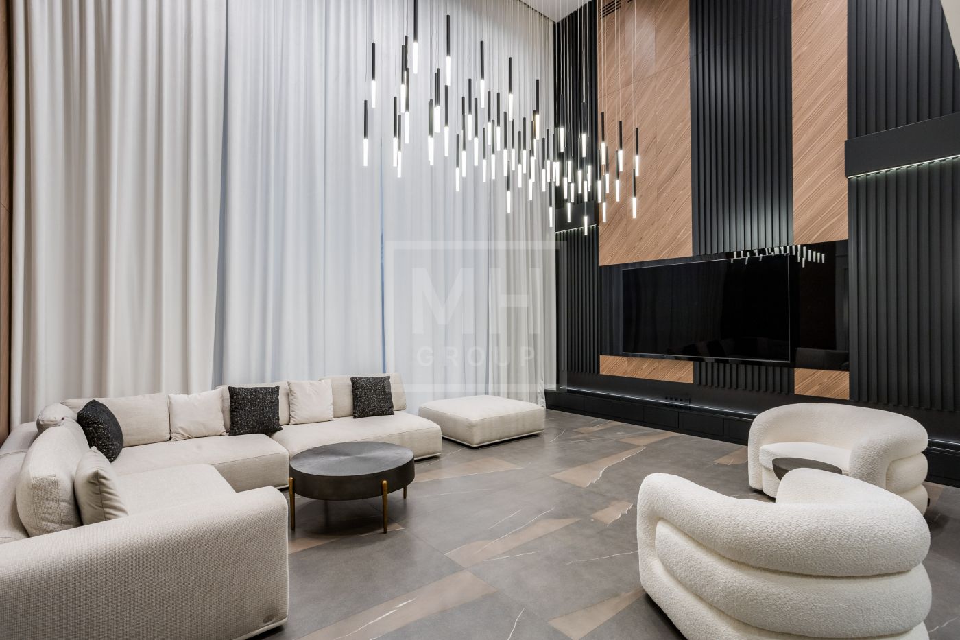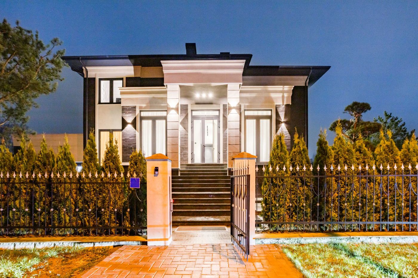 На участке газон, бонсай, туи, деревья, голубые ели, можжевельник. Установлен автоматический полив. Забор по периметру участка. Ворота с электроприводом, откатные.