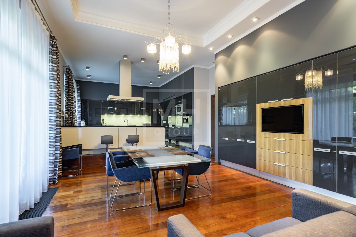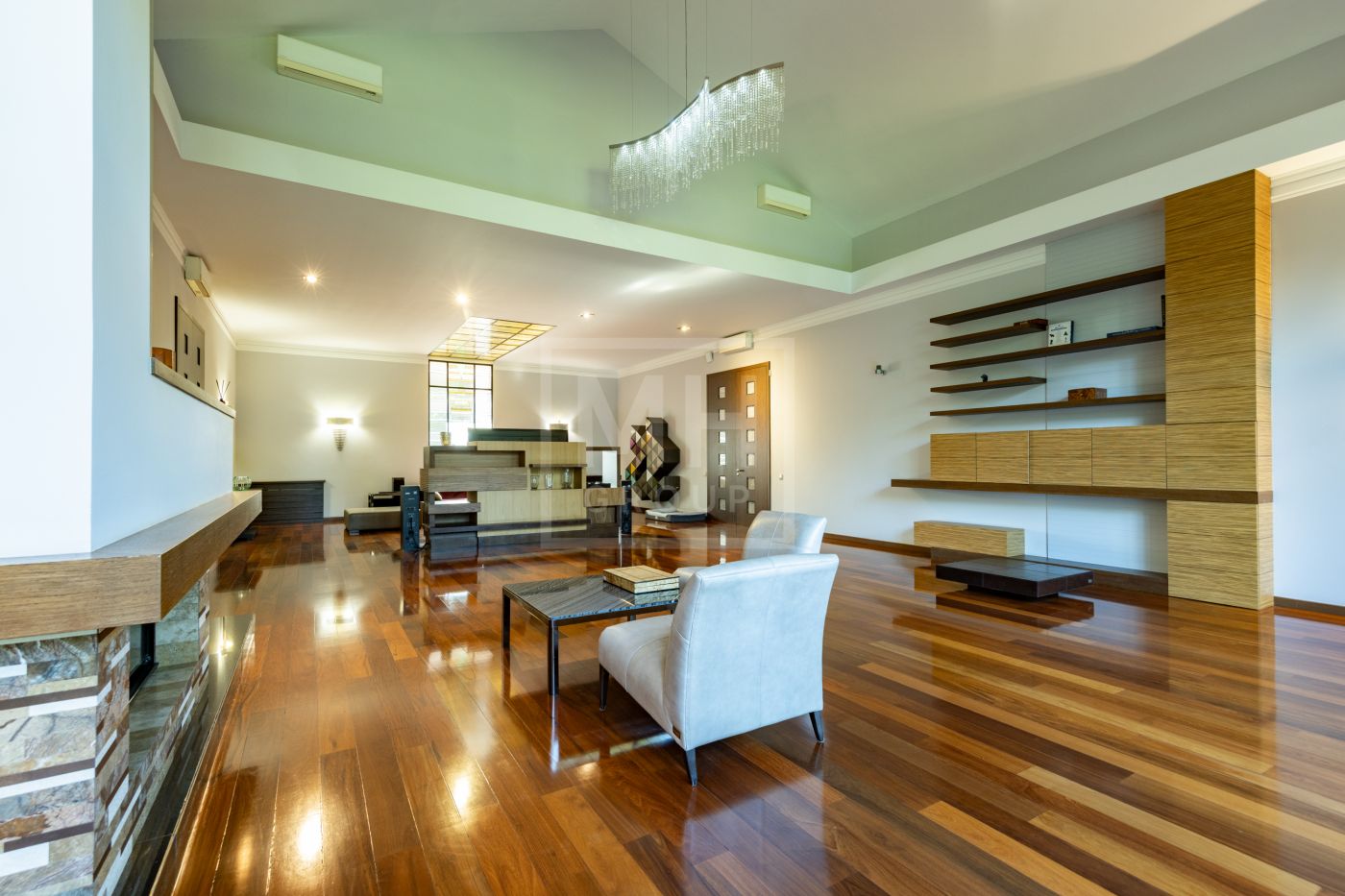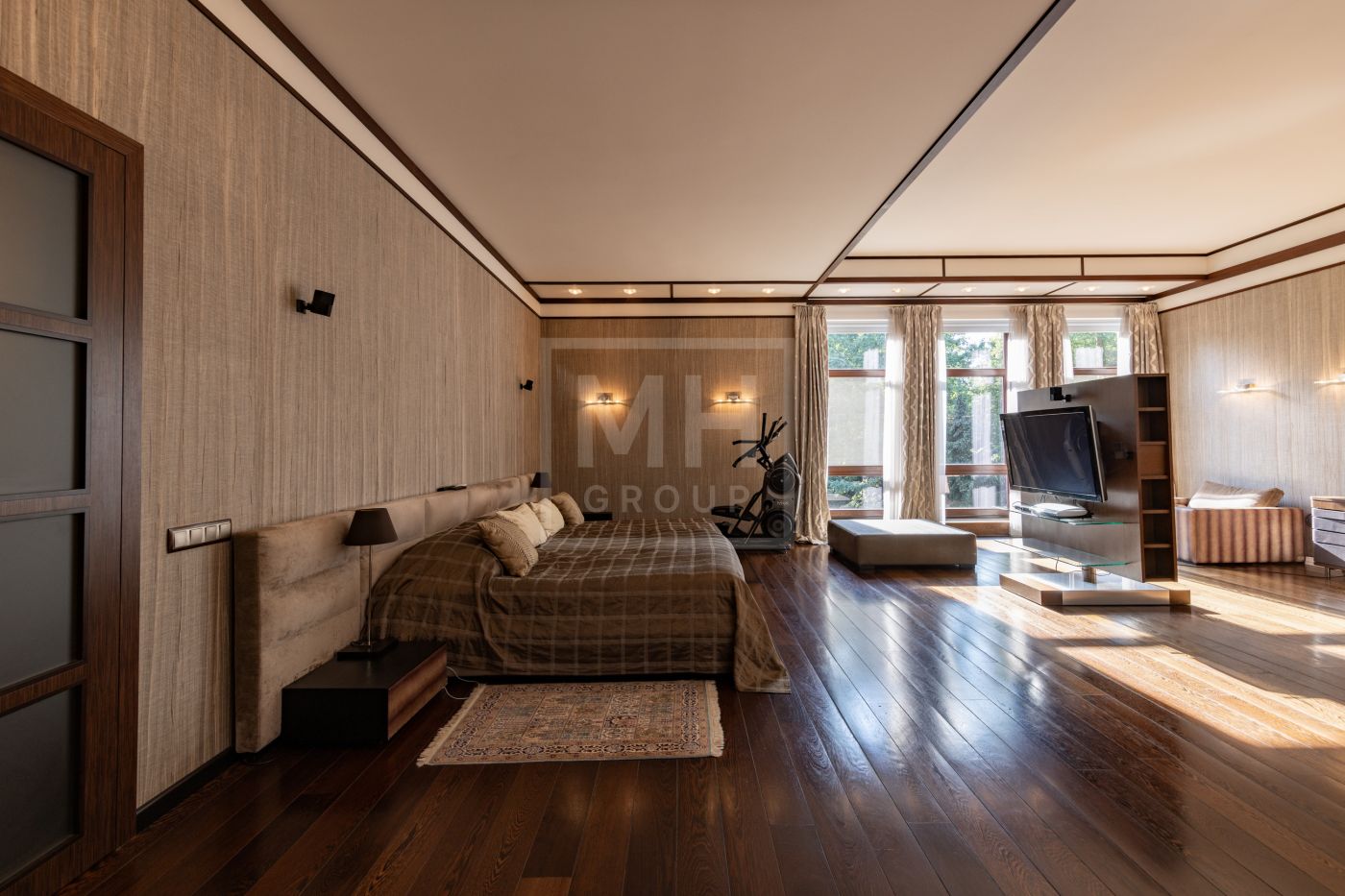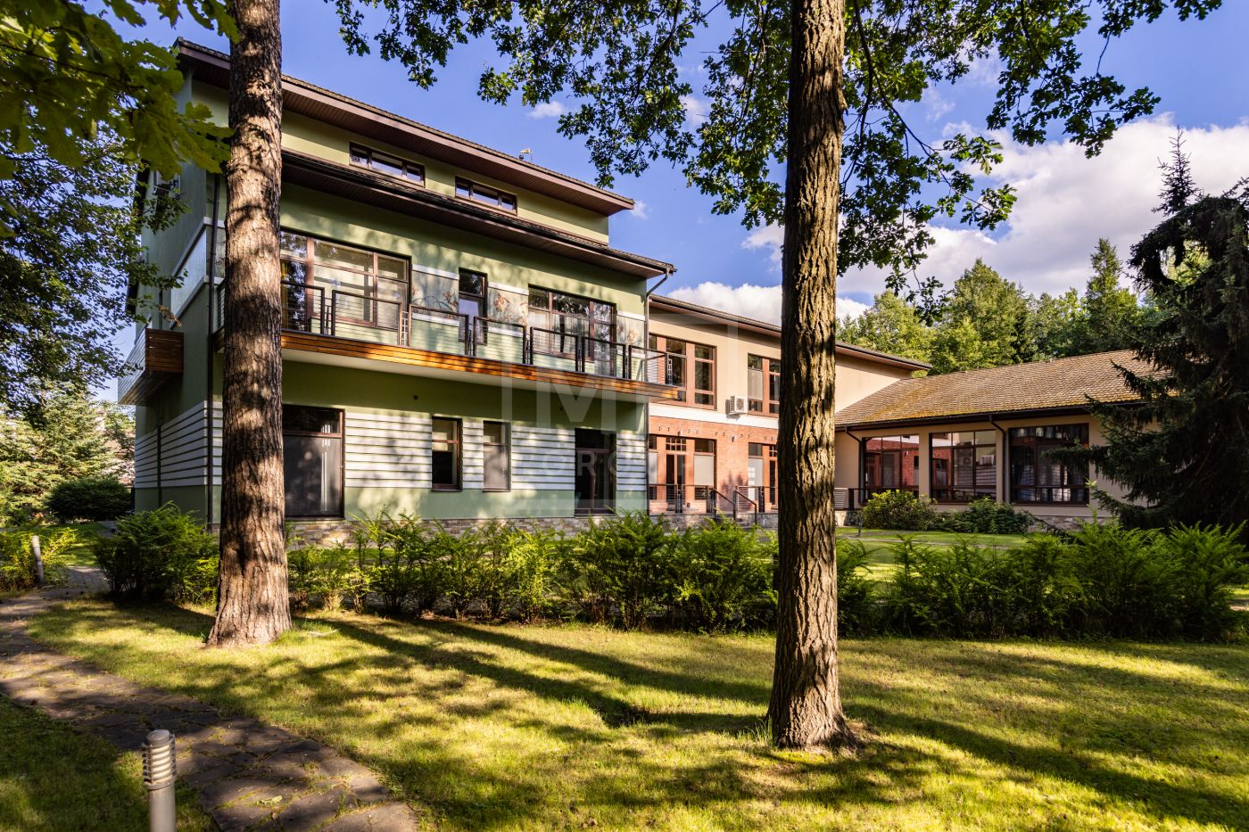 Дом расположен на живописном лесном участке площадью 60 соток с липовой аллеей у парадного входа. Благодаря продуманному ландшафтному дизайну и хвойному массиву по периметру участка здесь царит редкое ощущение покоя, и природа подчеркивает уединенность пространства. Фасад выполнен в выразительном сочетании фактур и материалов.Архитектура привлекает внимание сложной геометрией и нестандартными объемами. В интерьере — теплая, природная палитра, мягкий свет, спокойные оттенки и натуральные материалы, создающие ощущение уюта и сбалансированного ритма жизни. Высокие потолки и второй свет придает пространству легкость и масштаб. Из окон открывается вид на хвойный массив. По всему периметру дома расположены террасы..