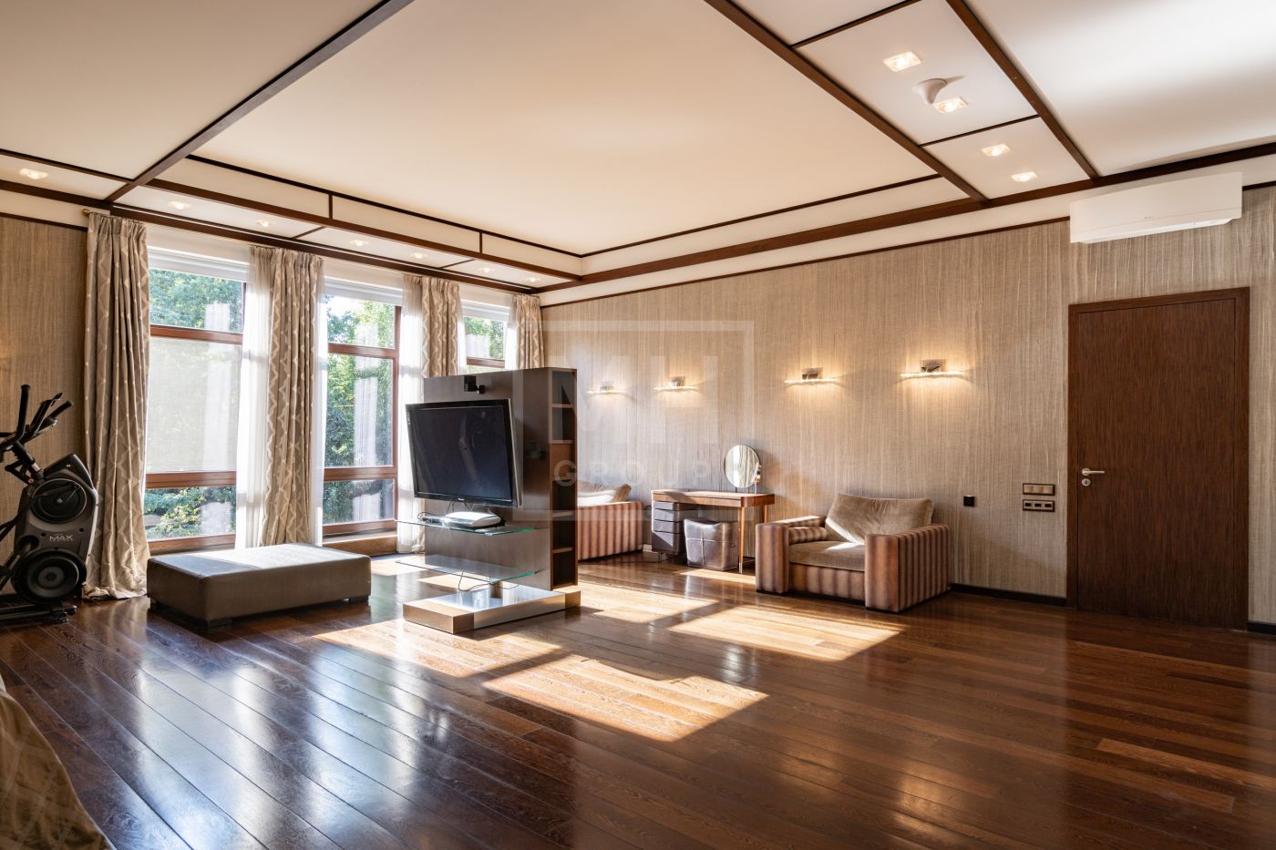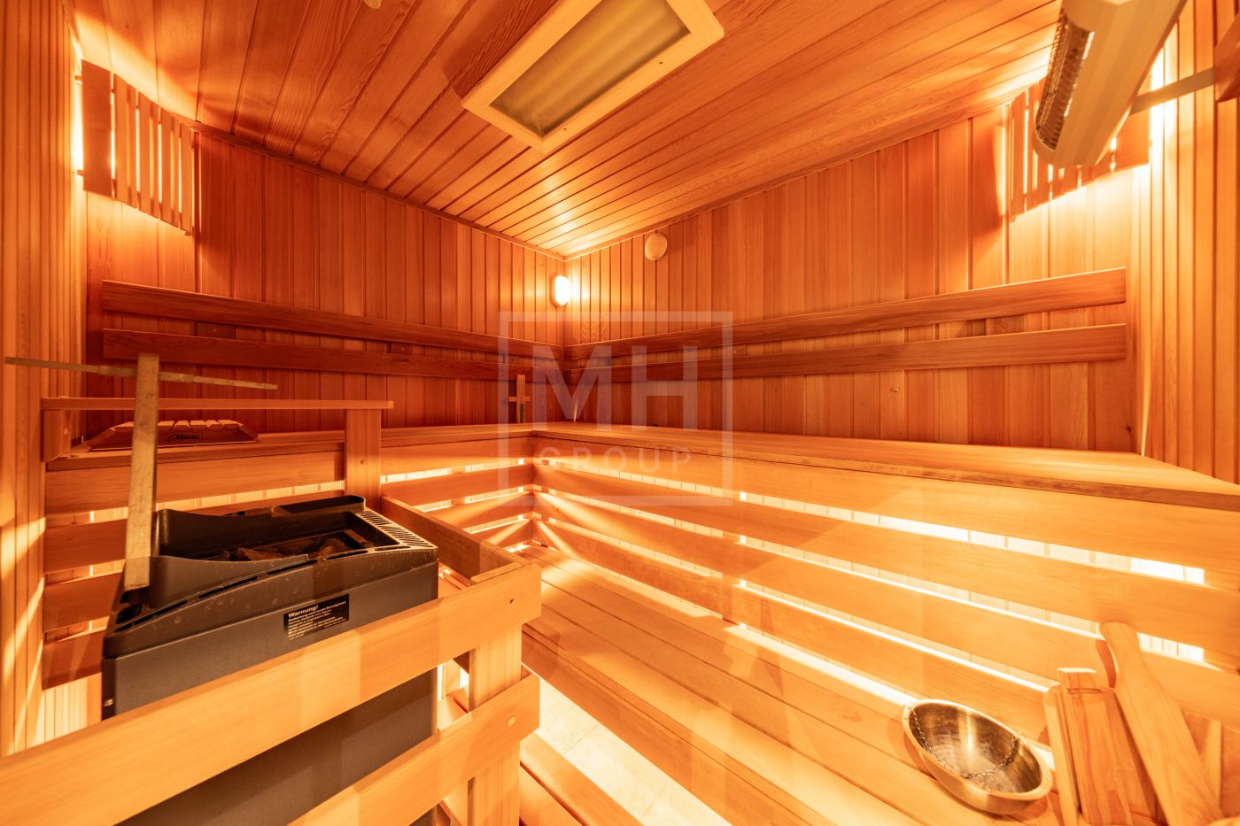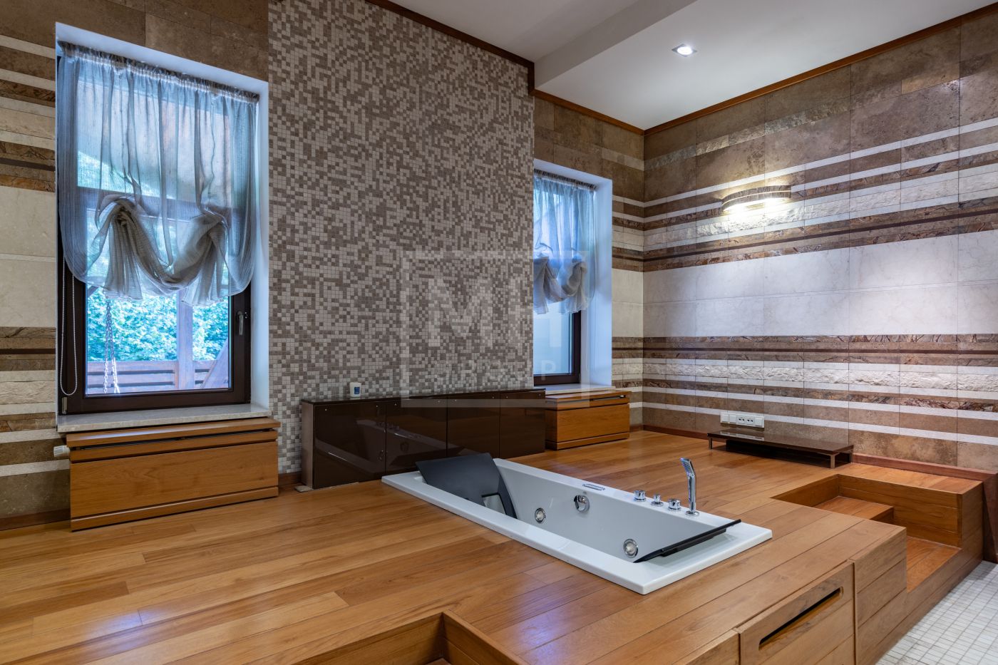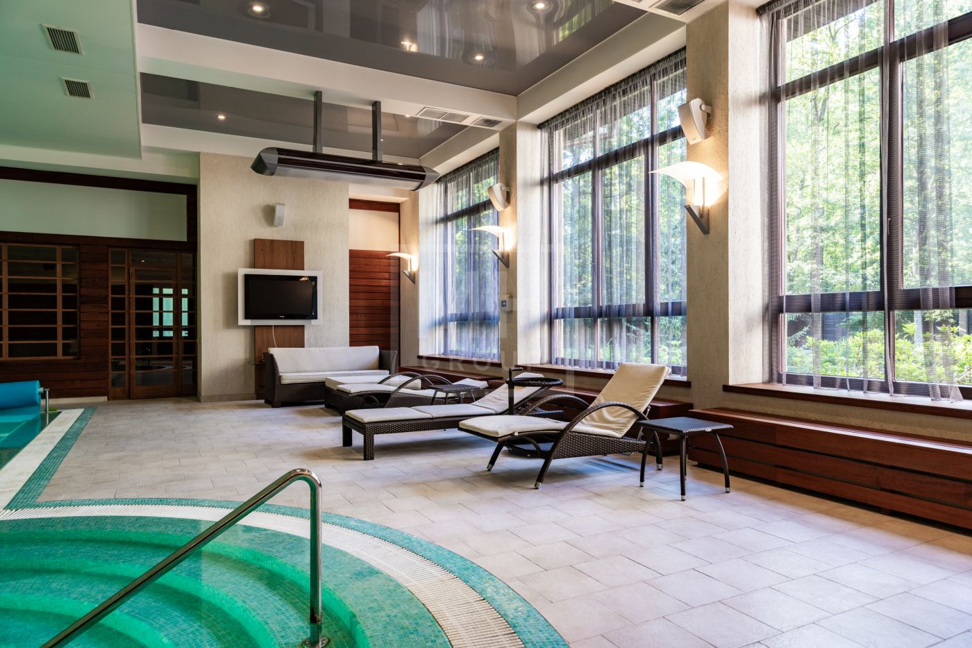 Этаж 1: большой парадный холл с выходом на террасу, прихожая, санузел, гардеробная, лифт,гостиная, кабинет, кухня-столовая с большой летней террасой , кладовая,санузел, зона SPA — бассейн, сауна, русская баня с купелью и выходом на террасу , су, душевая. Также на первом этаже расположены: две гостевые спальни с санузлами, кухня, холл с гардеробной.