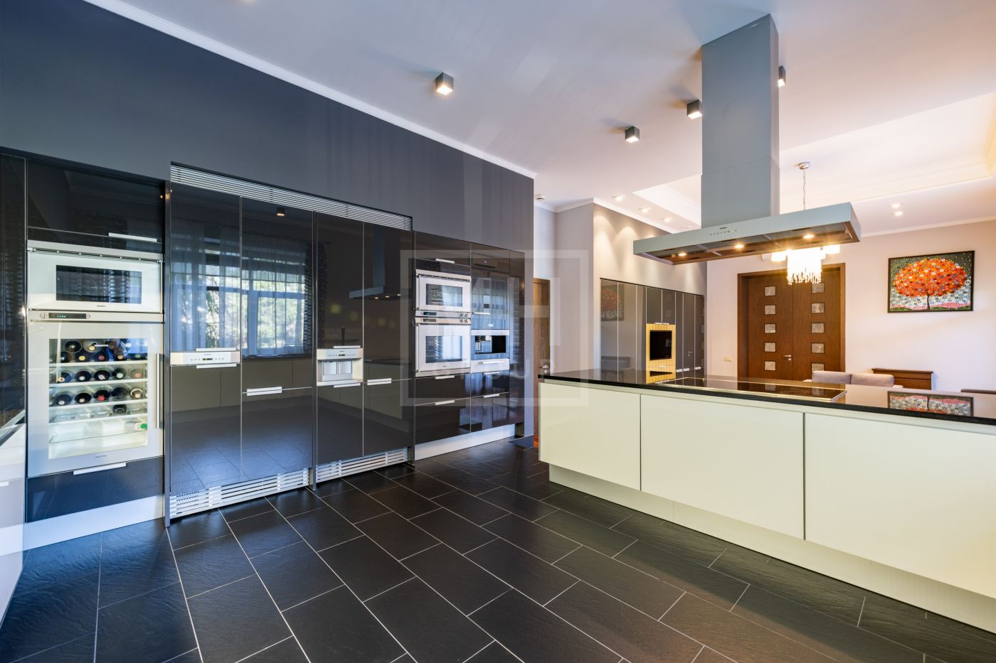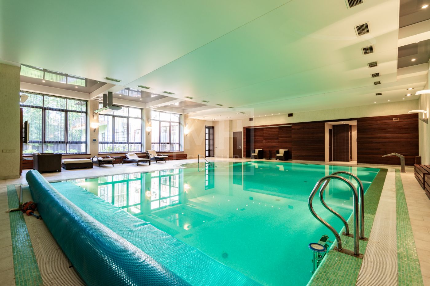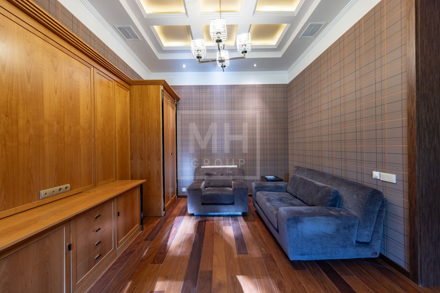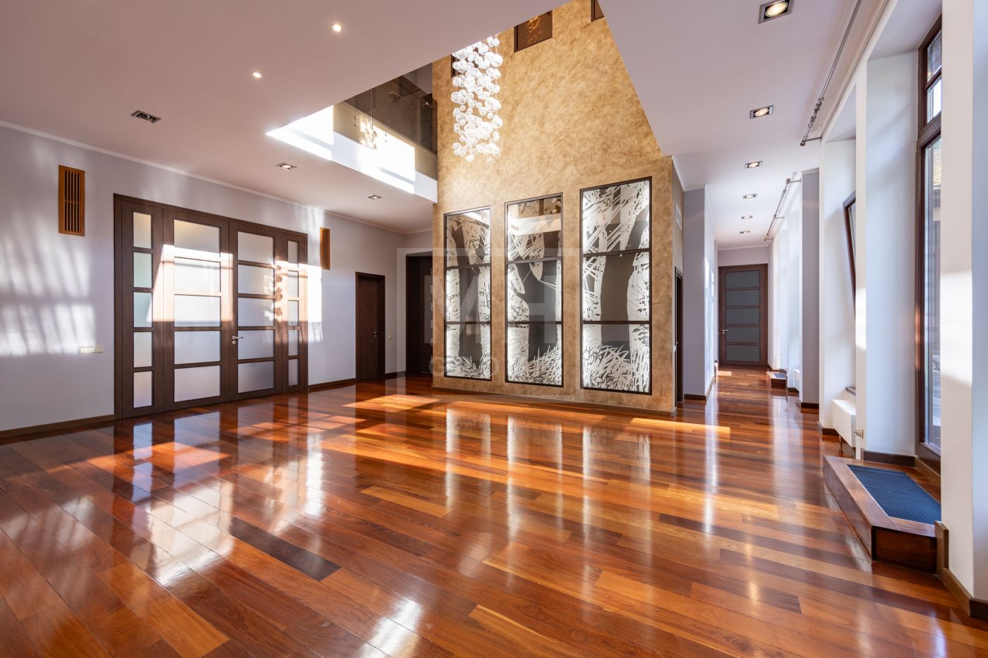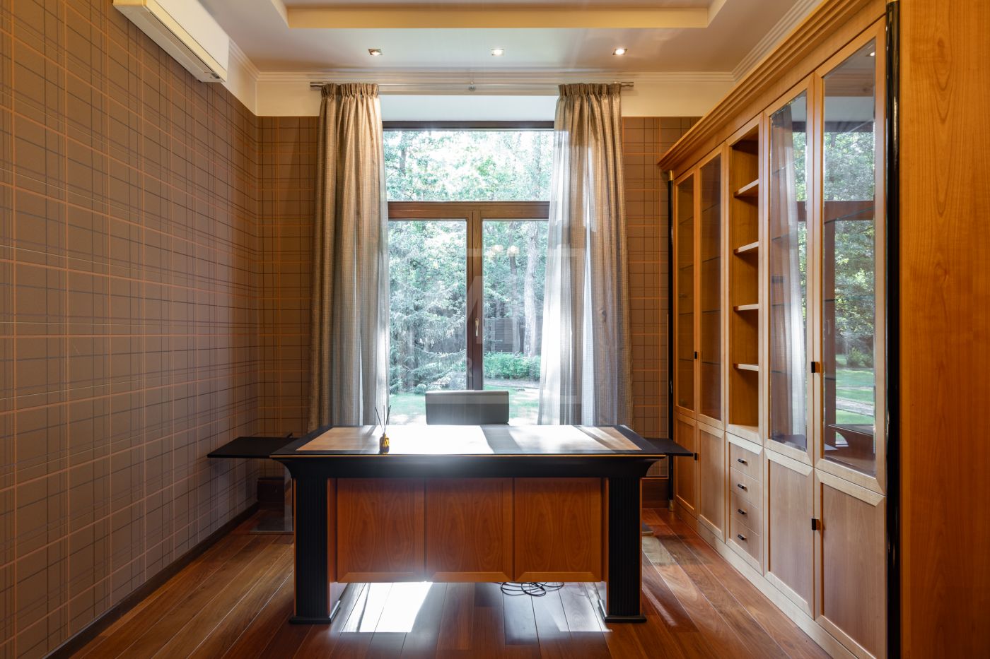 Этаж 1: большой парадный холл с выходом на террасу, прихожая, санузел, гардеробная, лифт,гостиная, кабинет, кухня-столовая с большой летней террасой , кладовая,санузел, зона SPA — бассейн, сауна, русская баня с купелью и выходом на террасу , су, душевая. Также на первом этаже расположены: две гостевые спальни с санузлами, кухня, холл с гардеробной.