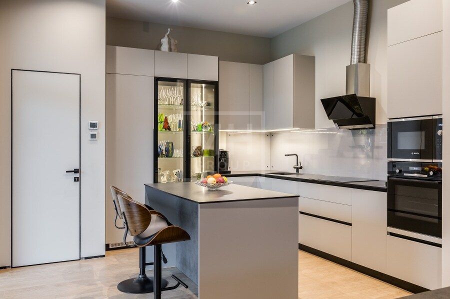 Дом построен из энергоэффективных керамоблоков Porotherm, облицован фиброцементными панелями Nichiha и KMEW, перекрытия — железобетон. Выполнен с использованием премиальных материалов и инженерных систем: магистральный газ, электричество 30 кВт, автономная вода, ЛОС большой мощности, видеонаблюдение, сигнализация с выездом Росгвардии.