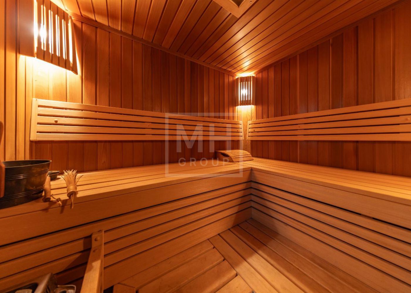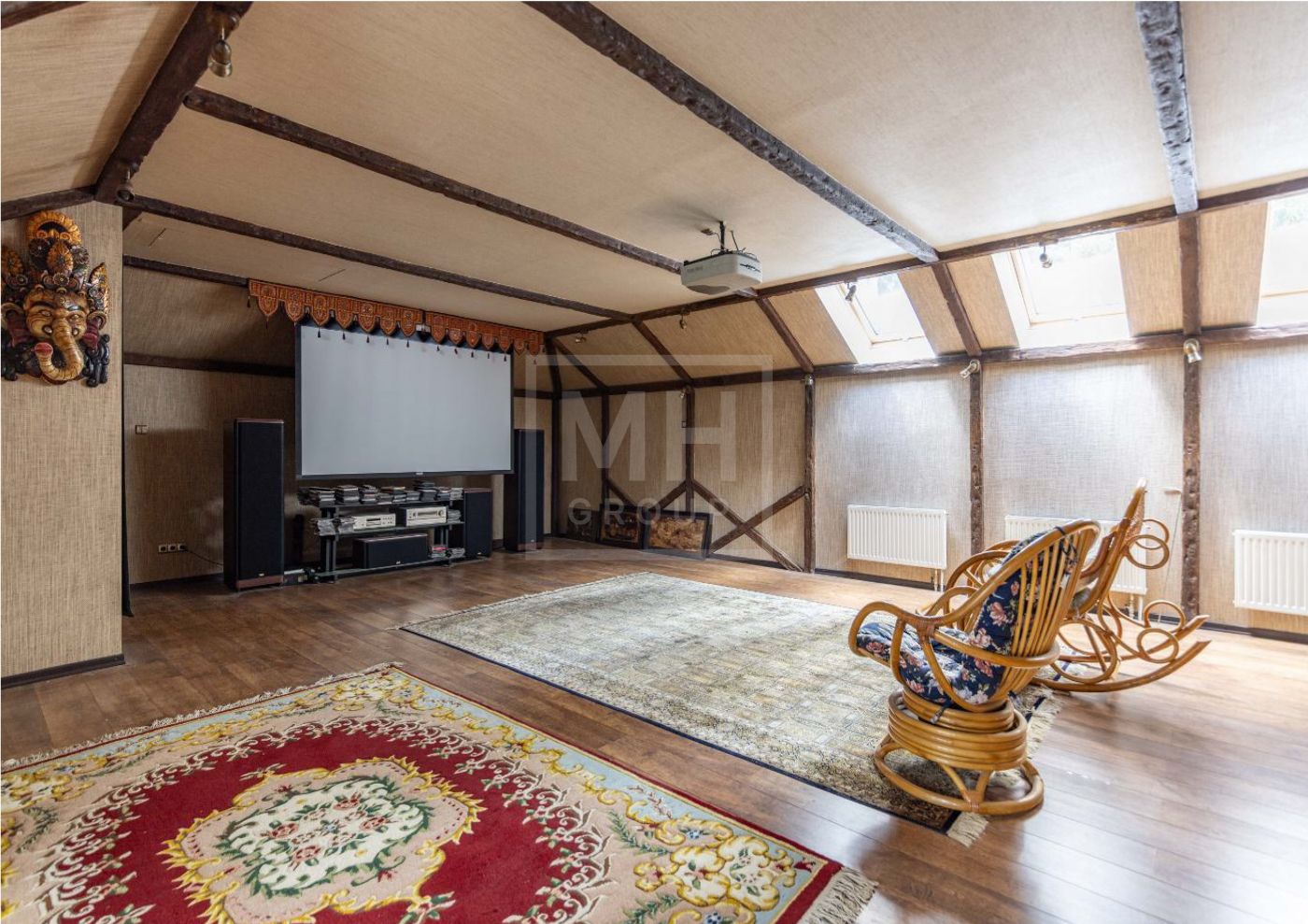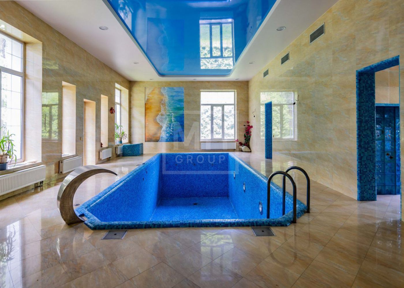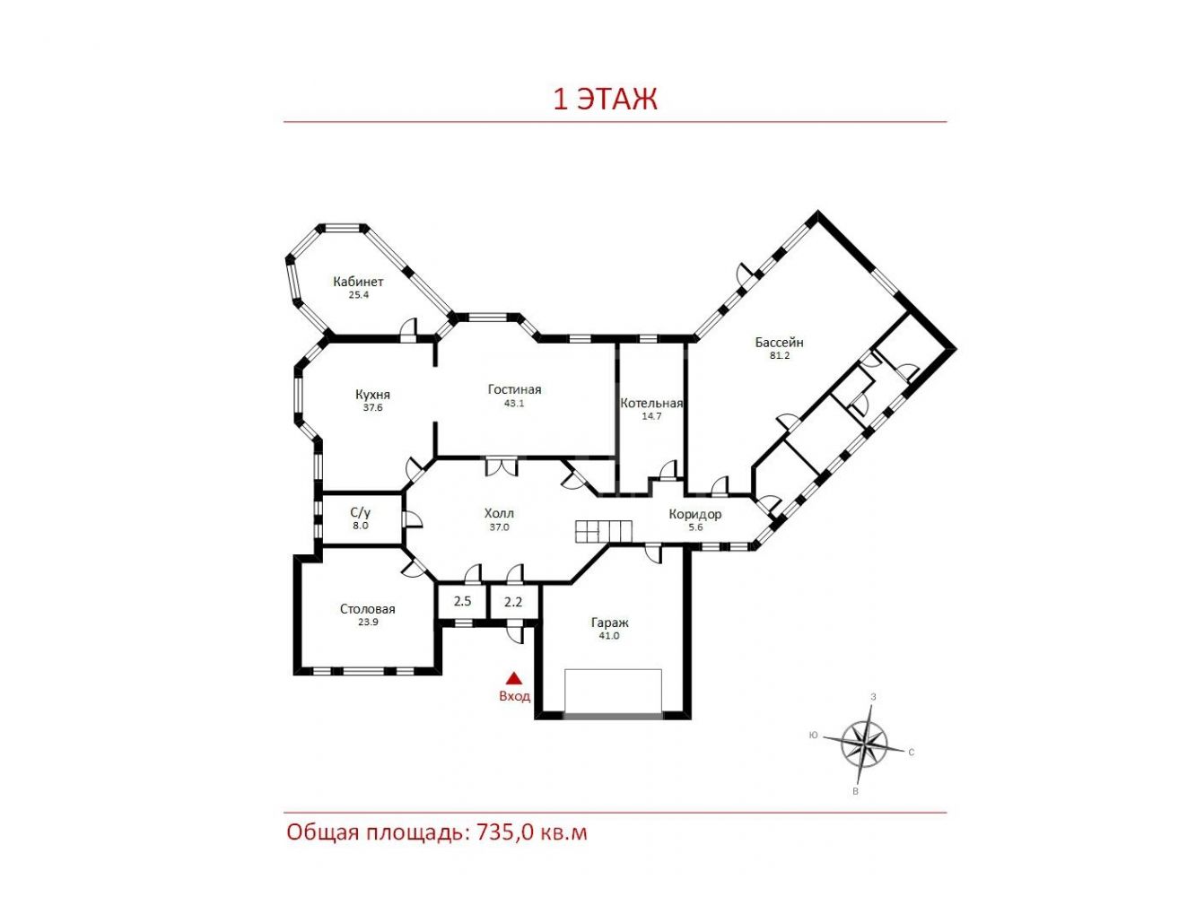 Этаж 1: холл, гардеробная, кабинет, с/у, кухня с выходом на теплую крытую террасу, каминный зал, бассейн с противотоком, сауна, душевая, с/у, хоз.комната, бойлерная, гараж на 2 м/м.