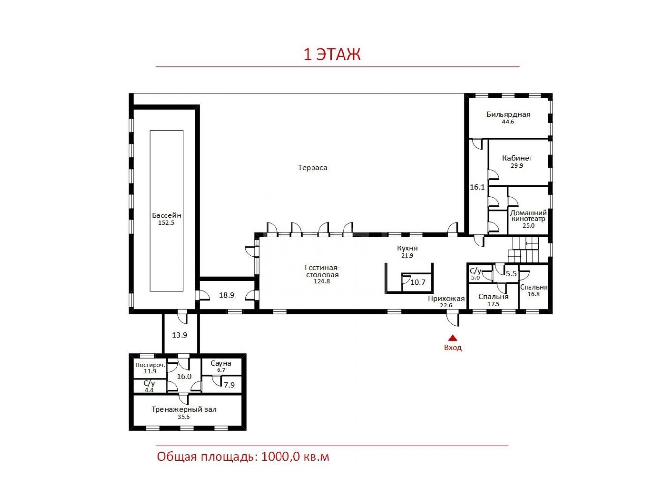 Этаж 1: холл, гардеробная, гостиная с камином и выходом на террасу; зона столовой, кухня, с/у гостевой, домашний кинотеатр, кабинет, бильярдная с баром; блок: 2 спальни с с/у; зона СПА: бассейн 18м, парная, с/у, спортзал; полностью оборудованная прачечная, терраса с зоной барбекю.