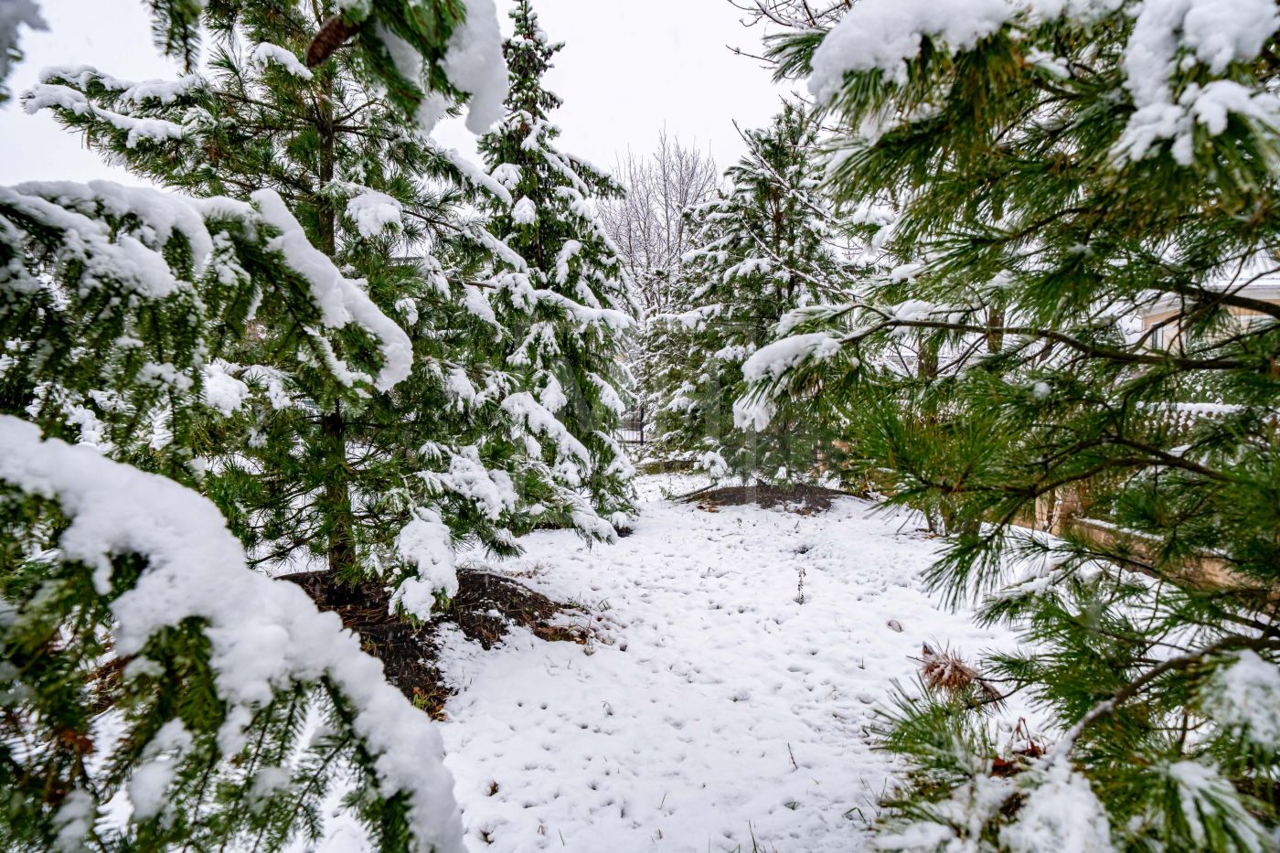 Участок площадью 30 соток выходит к водному каналу и окружён зрелыми хвойными деревьями, создающими приватность и мягкое природное обрамление.