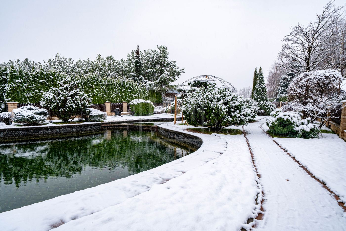 Этаж 1: 2 холла, прихожая, гардеробная, кухня, столовая, гостиная, спальня с санузлом, кинотеатр, кладовая, 2 санузла, постирочная, котельная, терраса, зона барбекю, гараж для 4-х автомобилей с квартирой для персонала на втором этаже с отдельным входом, СПА-зона с бассейном, хаммамом, сауной, раздевалкой, террасой и санузлом.