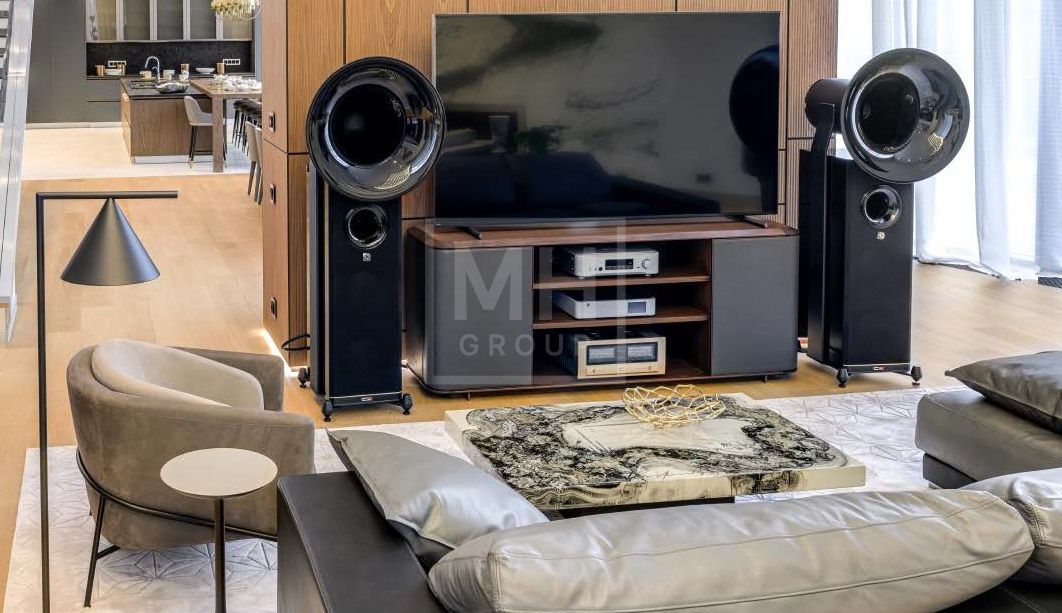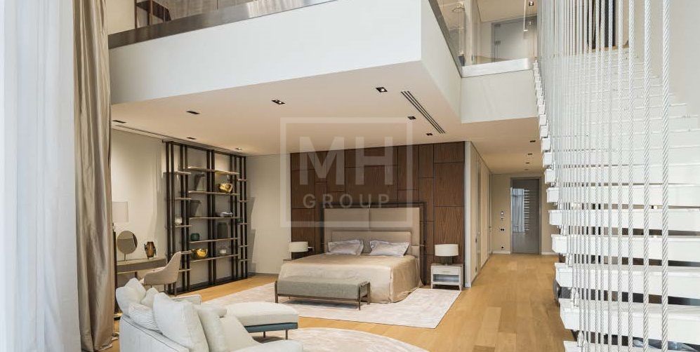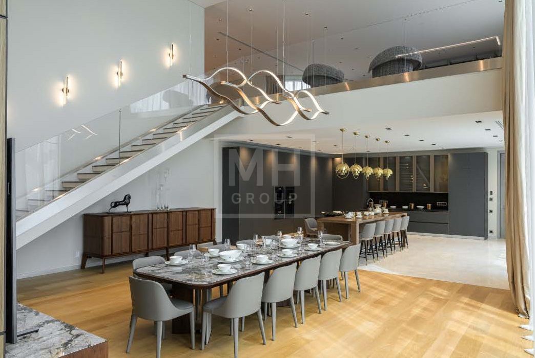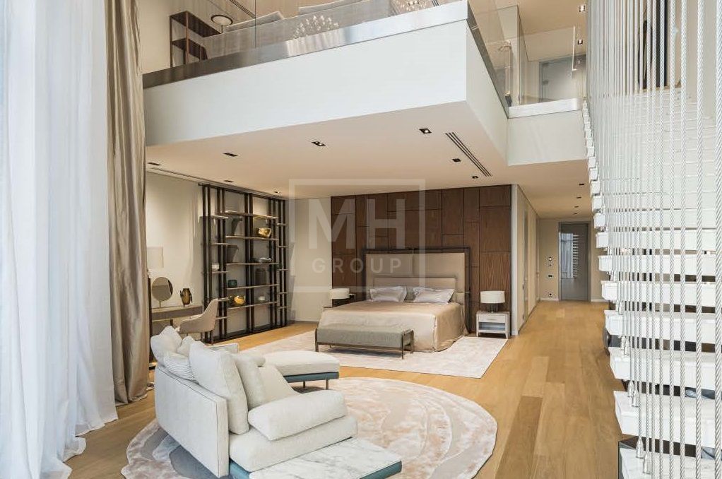 Дополнительно — шесть спален, каждая с гардеробной и санузлом, библиотека, семейная гостиная. Мебель в интерьере — Rugiano, Minotti, Frato, Porada, Flexform, Poltrona Frau, Ulivi, Fiam. Свет — Flos, Foscarini, Tom Dixon. В отделке — мрамор, оникс, натуральное дерево, стекло и металл.
