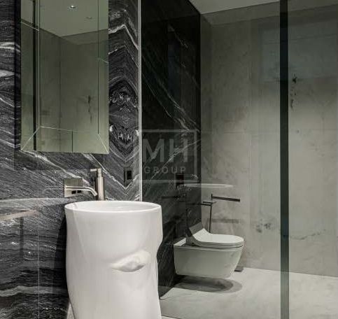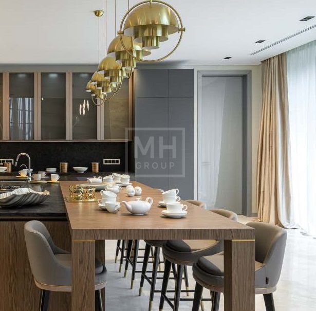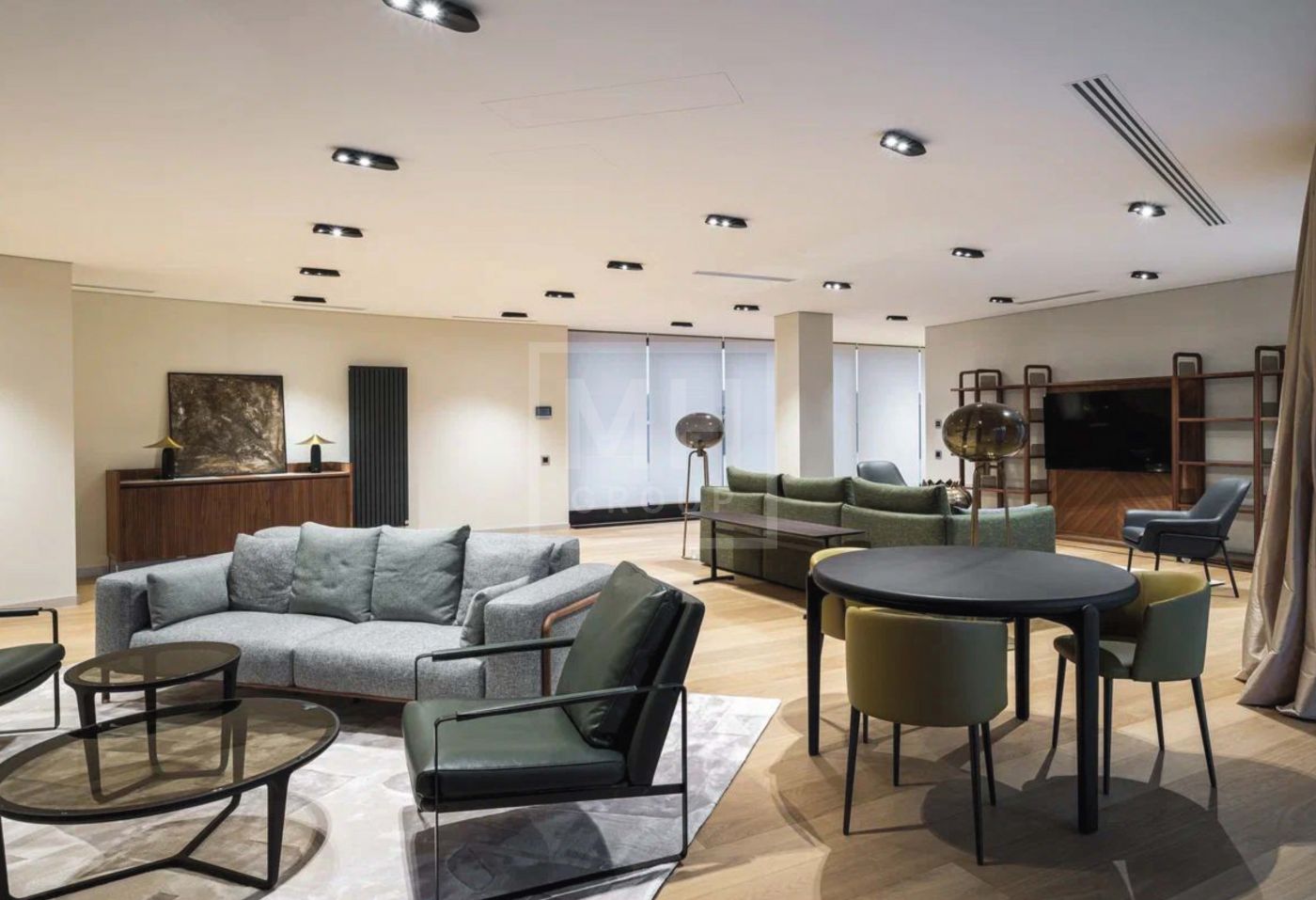 Парадная зона встречает высоким потолком, вторым светом и панорамными окнами с видом на парк. В центре гостиной — мраморное панно из итальянского камня, уложенное в раскладке «бабочка» — скульптурный акцент, задающий тон всему интерьеру, а также, не менее прекрасное украшение гостиной — акустический рояль SCHIMMEL. Мебель — Ulivi MAX и Minotti Horizonte, Baxter Calix, Minotti Song, Rugiano Decoro, аксессуары Bosa, Smania, Gallotti&Radice. Кухня объединена с обеденной зоной, дополнена барной стойкой и подвесами Gubi Multi-Lite. Также на этаже: кабинет с библиотекой (Emmemobili, Rugiano), гостевая спальня, парикмахерская, гардеробные, технические помещения, SPA-комплекс с бассейном, сауной, хаммамом, душевыми и раздевалками.
