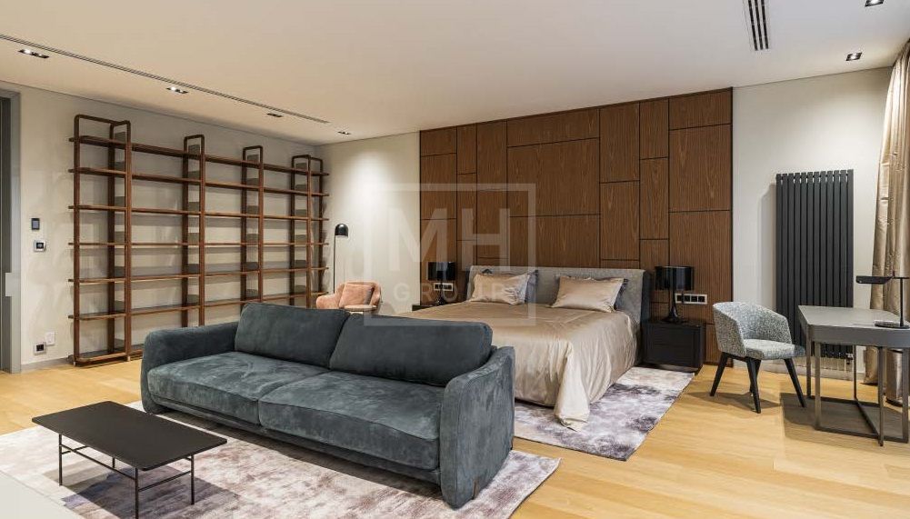На участке — отдельно стоящий гараж на 6 машиномест, помещение охраны, хозяйственный блок и квартира для персонала. Простор позволяет разместить террасы, зоны барбекю, бассейн и прогулочные маршруты. Ландшафт выполнен с учётом приватности и видов на зелёный массив.
