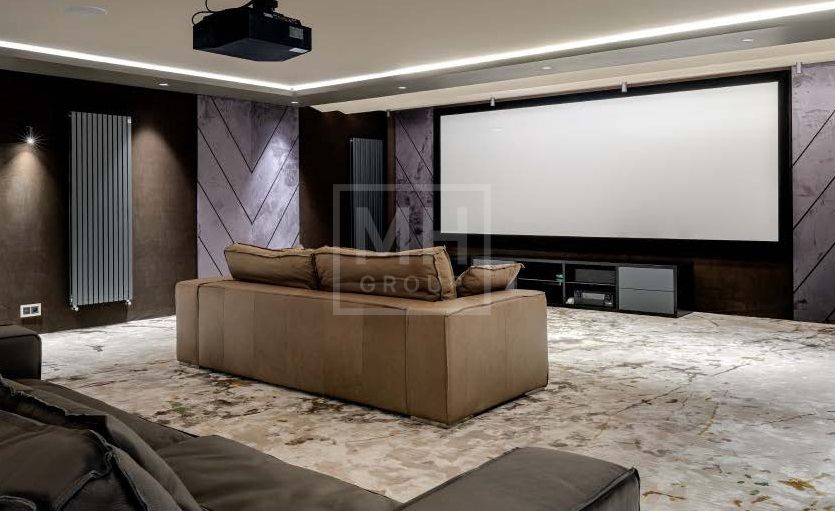 Цокольный этаж — это отдельный мир. Гостиная, бильярдная, курительная, две винные комнаты, кинотеатр, серверная, кладовые, прачечная, гладильная, технические помещения. Профессиональная кухня — поражающего масштаба, в два раза больше, чем в лучших частных проектах. Это пространство, где можно готовить на уровне мишленовского ресторана. Мебель в этом пространстве — Meridiani, Frato, Baxter, аксессуары — Bosa. Отделка — натуральный мрамор, керамогранит GRANITI FIANDRE, дубовый паркет.