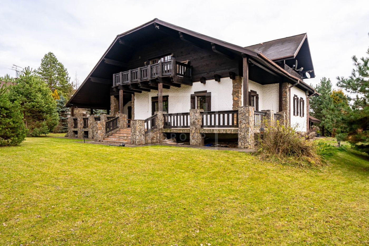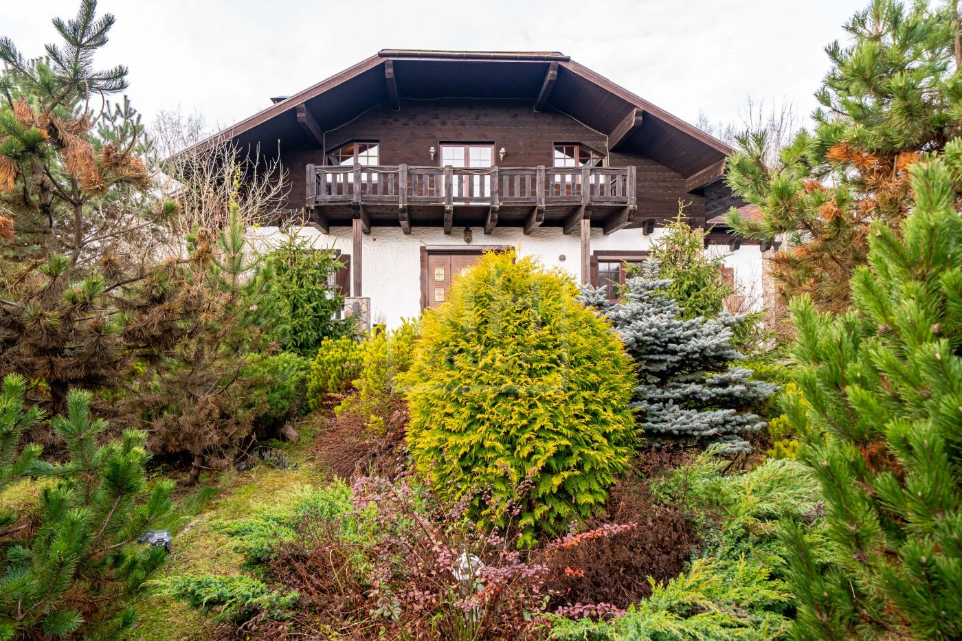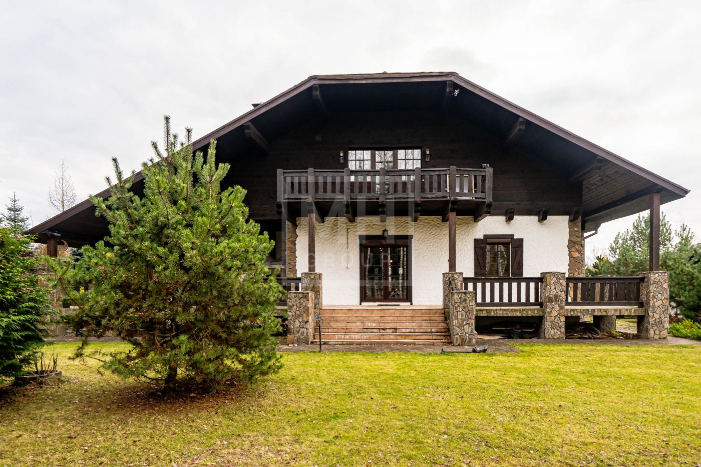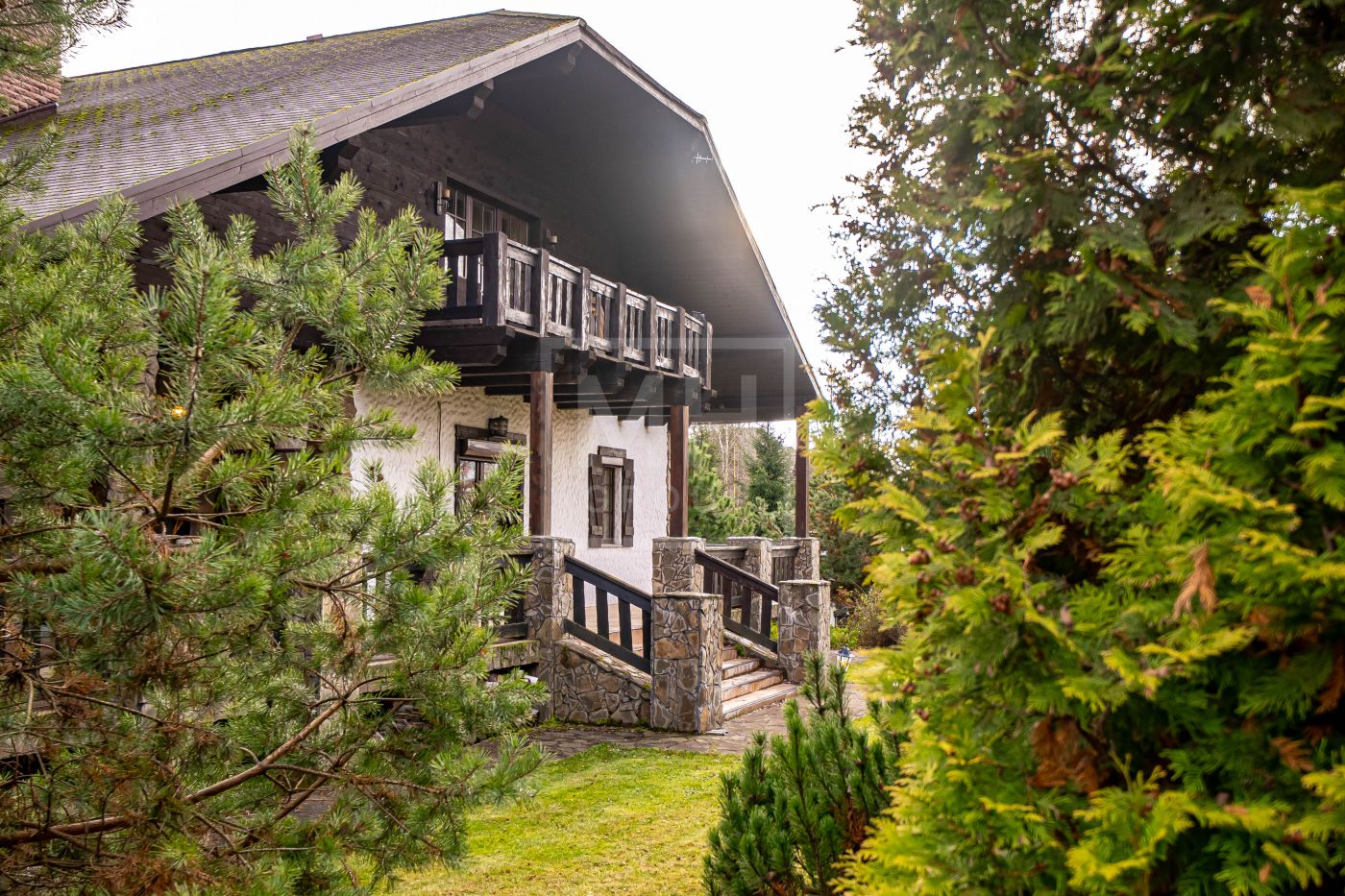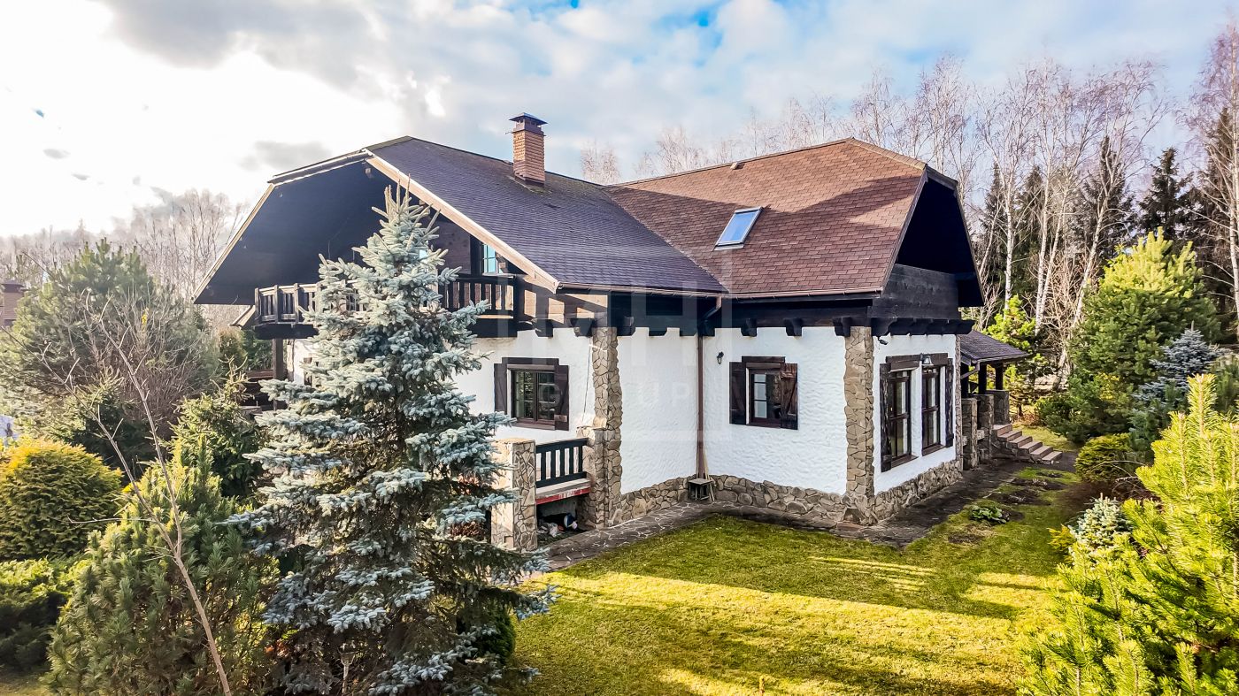 Загородный дом в стиле шале расположен в тихом месте на живописном лесном участке в охраняемом посёлке. На участке правильной формы также расположен гараж на два автомобиля с квартирой для гостей или для персонала. В оформлении ландшафта использованы преимущественно хвойные деревья и кустарники, благодаря этому участок прекрасен в любое время года.Планировки дома продуманные и комфортные. Просторные спальни наполнены светом, а пейзажи, открывающиеся из окон дома, завораживают