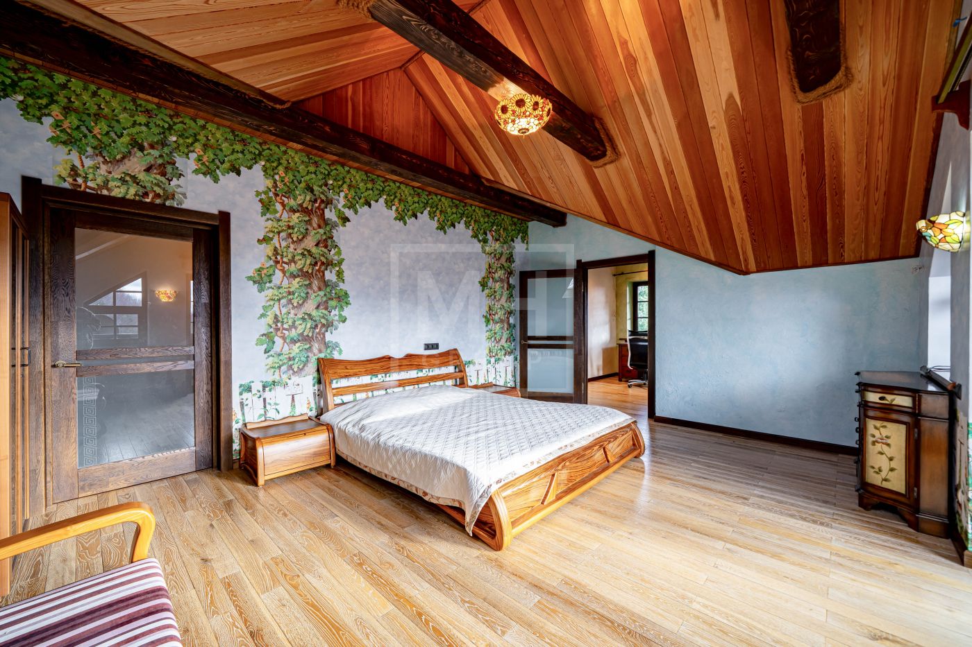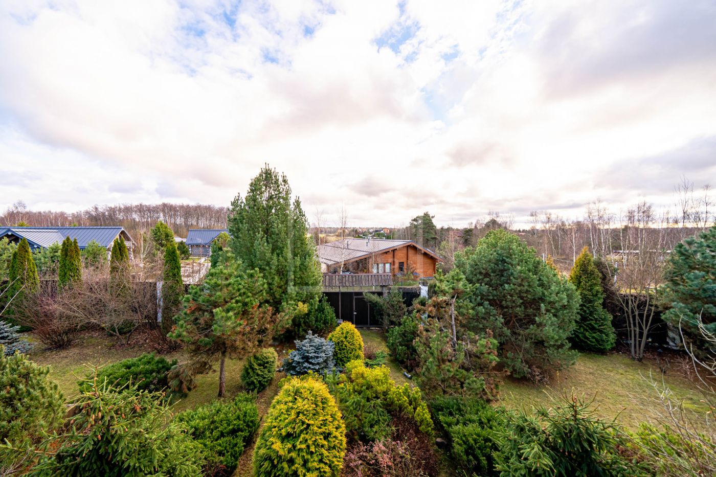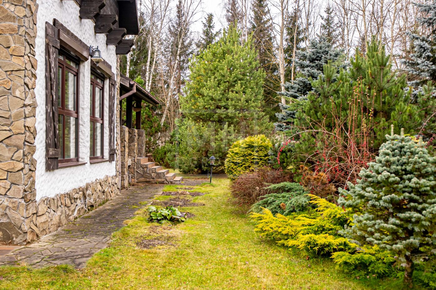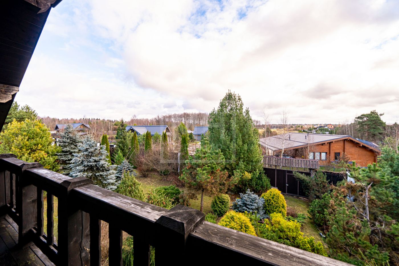 Загородный дом в стиле шале расположен в тихом месте на живописном лесном участке в охраняемом посёлке. На участке правильной формы также расположен гараж на два автомобиля с квартирой для гостей или для персонала. В оформлении ландшафта использованы преимущественно хвойные деревья и кустарники, благодаря этому участок прекрасен в любое время года.Планировки дома продуманные и комфортные. Просторные спальни наполнены светом, а пейзажи, открывающиеся из окон дома, завораживают