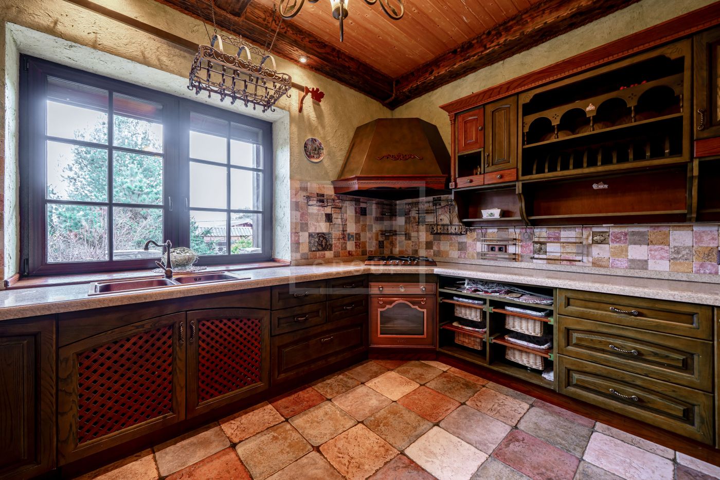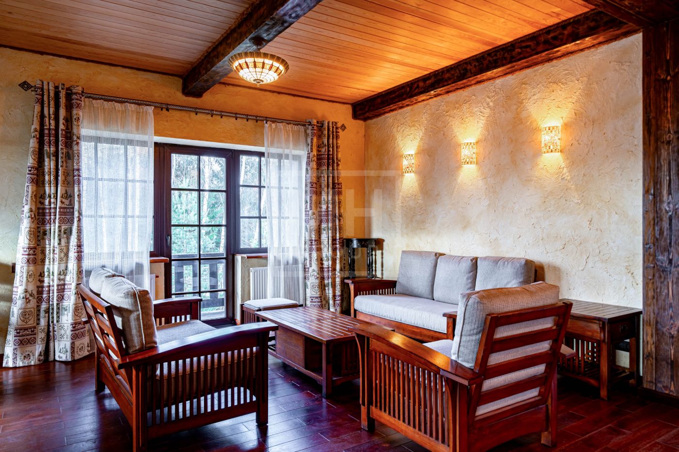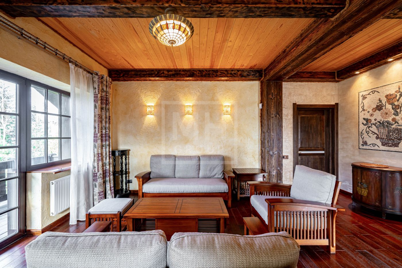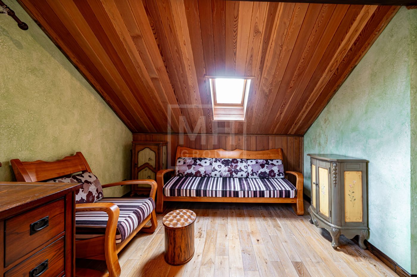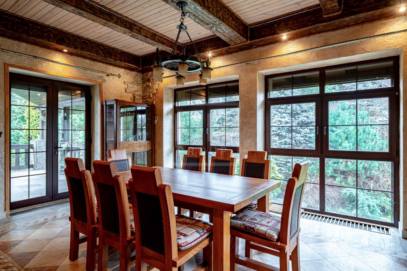Загородный дом в стиле шале расположен в тихом месте на живописном лесном участке в охраняемом посёлке. На участке правильной формы также расположен гараж на два автомобиля с квартирой для гостей или для персонала. В оформлении ландшафта использованы преимущественно хвойные деревья и кустарники, благодаря этому участок прекрасен в любое время года.Планировки дома продуманные и комфортные. Просторные спальни наполнены светом, а пейзажи, открывающиеся из окон дома, завораживают