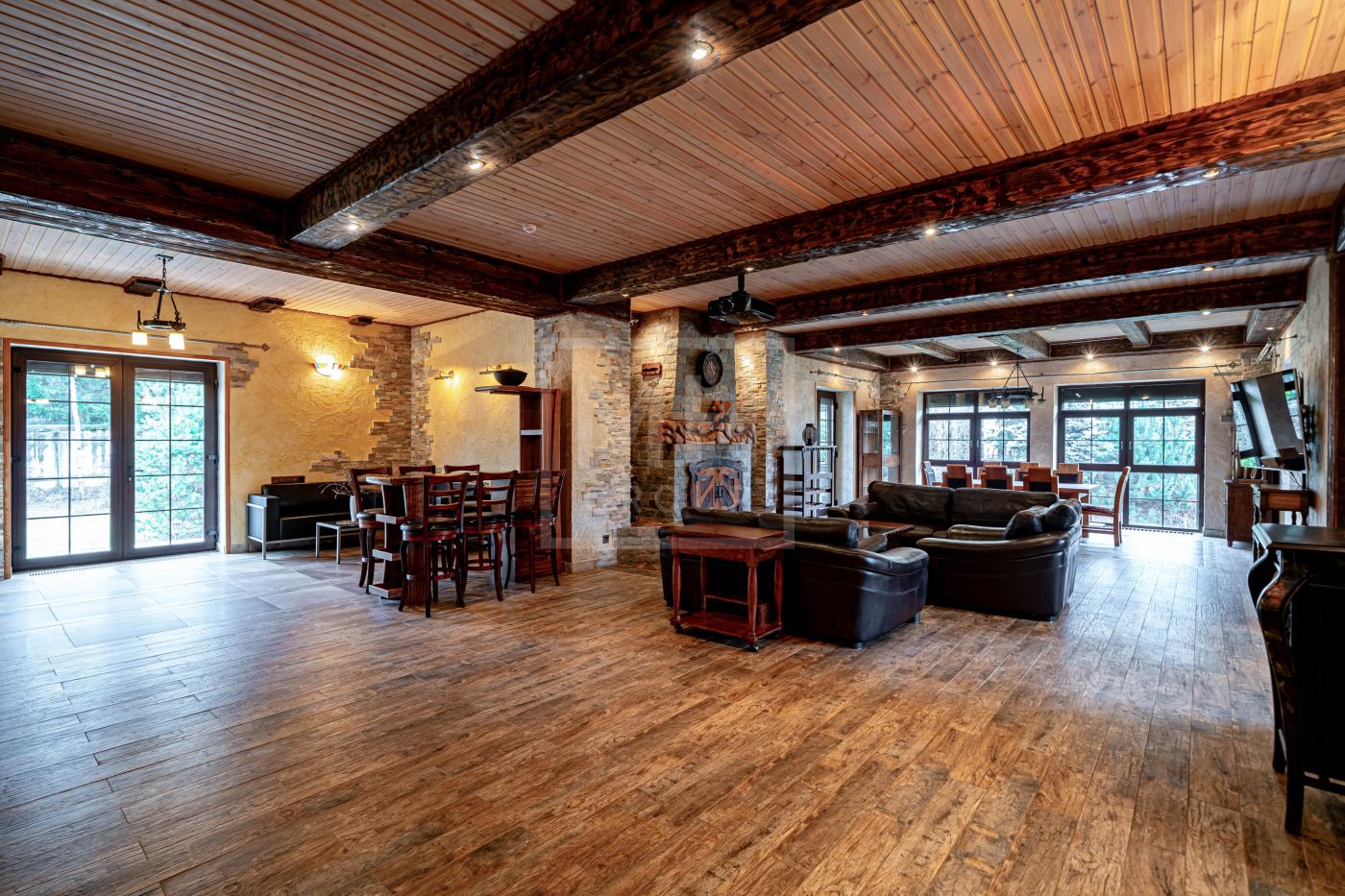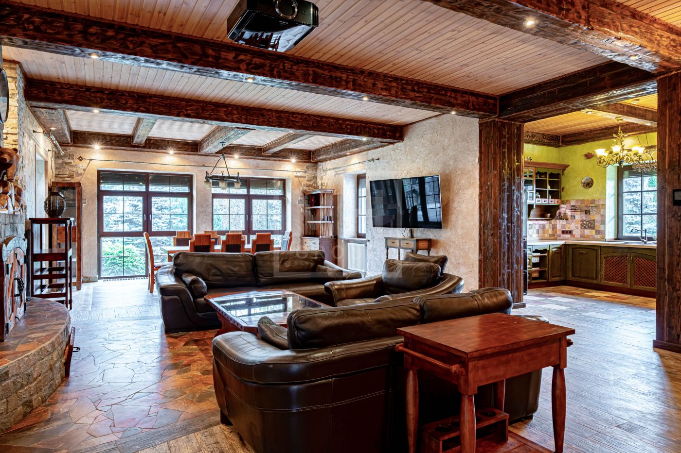 Этаж 1: прихожая, кабинет, спальня, с/у, кухня, гостиная с камином, столовая, зона отдыха