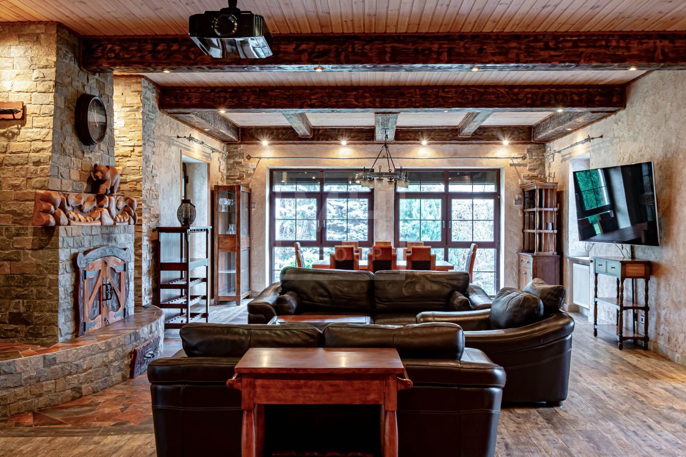 На каждом из этажей дома оборудованы общие пространства, это удобно в контексте одновременного проживания в доме семьи из нескольких поколений. Просторная гостиная с камином и комфортной диванной группой может стать точкой притяжения для всех членов семьи.