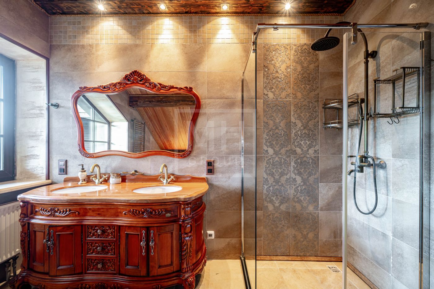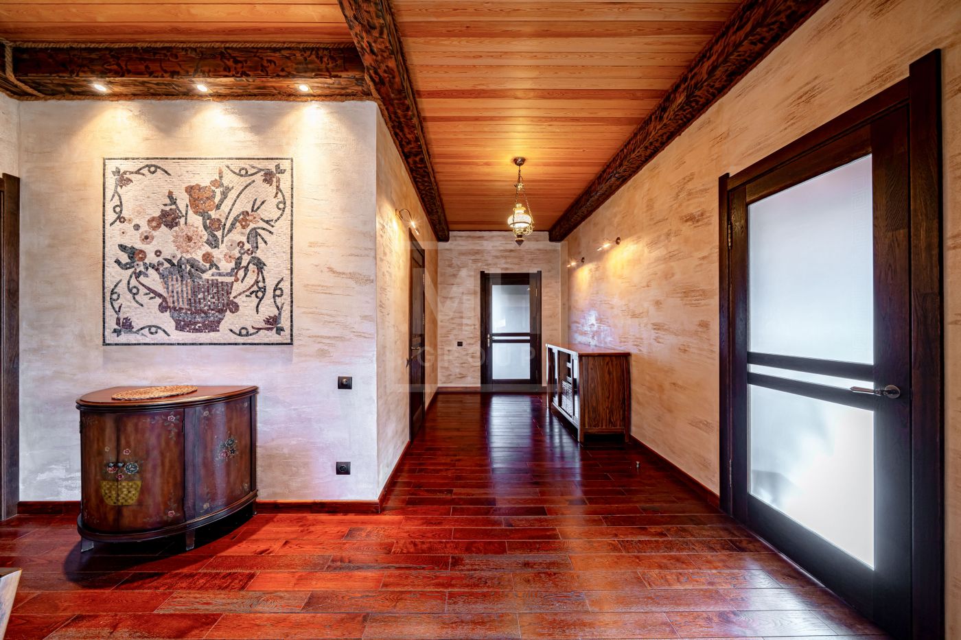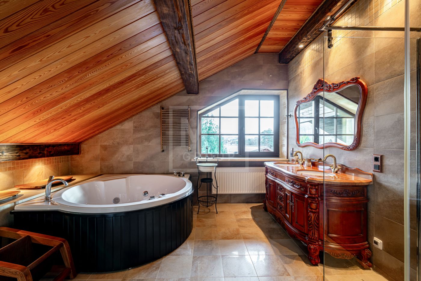 При строительстве использовались качественные экологичные материалы, дерево премиальных пород, натуральный камень. Дом укомплектован мебелью европейских брендов, премиальной сантехникой и бытовой техникой.