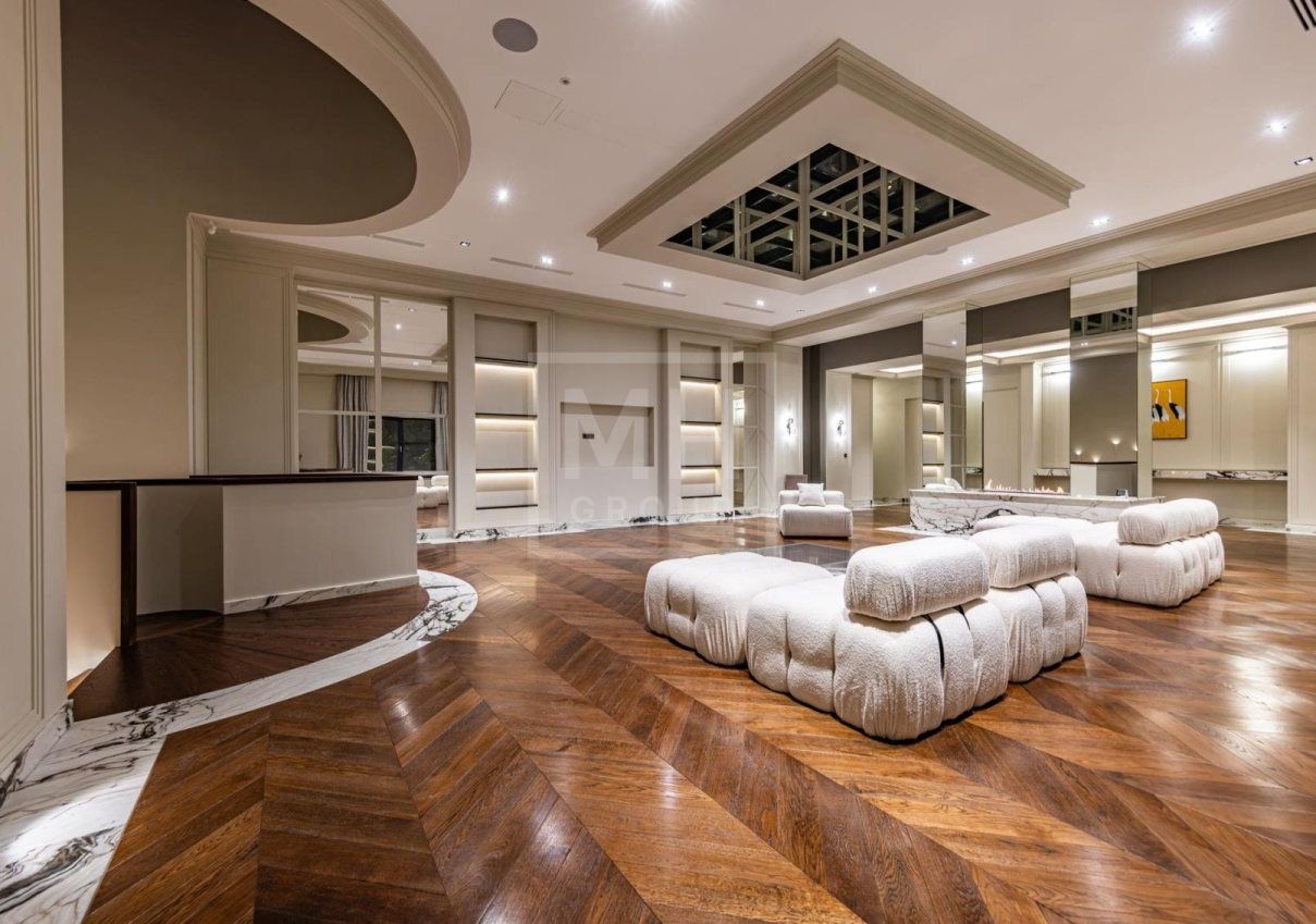 Цоколь: зона отдыха, кинотеатр, винная комната, салон красоты, большая гардеробная, техническая кухня, гараж на 7 автомобилей, зона проживания персонала, подсобные помещения