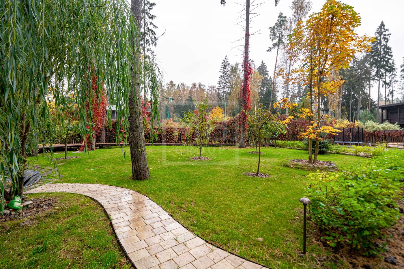 На участке — искусственный водоём, зона барбекю, взрослые деревья и природный сосновый массив.