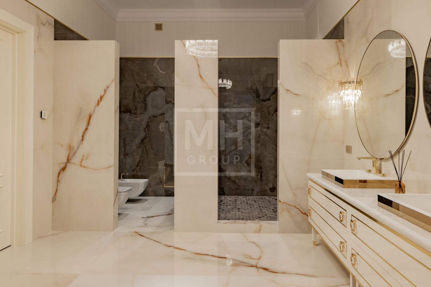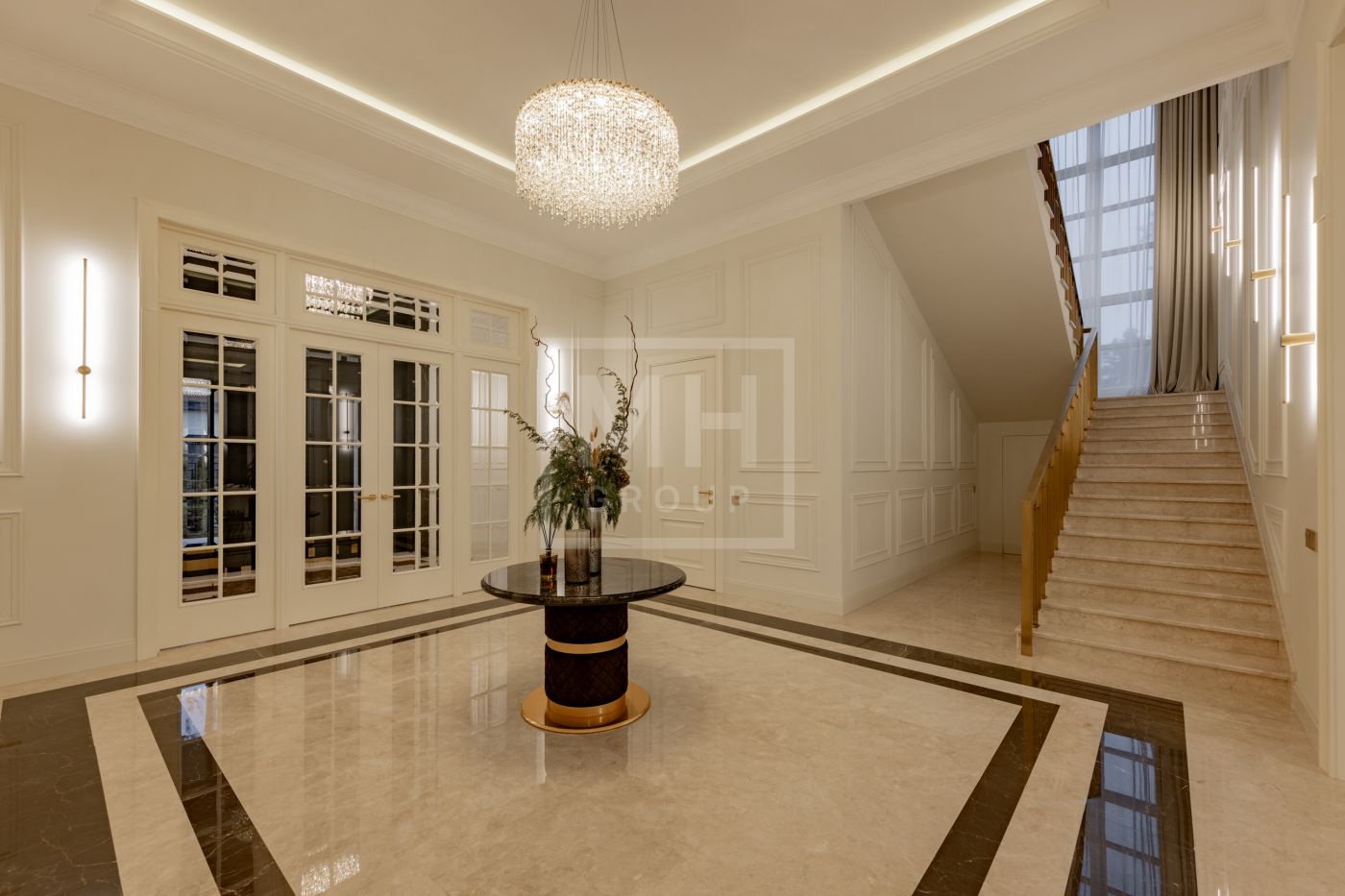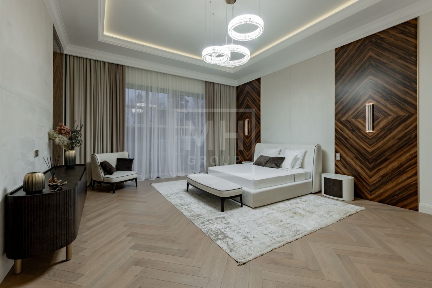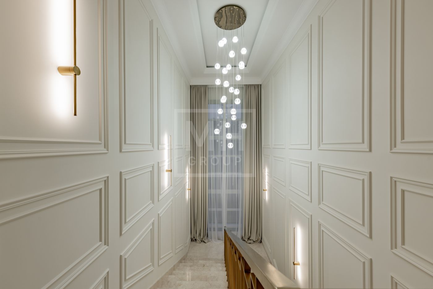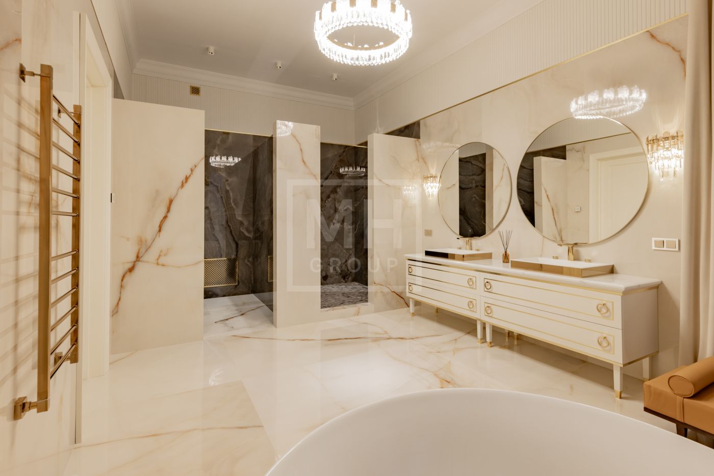 Дом представляет собой великолепный пример современной архитектуры с кирпичными стенами и монолитными перекрытиями. Фасады выполнены из натурального камня, а деревянные панорамные окна из лиственницы добавляют интерьеру естественного света и уюта.В отделке использованы высококачественные материалы, в частности, итальянский керамогранит, натуральный мрамор, а также представлена премиальная сантехника из Италии и Германии. Функционально удобная планировка, просторные помещения и панорамное остекление расширяют пространство и предусматривают комфортное проживание для большой семьи.