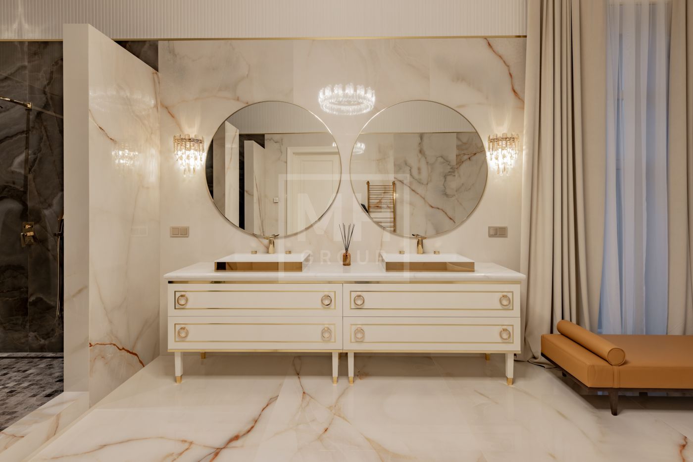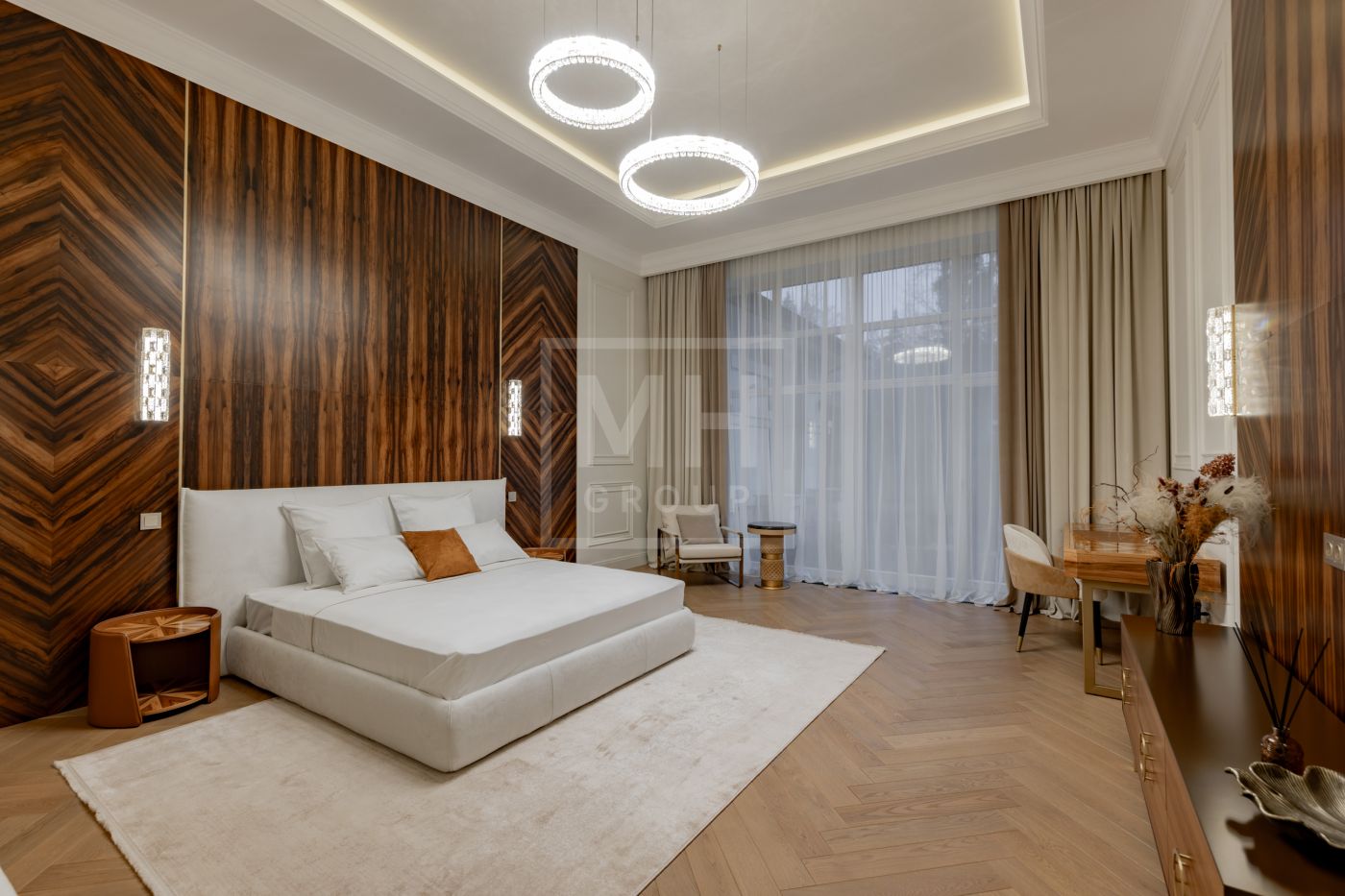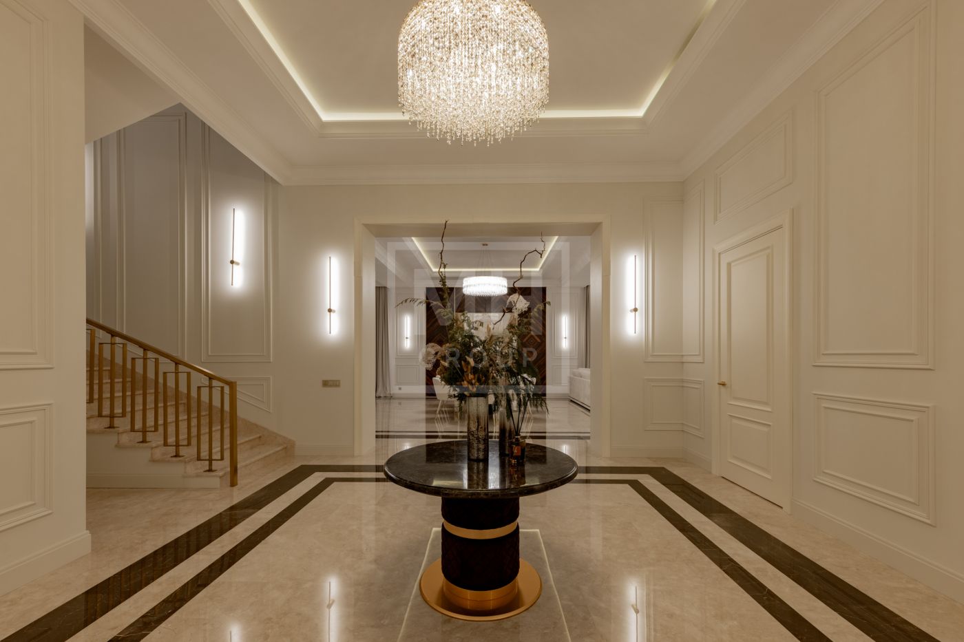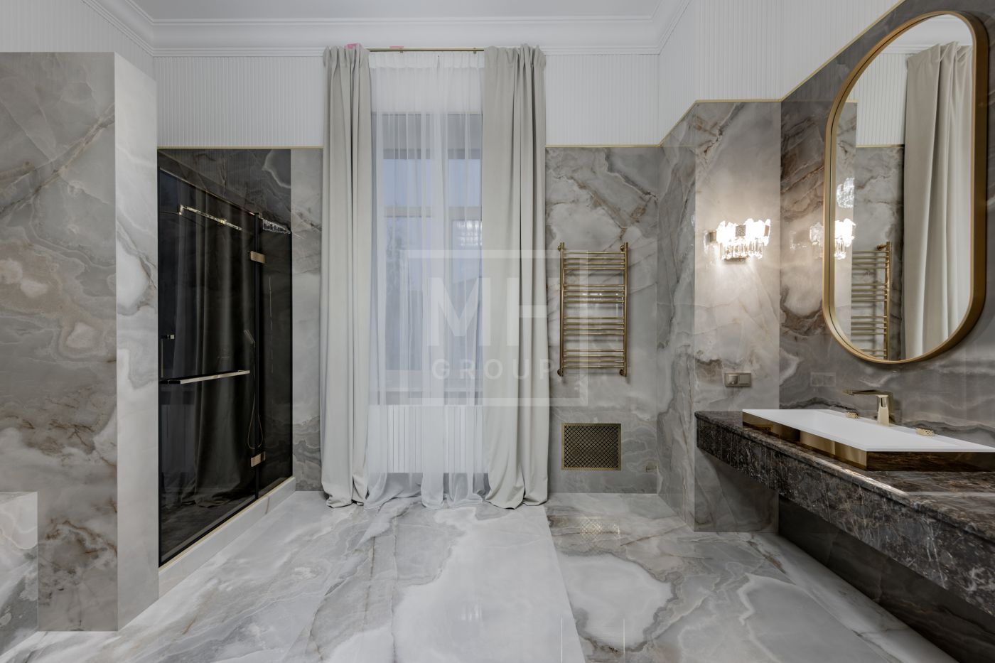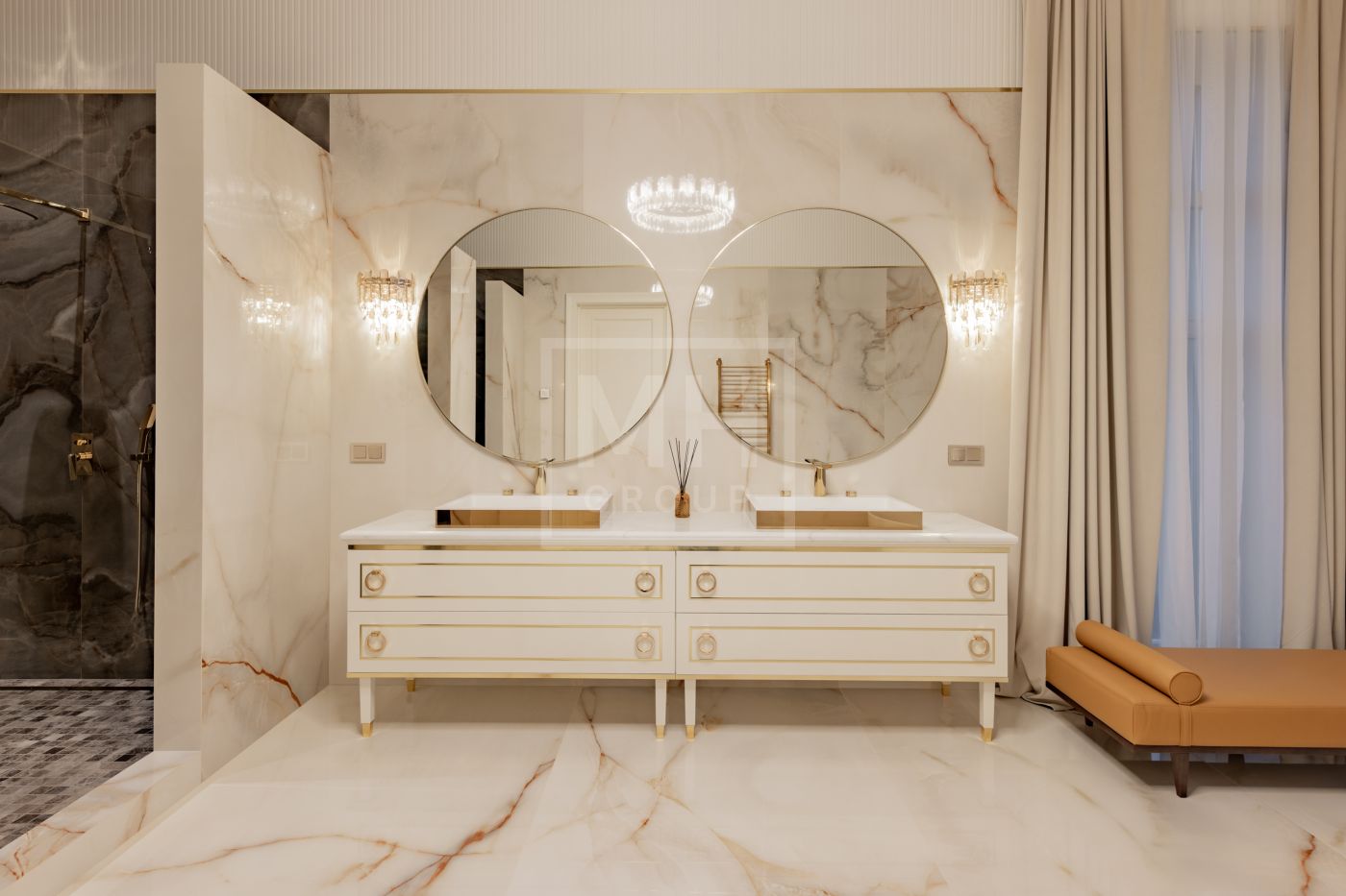 Дом представляет собой великолепный пример современной архитектуры с кирпичными стенами и монолитными перекрытиями. Фасады выполнены из натурального камня, а деревянные панорамные окна из лиственницы добавляют интерьеру естественного света и уюта.В отделке использованы высококачественные материалы, в частности, итальянский керамогранит, натуральный мрамор, а также представлена премиальная сантехника из Италии и Германии. Функционально удобная планировка, просторные помещения и панорамное остекление расширяют пространство и предусматривают комфортное проживание для большой семьи.