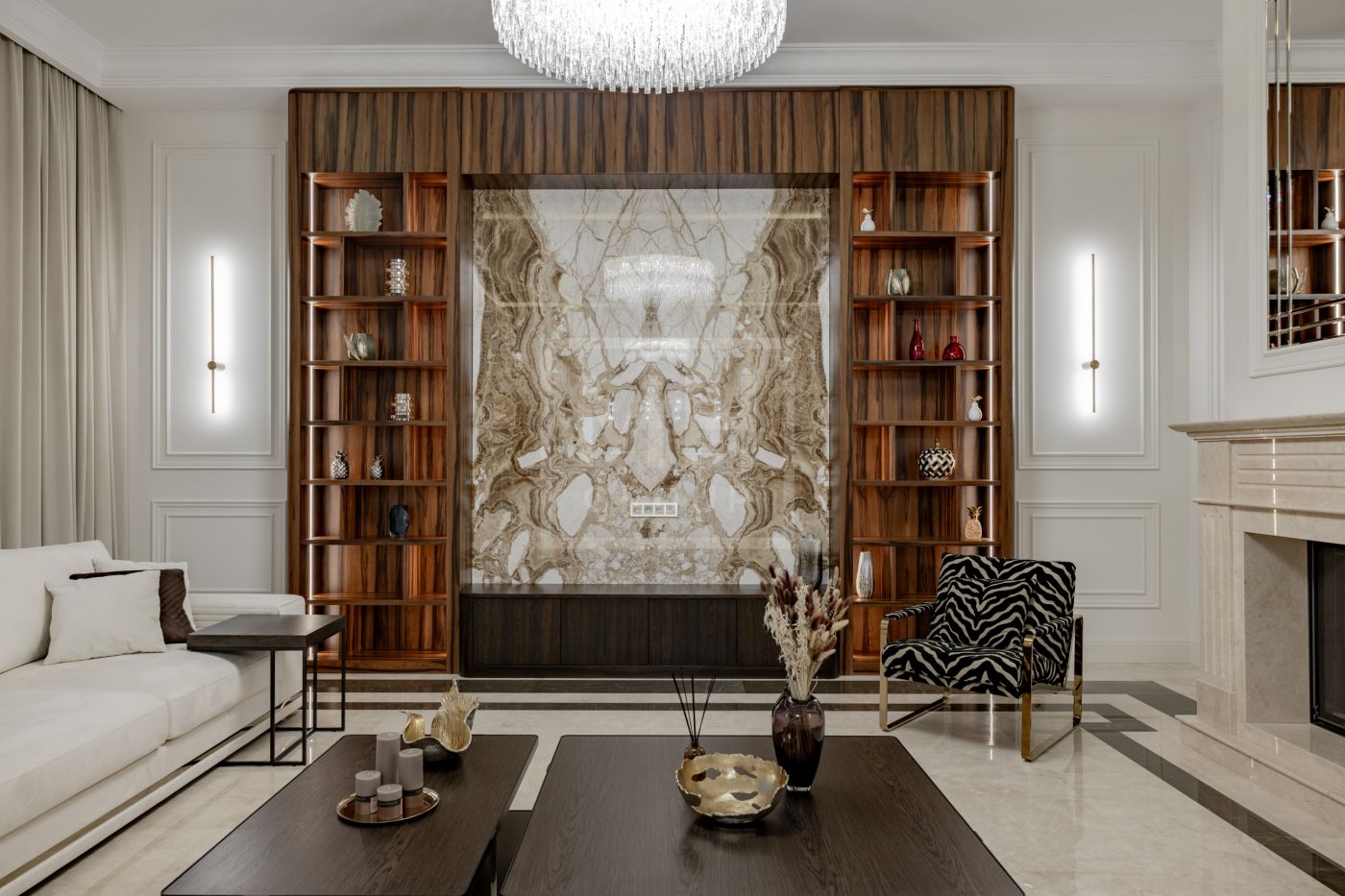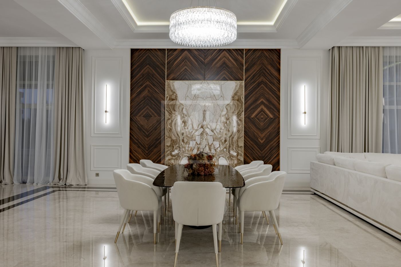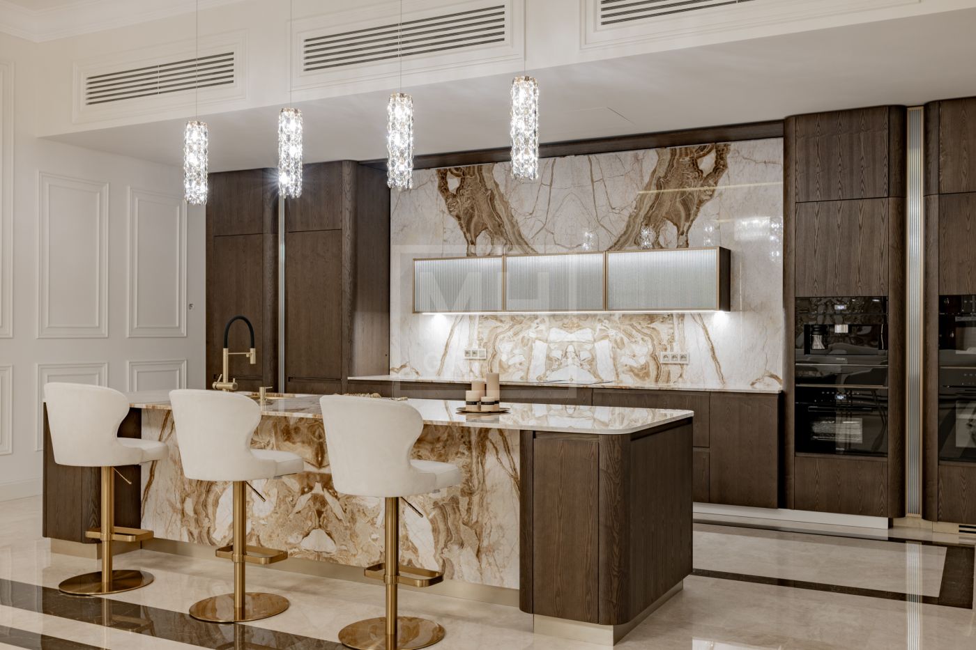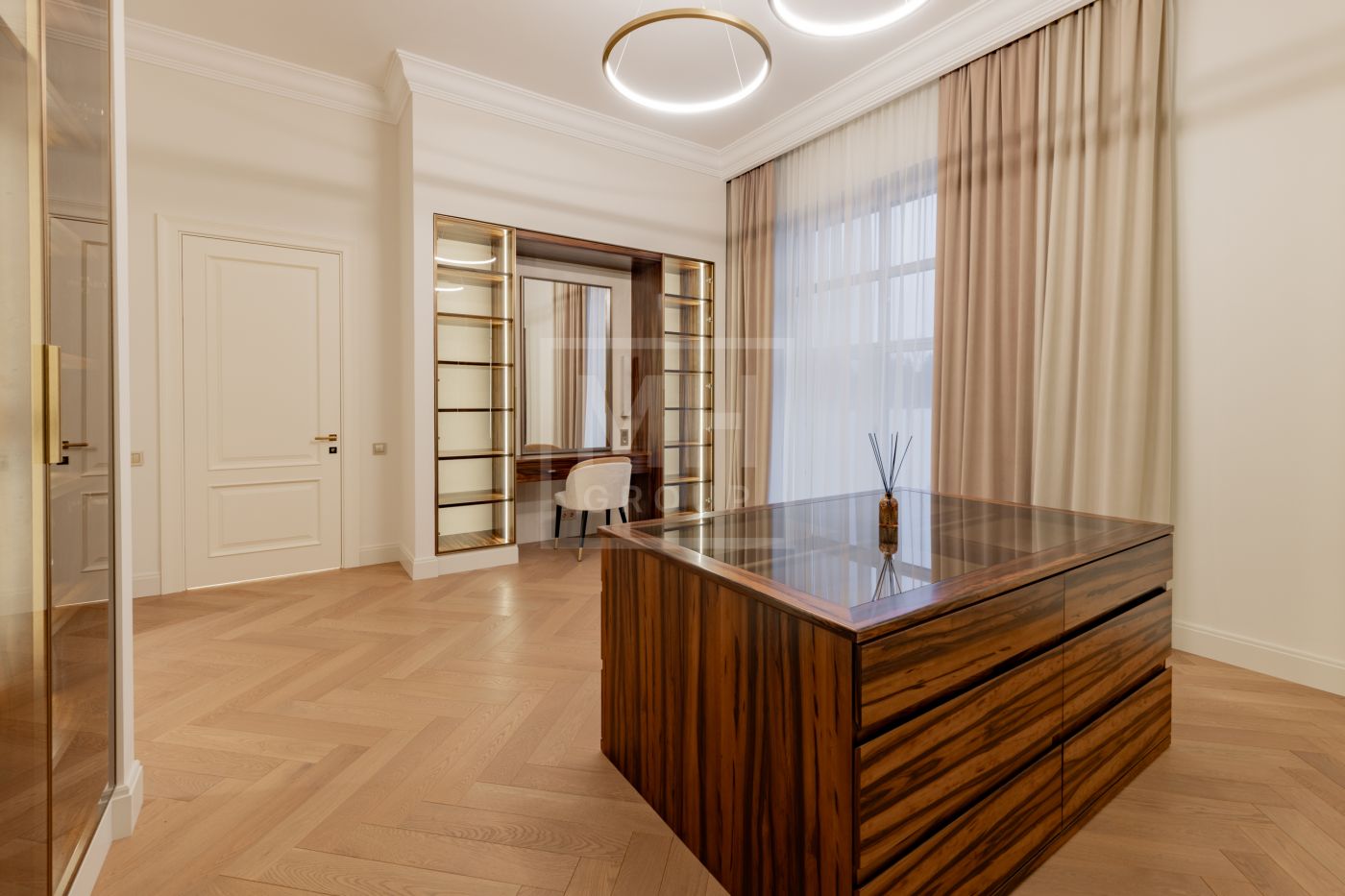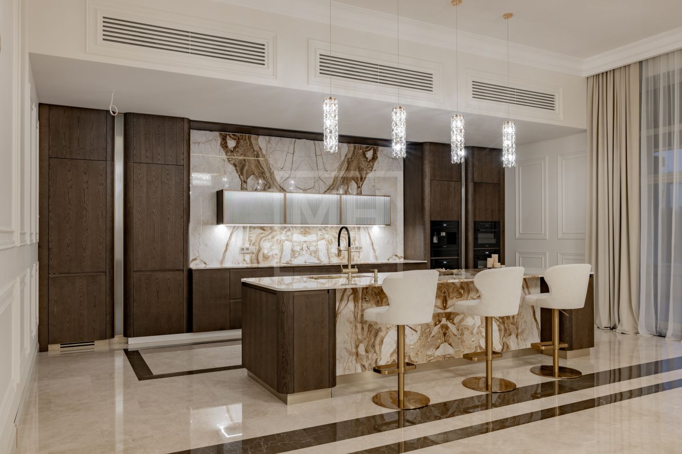 Дом представляет собой великолепный пример современной архитектуры с кирпичными стенами и монолитными перекрытиями. Фасады выполнены из натурального камня, а деревянные панорамные окна из лиственницы добавляют интерьеру естественного света и уюта.В отделке использованы высококачественные материалы, в частности, итальянский керамогранит, натуральный мрамор, а также представлена премиальная сантехника из Италии и Германии. Функционально удобная планировка, просторные помещения и панорамное остекление расширяют пространство и предусматривают комфортное проживание для большой семьи.