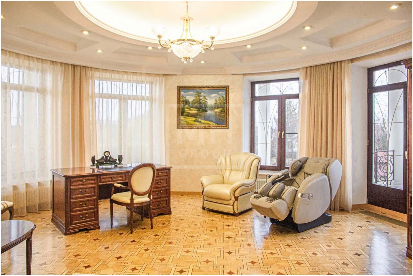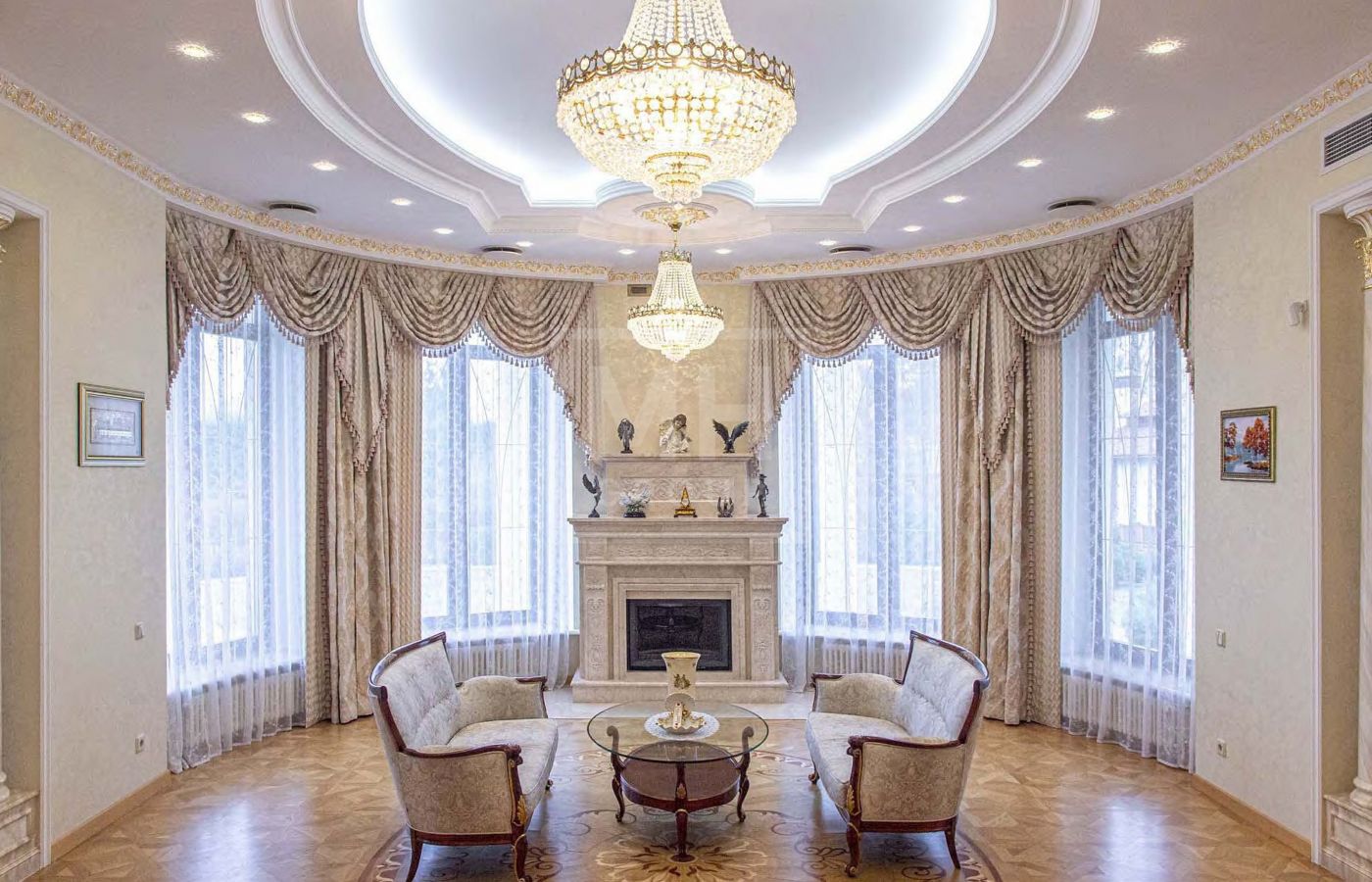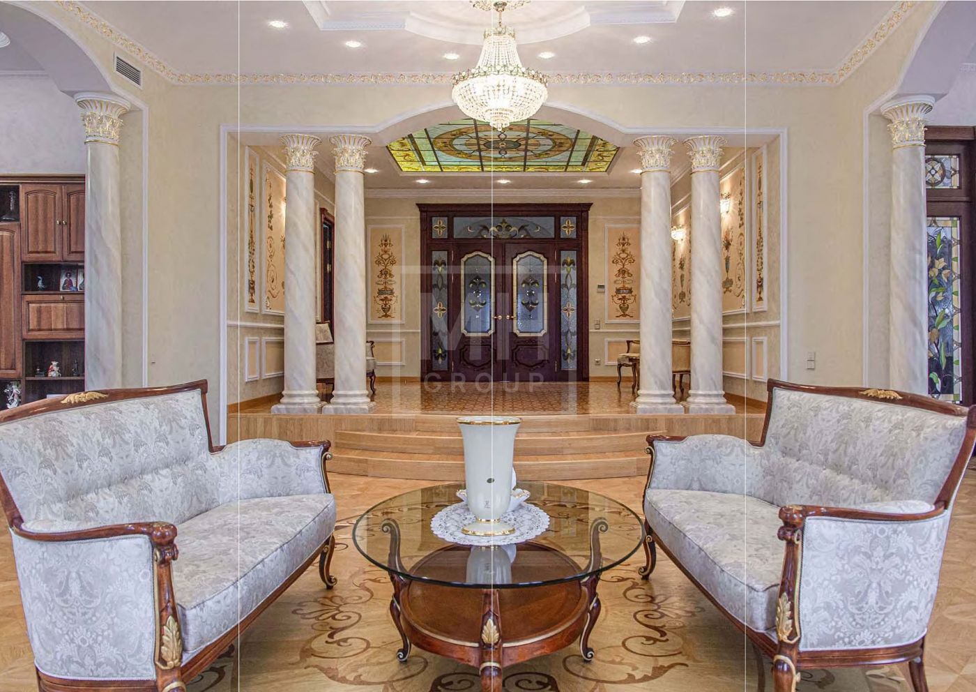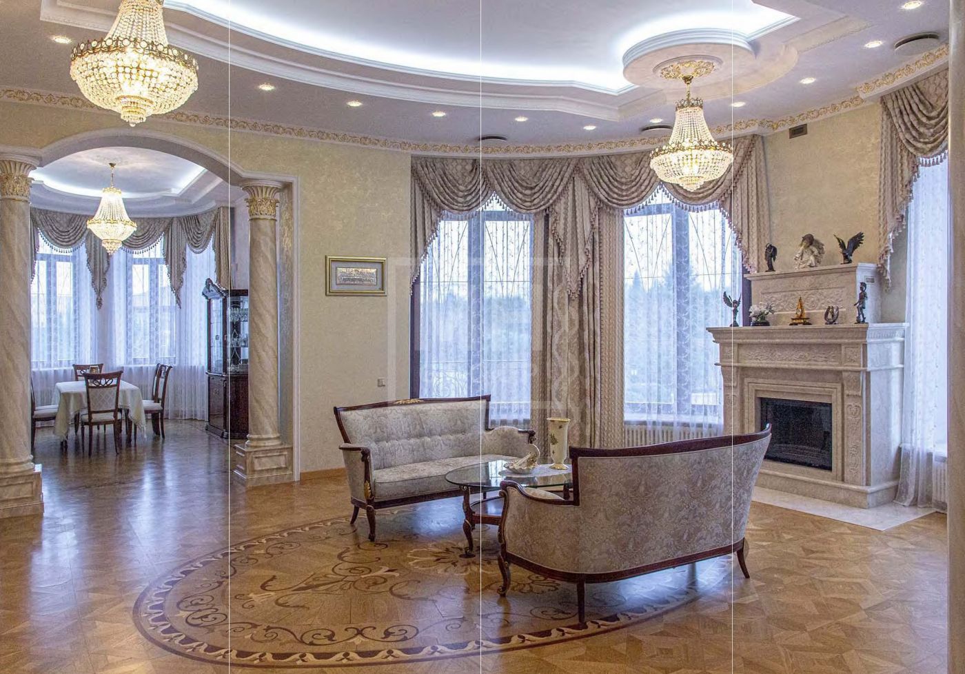 В отделке использованы дорогостоящие отделочные материалы из Италии, натуральный камень, ценные породы древесины, художественный паркет.