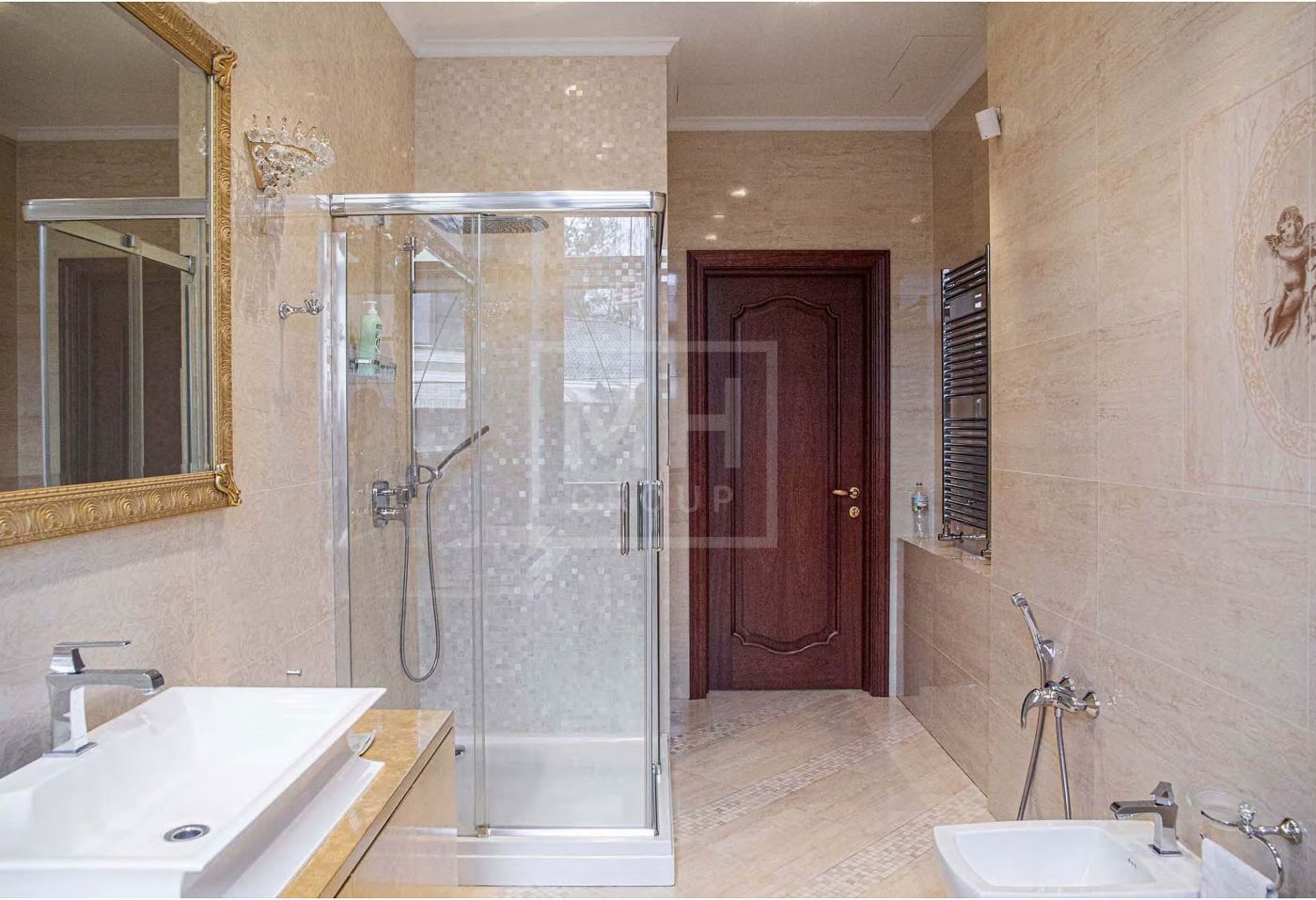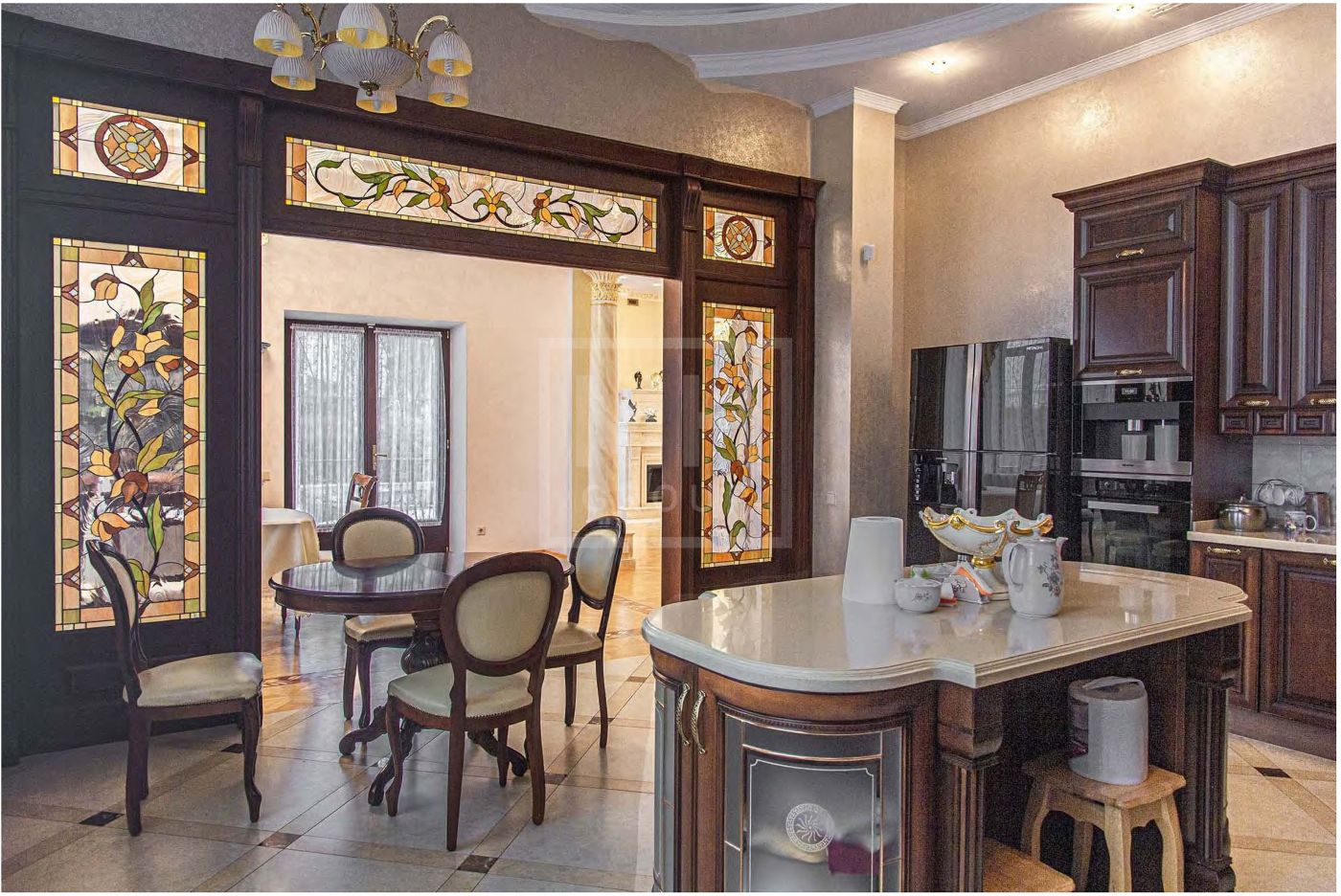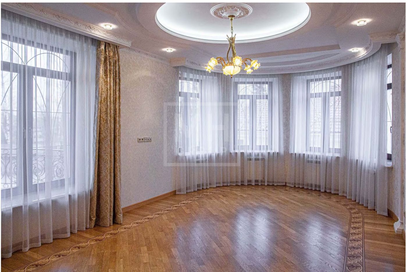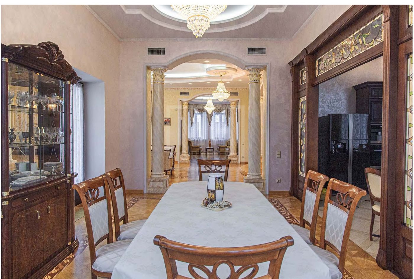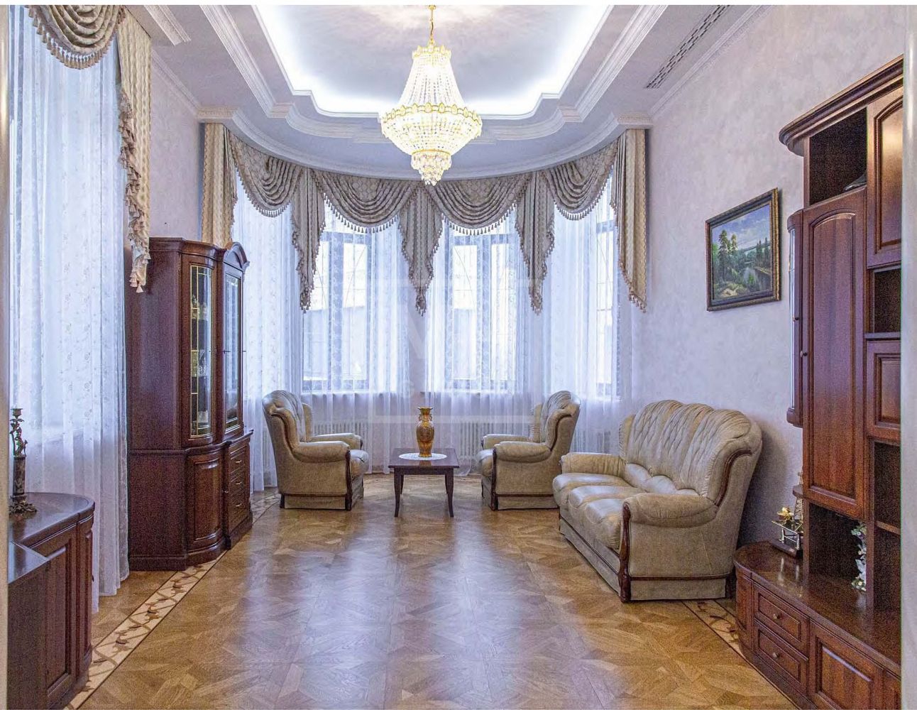 В отделке использованы дорогостоящие отделочные материалы из Италии, натуральный камень, ценные породы древесины, художественный паркет.