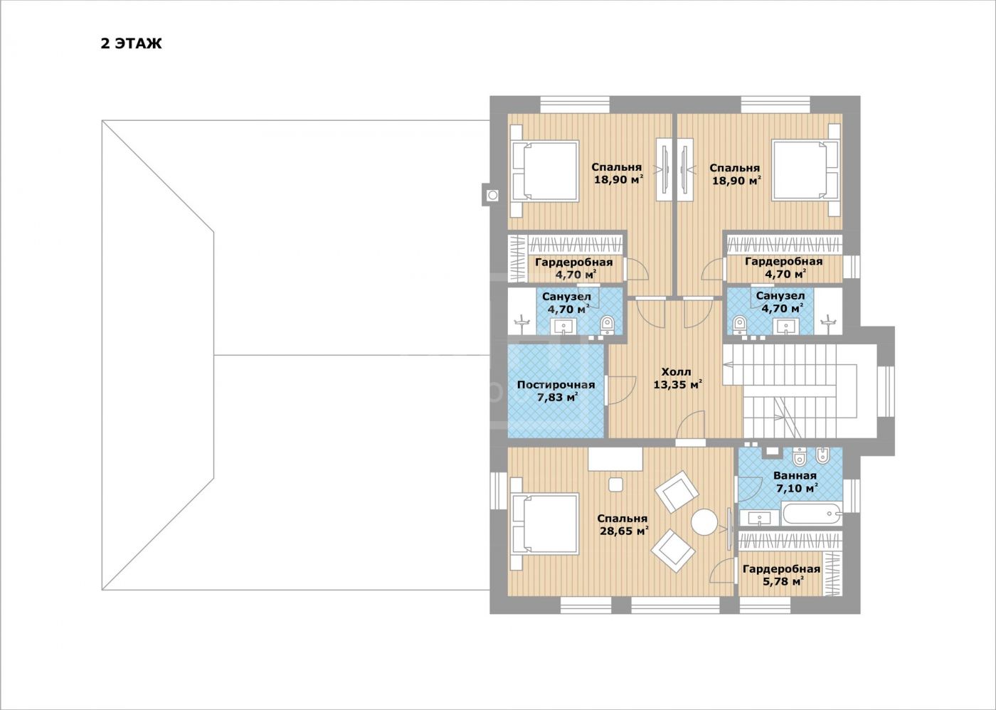 Этаж 2: холл,мастер-спальня с ванной и гардеробной,две комнаты , с ванными и гардеробными,постирочная