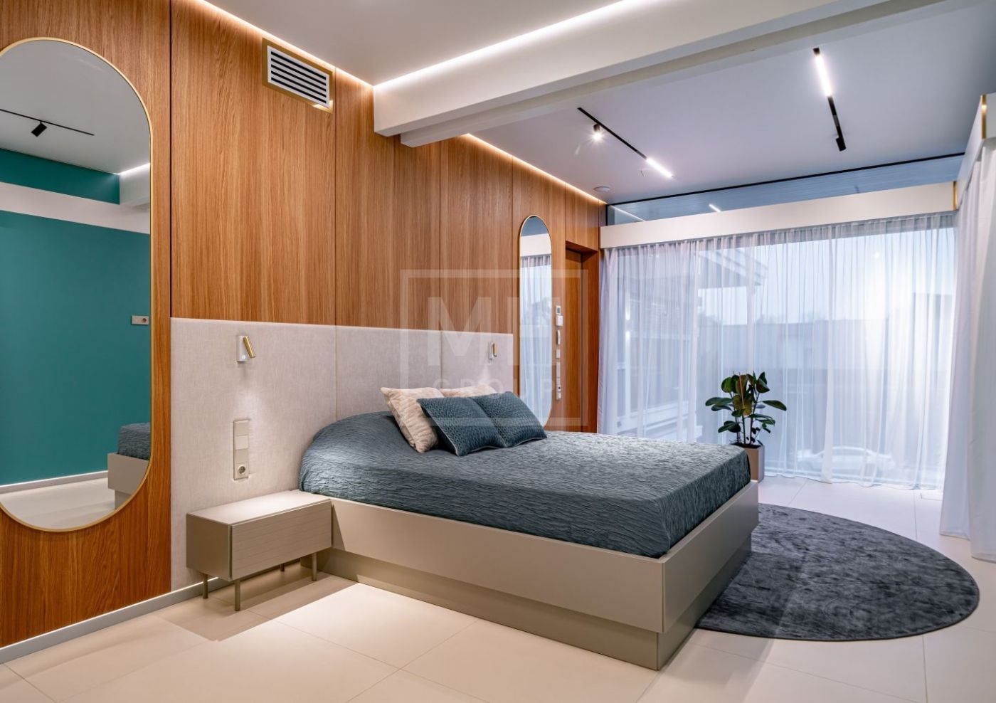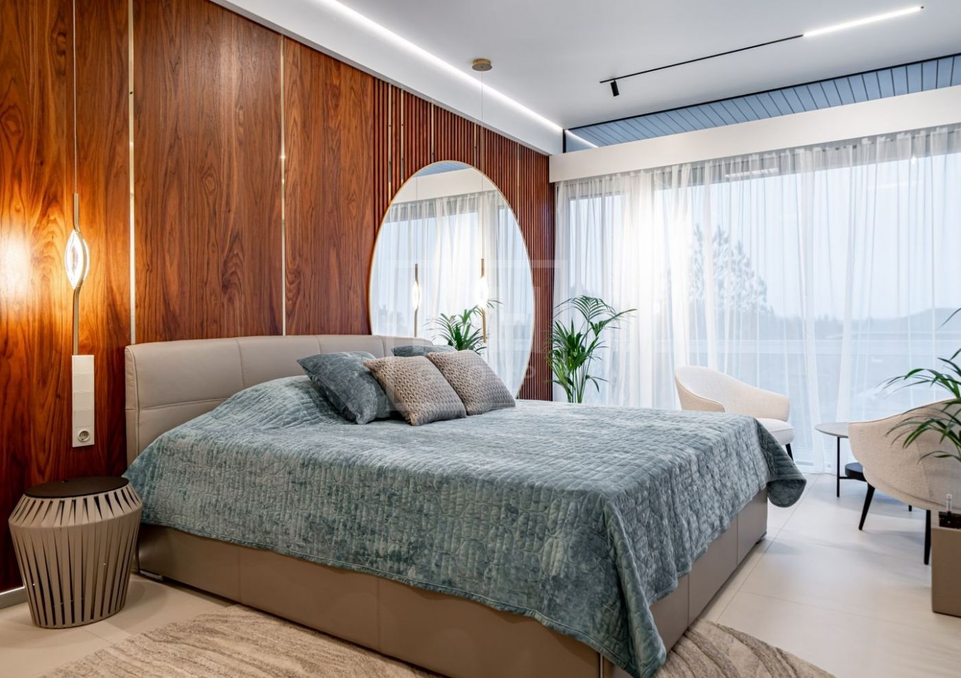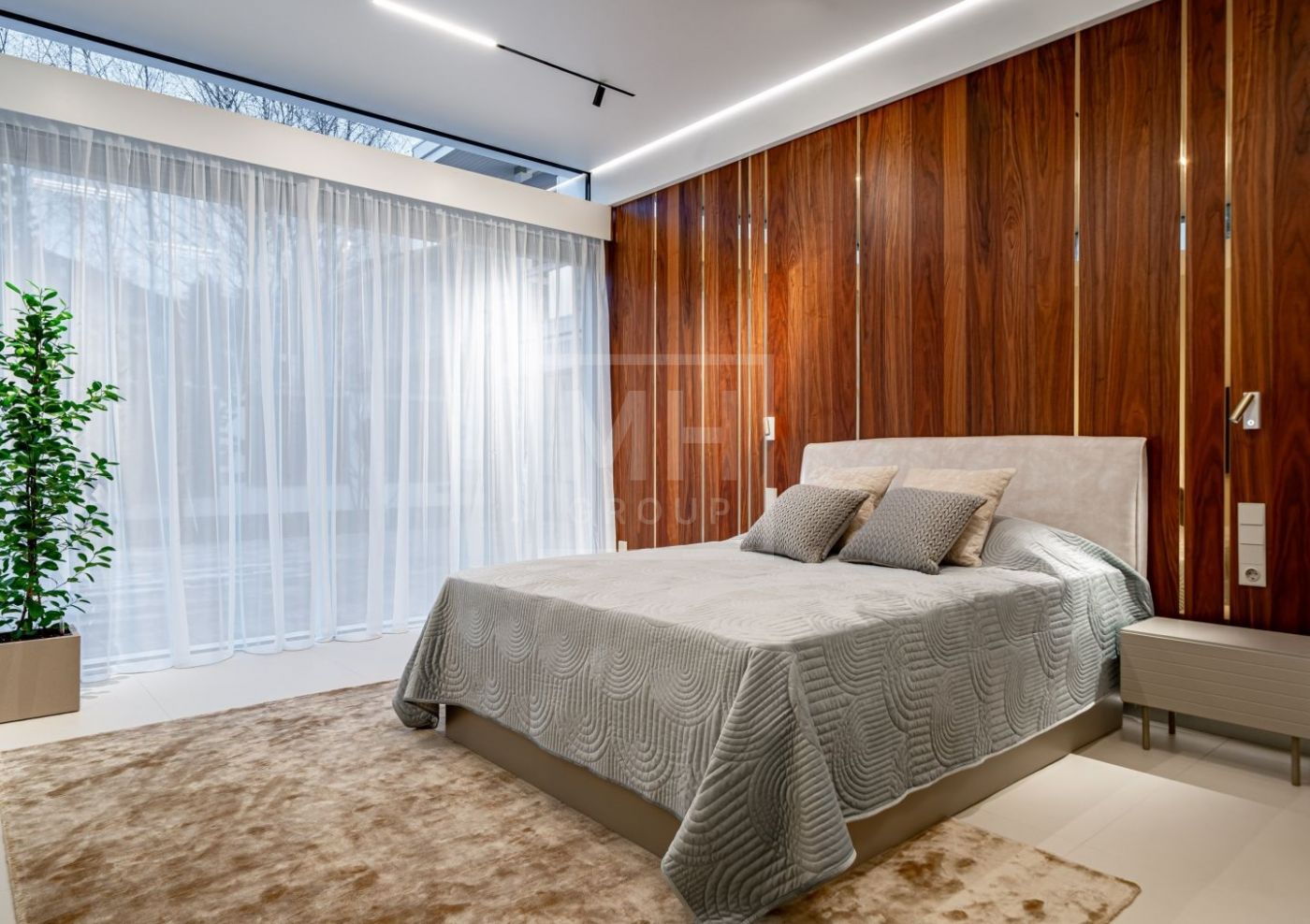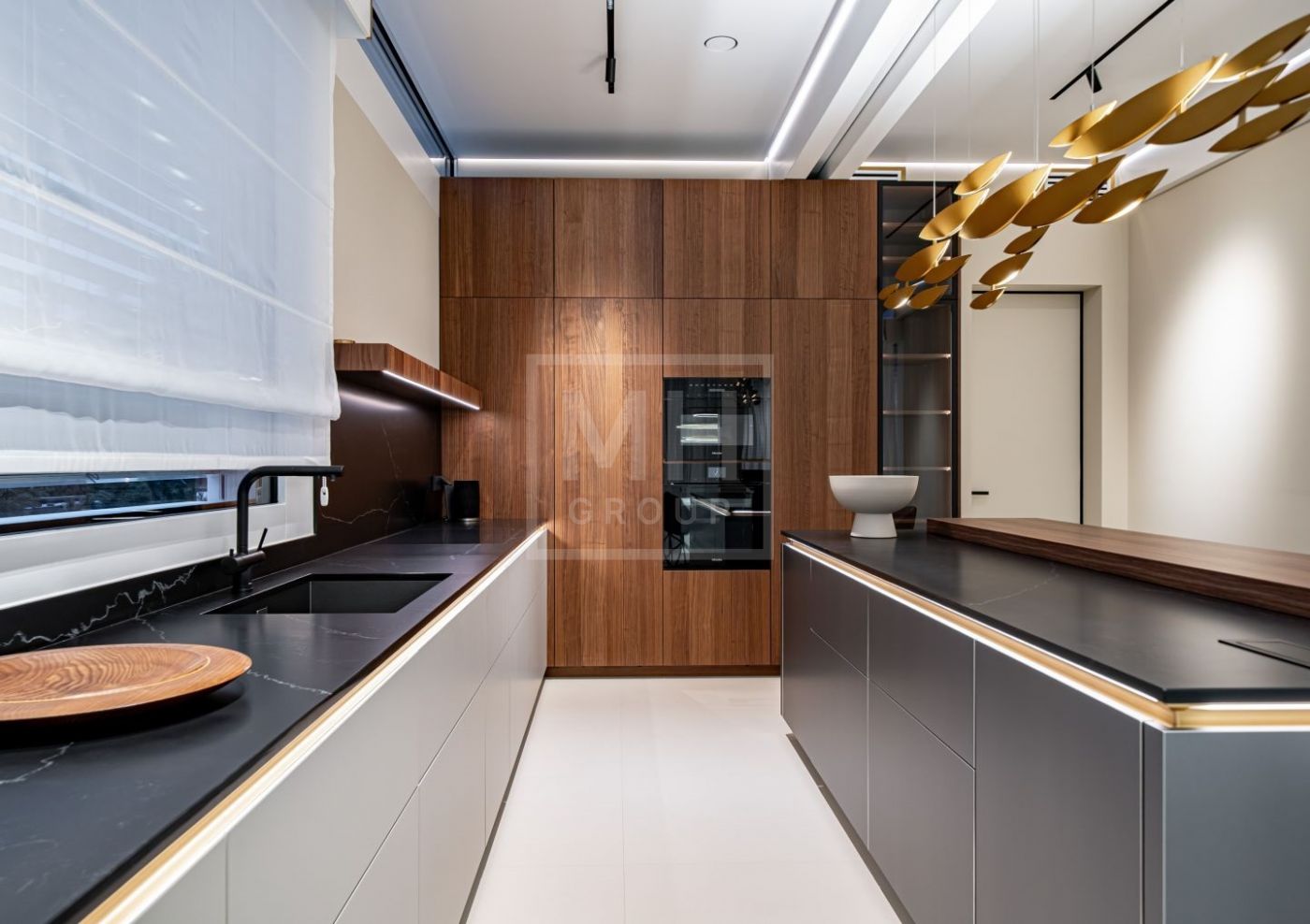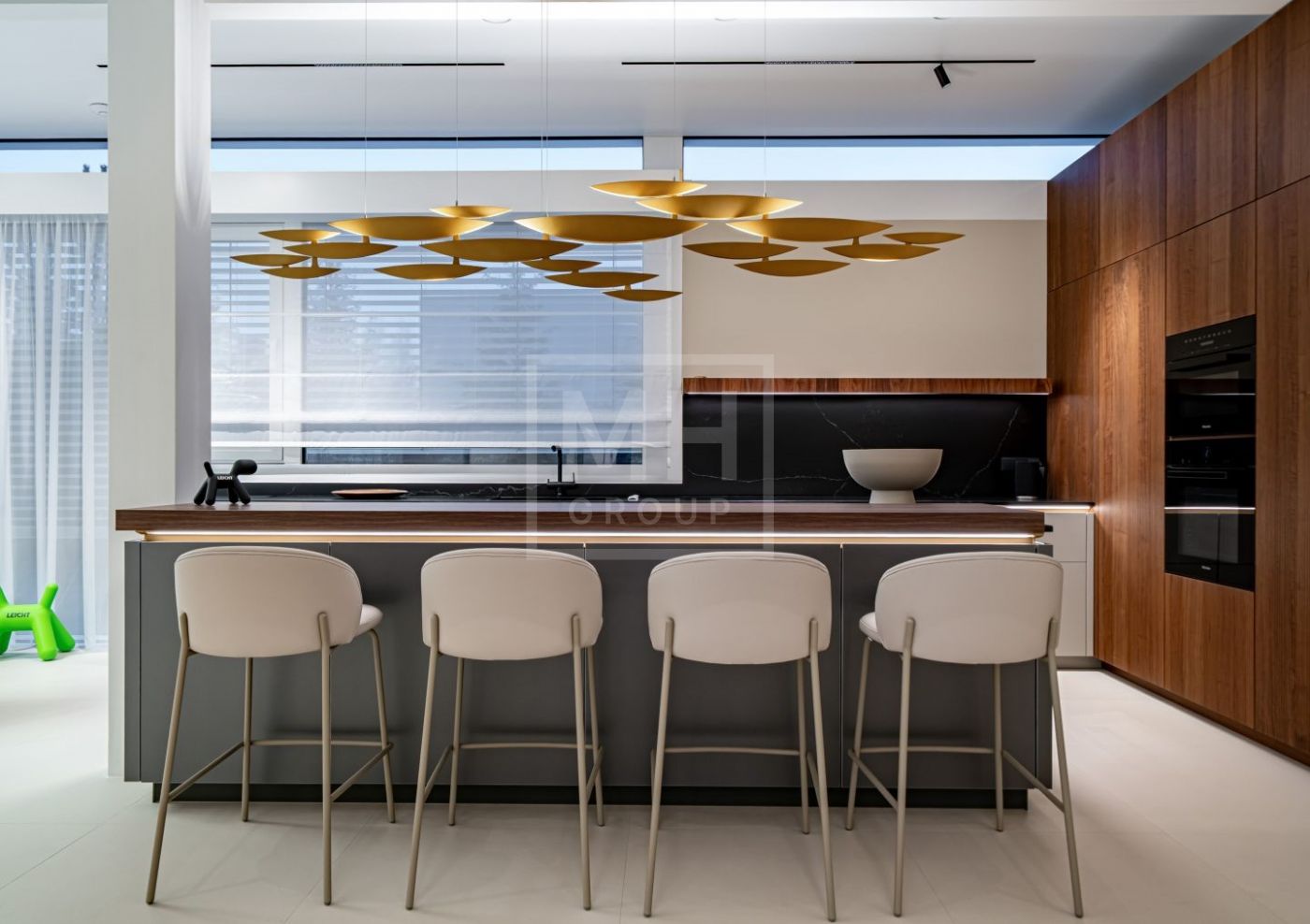 Внутренняя отделка выполнена из материалов высокого класса. Кухня оборудована мебелью немецкого бренда Leicht и укомплектована техникой Miele, включая винный шкаф и встроенную кофемашину;