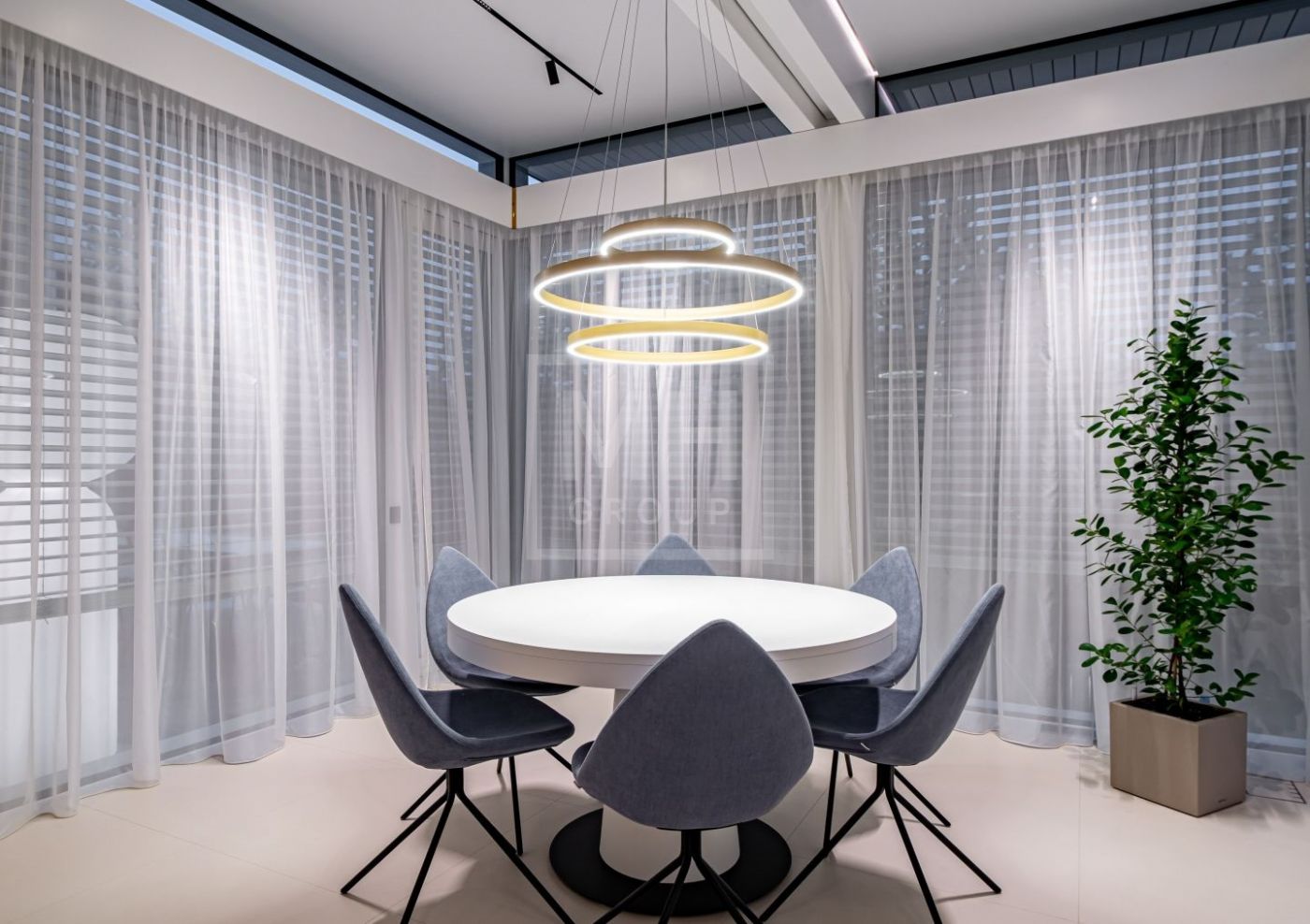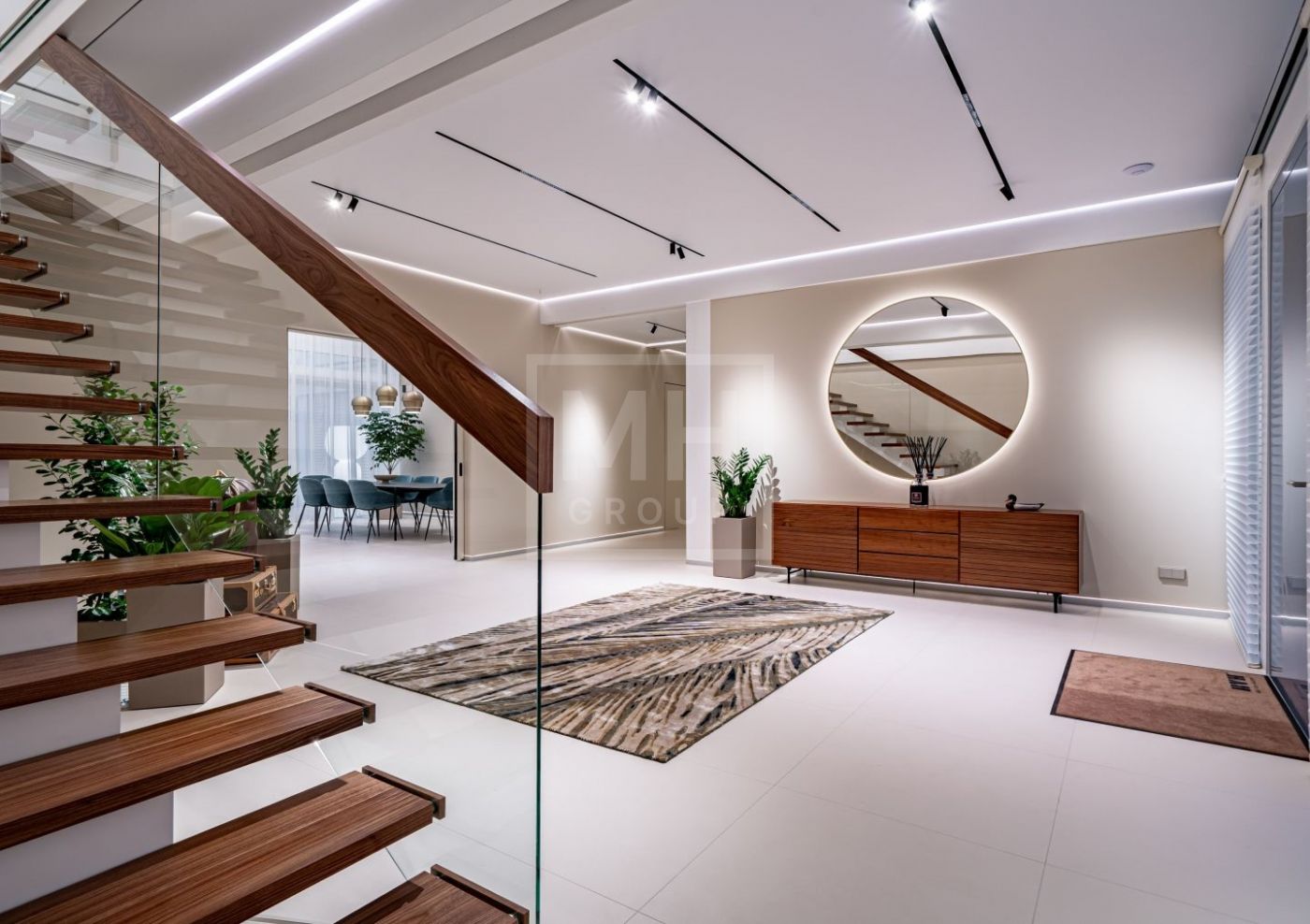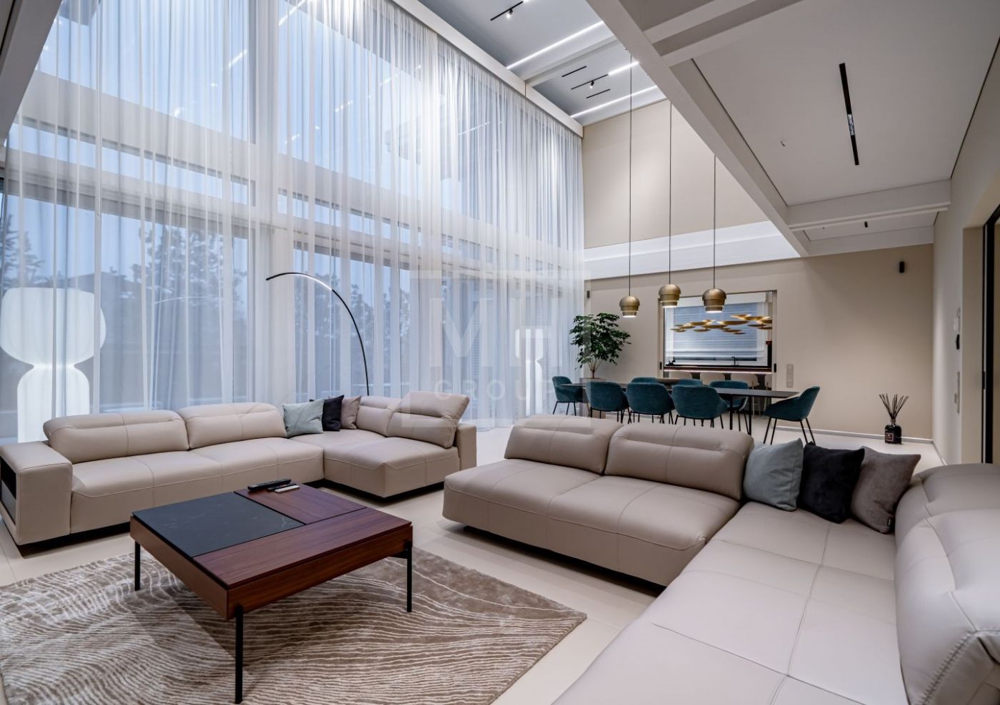Гостиная объединяет зону отдыха с большим диваном, столом на 12 персон, телевизором диагональю 105 дюймов и акустической системой Bose, формируя пространство для приёма гостей и семейного отдыха.
