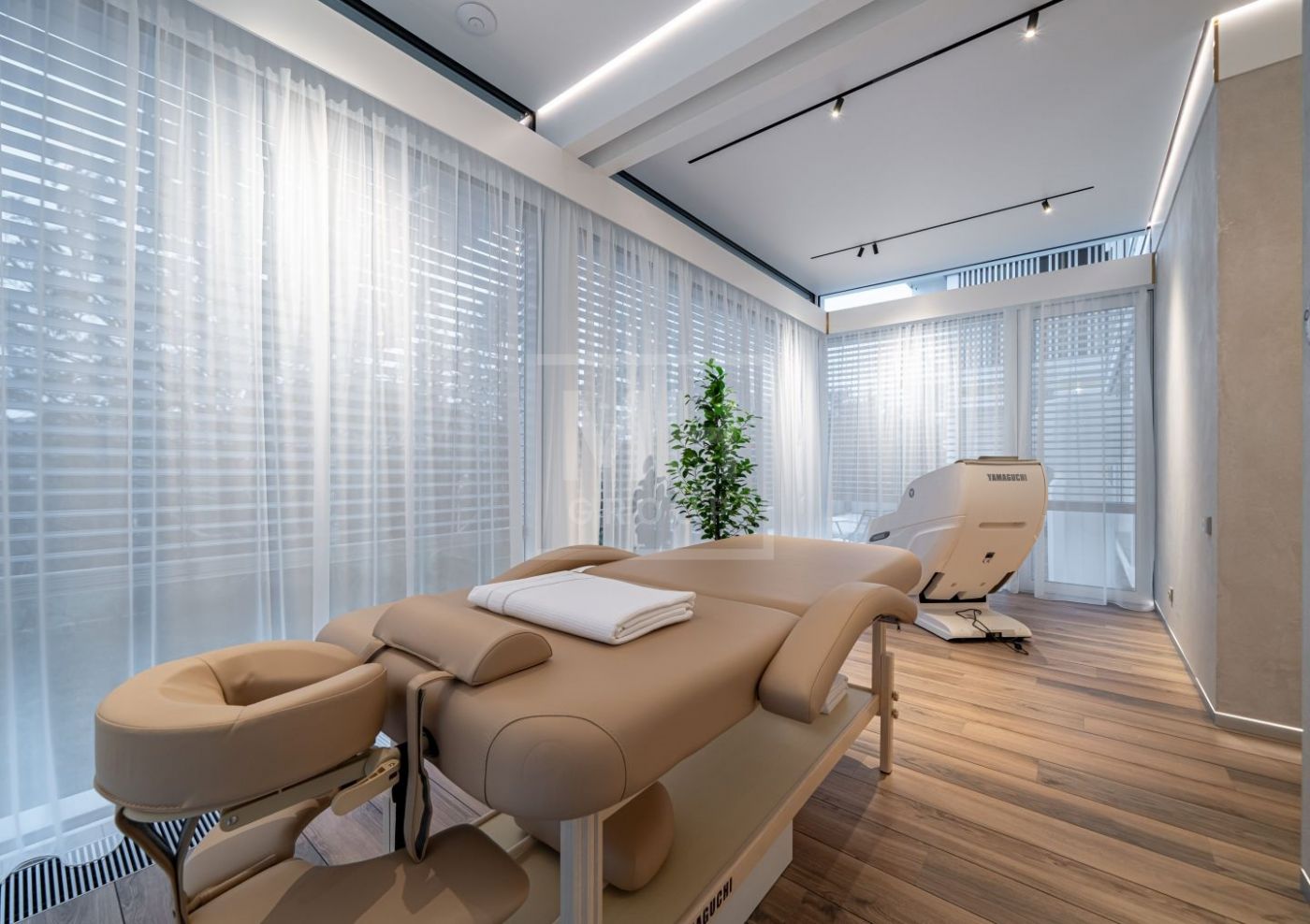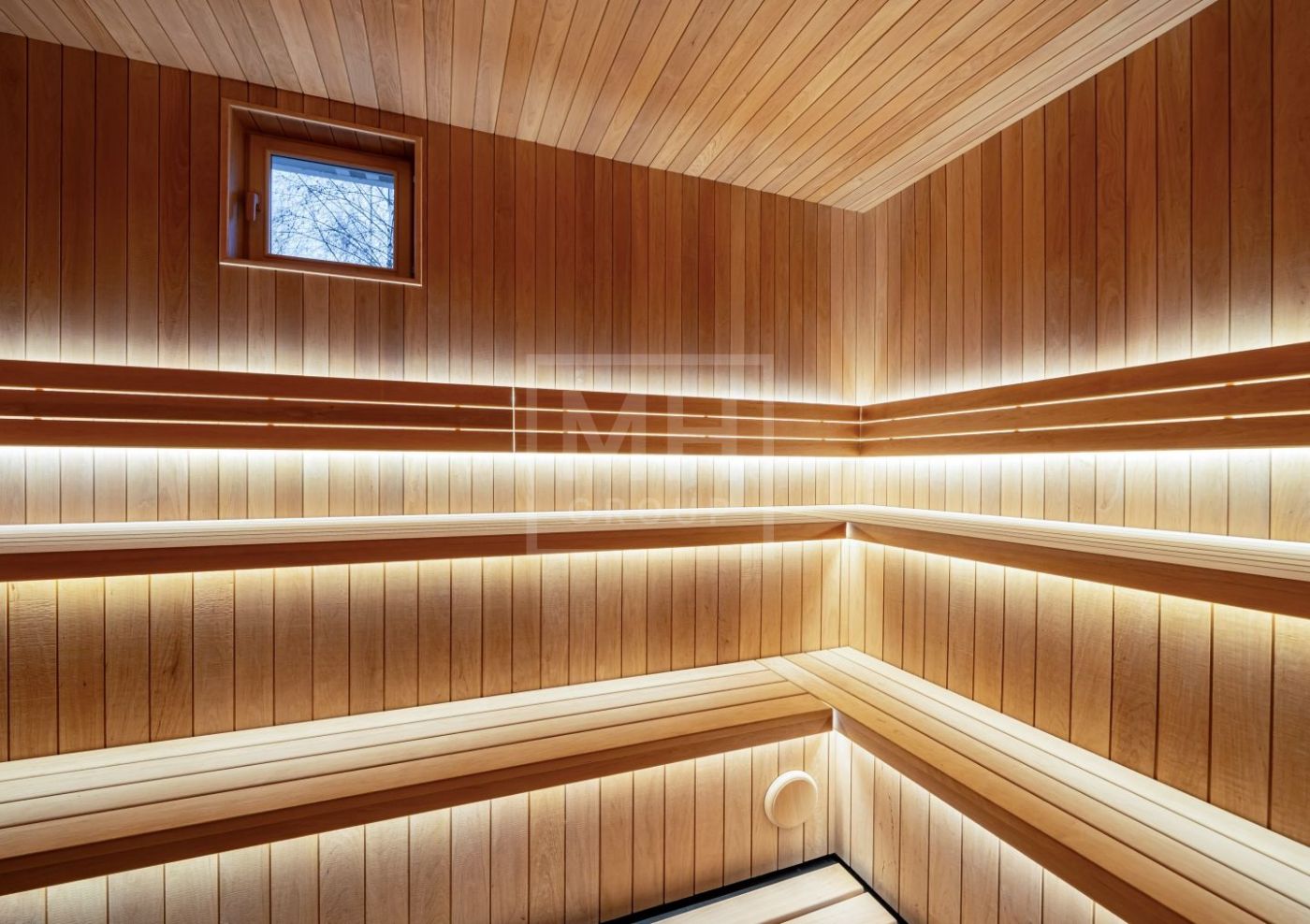 SPA-зона включает финскую сауну с дровяной печью Kastor, санузел с двумя душевыми и комнату отдыха с выходом на участок. Фитнес-зона интегрирована в пространство первого этажа и рассчитана на