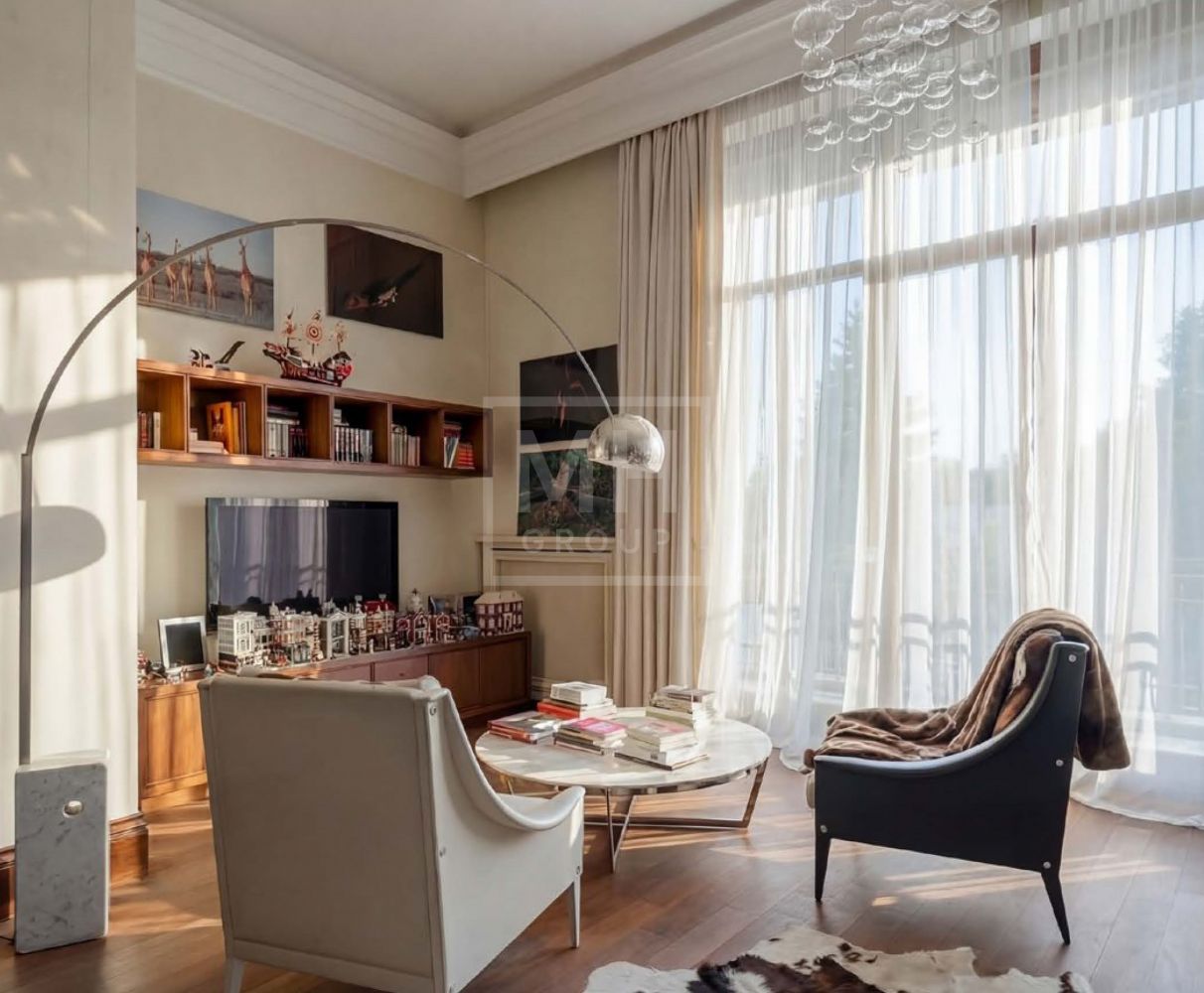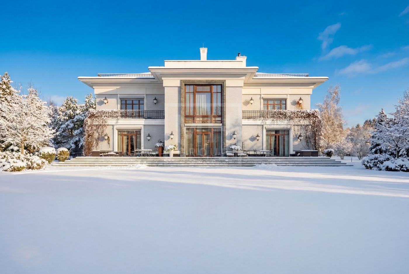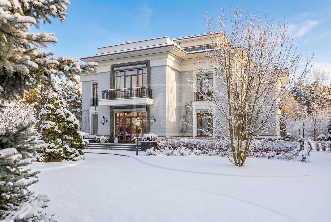 Загородная резиденция площадью 1675 м² расположена на участке 46 соток напротив Мещерского парка.Фасад здания в классическом стиле облицован серым кирпичом. Панорамные окна наполняют интерьеры светом.