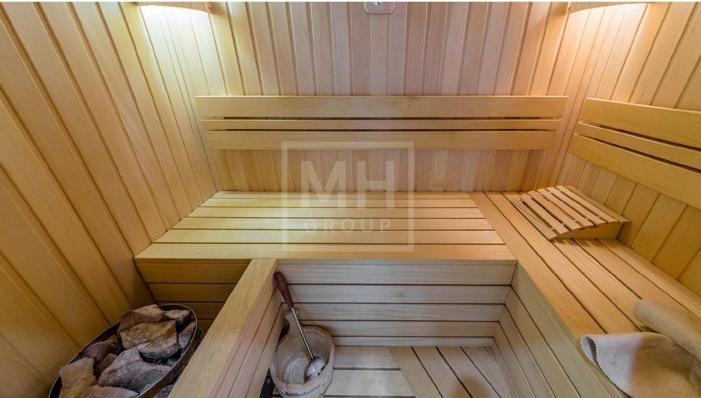 Есть кабинет, сауна, рабочая кухня, помимо основной, места хранения,постирочная, и теплый гараж.