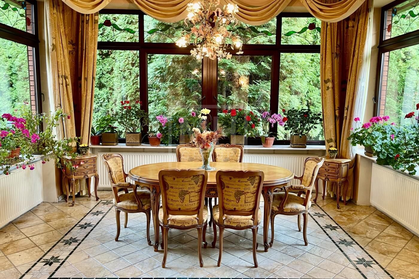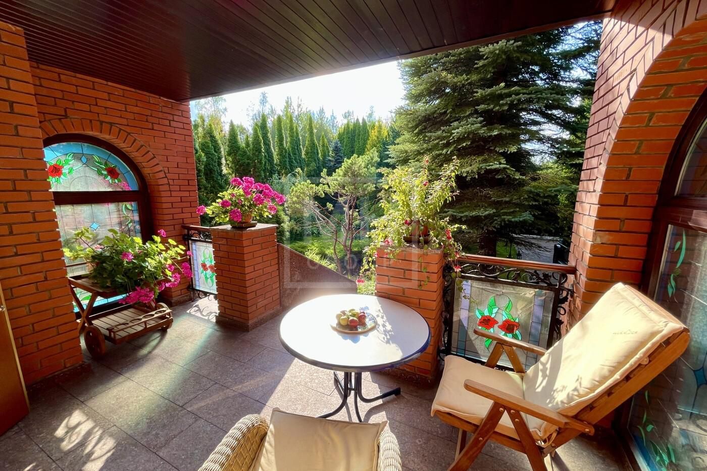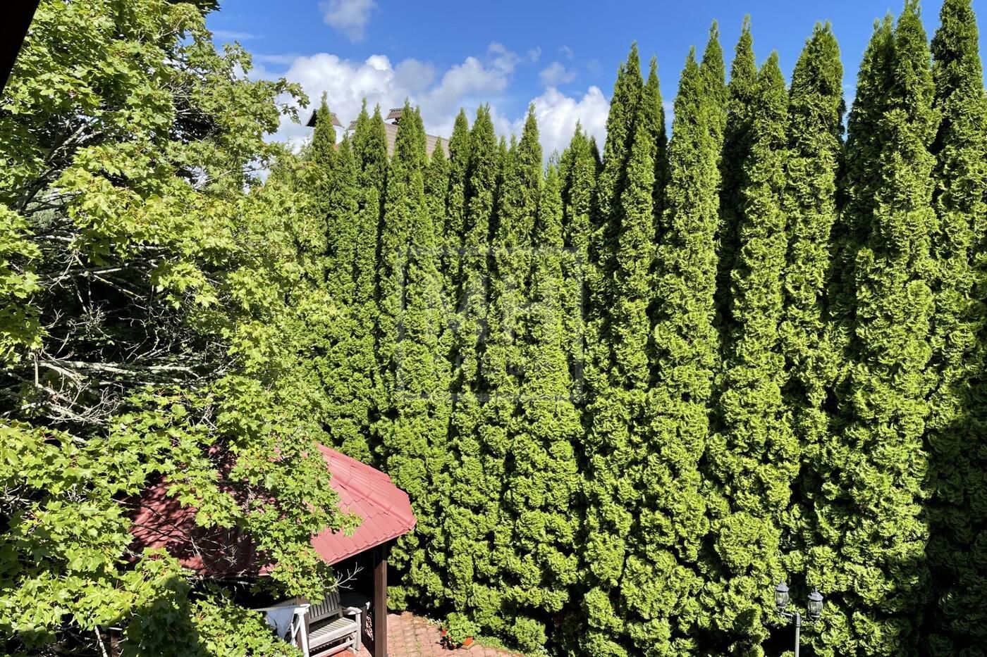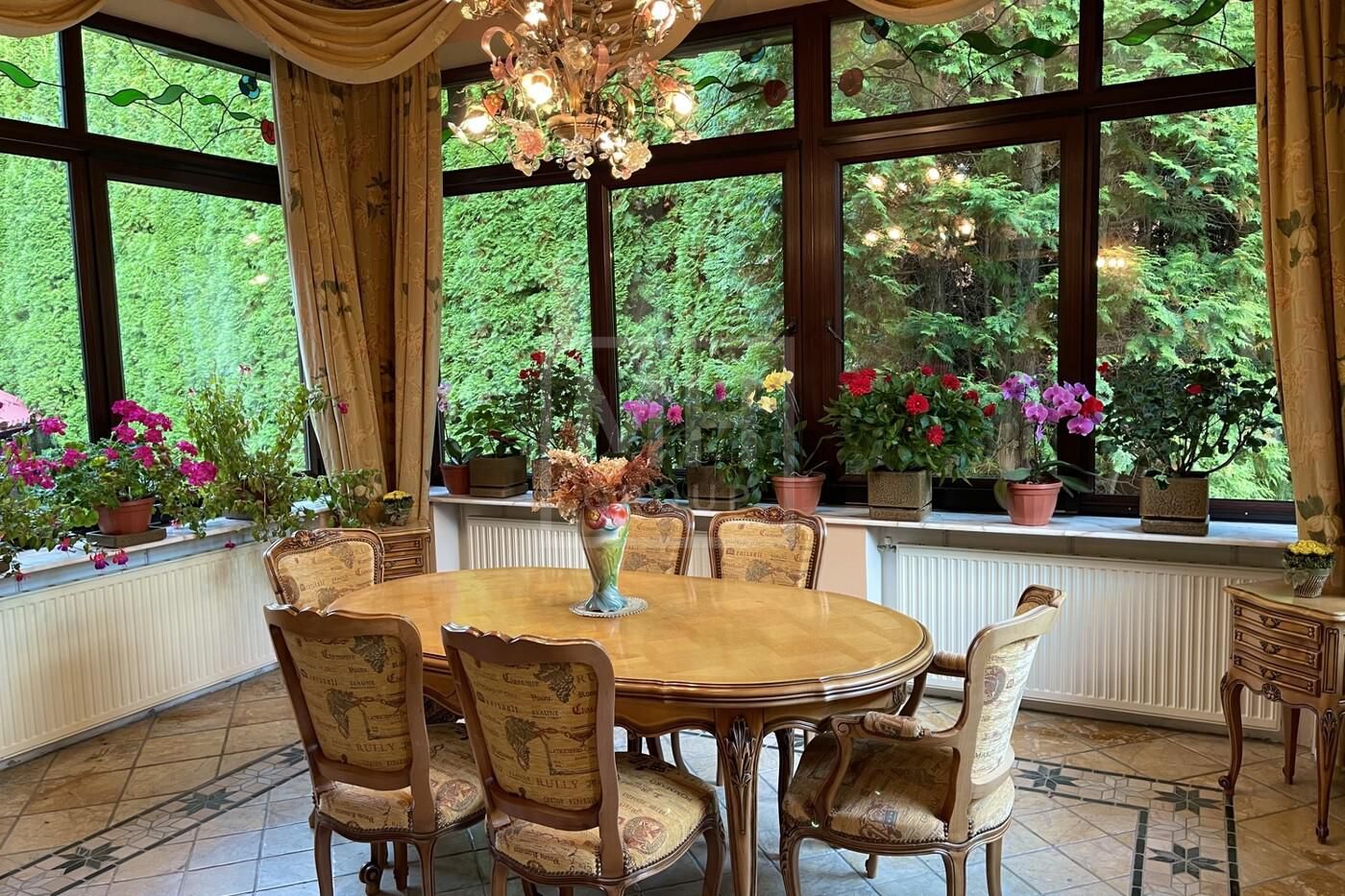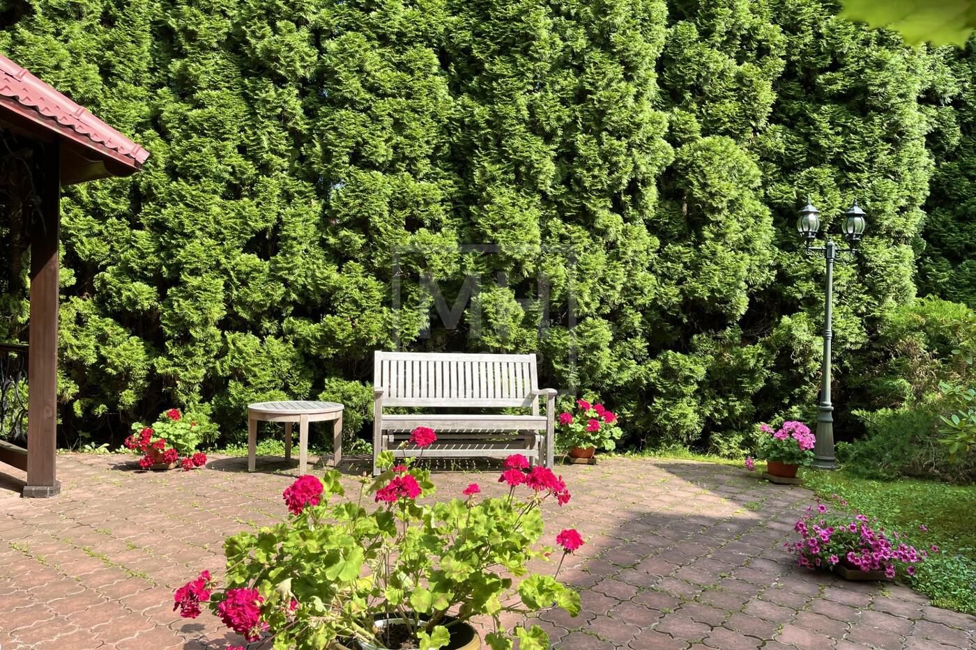 набор мебели для сада из тика английской фирмы Глостер (Gloster). По периметру участка высажены 300 туй Смарагд, на территории участка растут сирень, жасмин, рододендрон, хосты, лилейники, спирея, банзайская сосна, можжевельники, клены, дуб, рябина, ели. Дом полностью готов к проживанию.