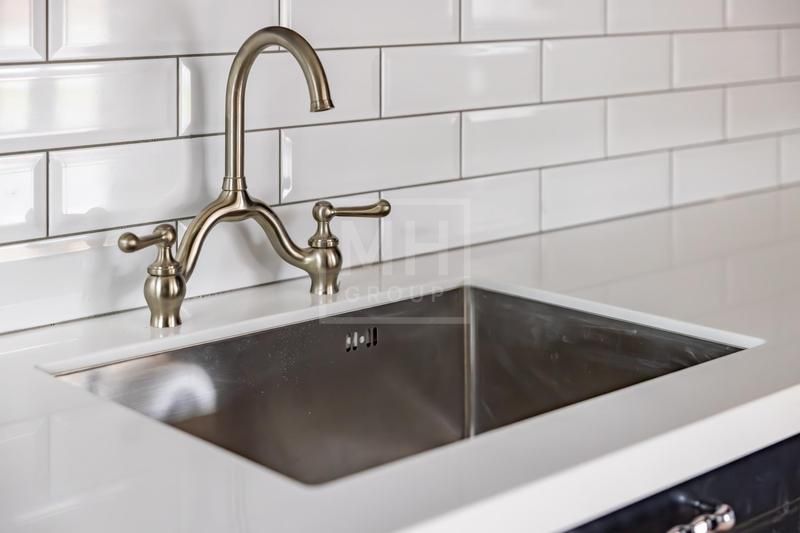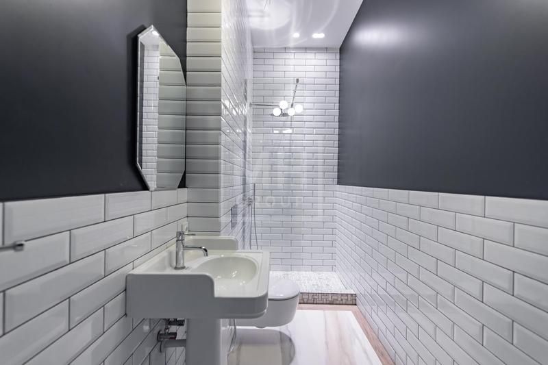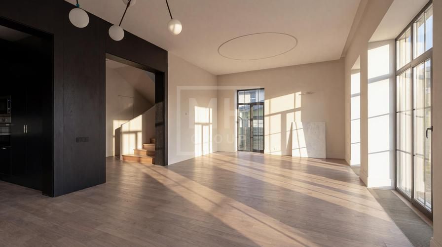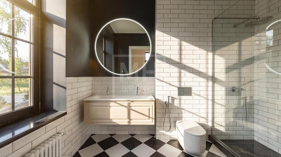 уложен широкоформатный керамогранит Rex Ceramice. Установлены межкомнатные двери высотой 230 см (Dveri Garant), комплектующие Colombo, встроенные светильники Centrsvet и сантехника от Villeroy&Boch, Kerama Marazzi, Boheme,