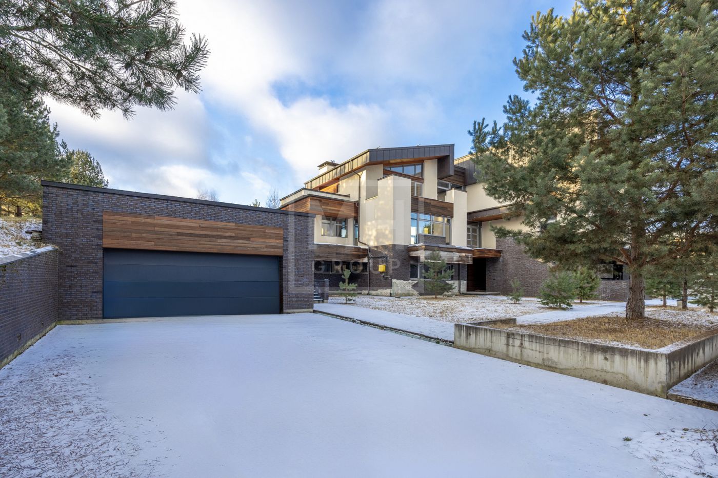 На благоустроенном участке выполнен ландшафтный дизайн террасированием и подпорными стенами, где гармонично интегрированы большие камни, разбит парк из более чем двадцати крупных деревьев, проложено множество прогулочных дорожек и подготовлен фундамент под летнюю веранду или беседку, оборудован гараж на 4 автомобиля.