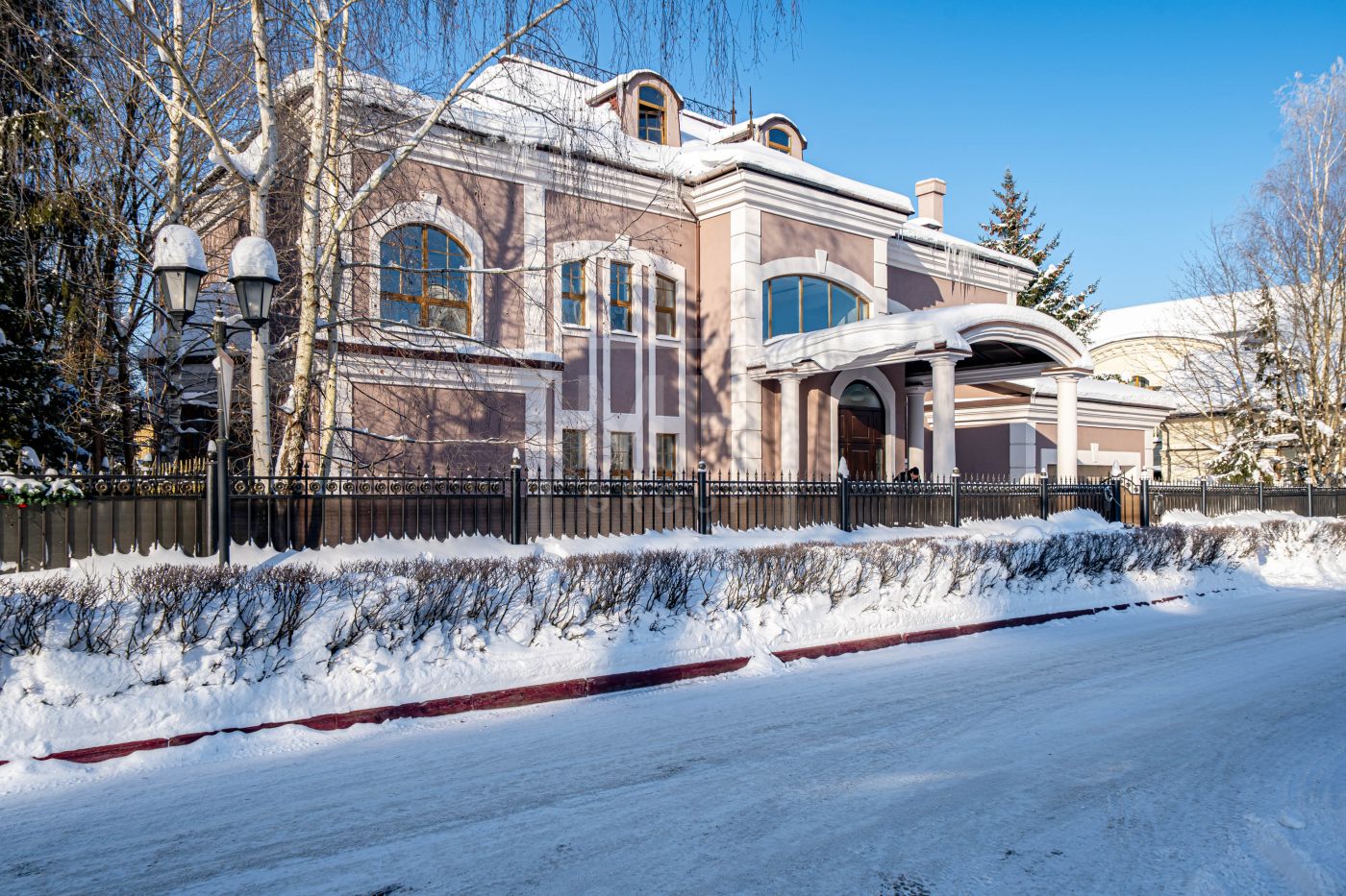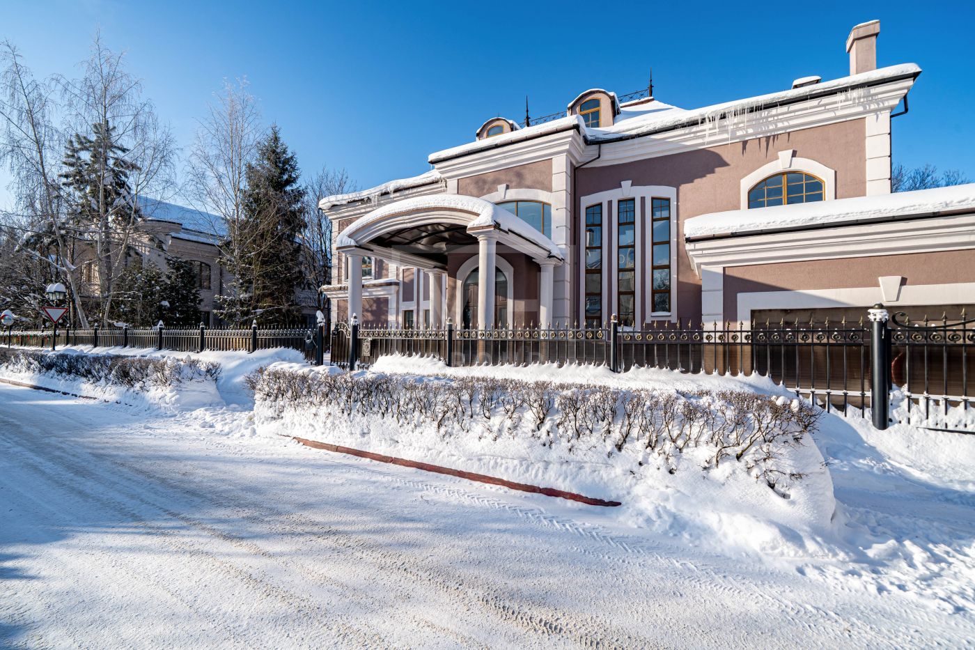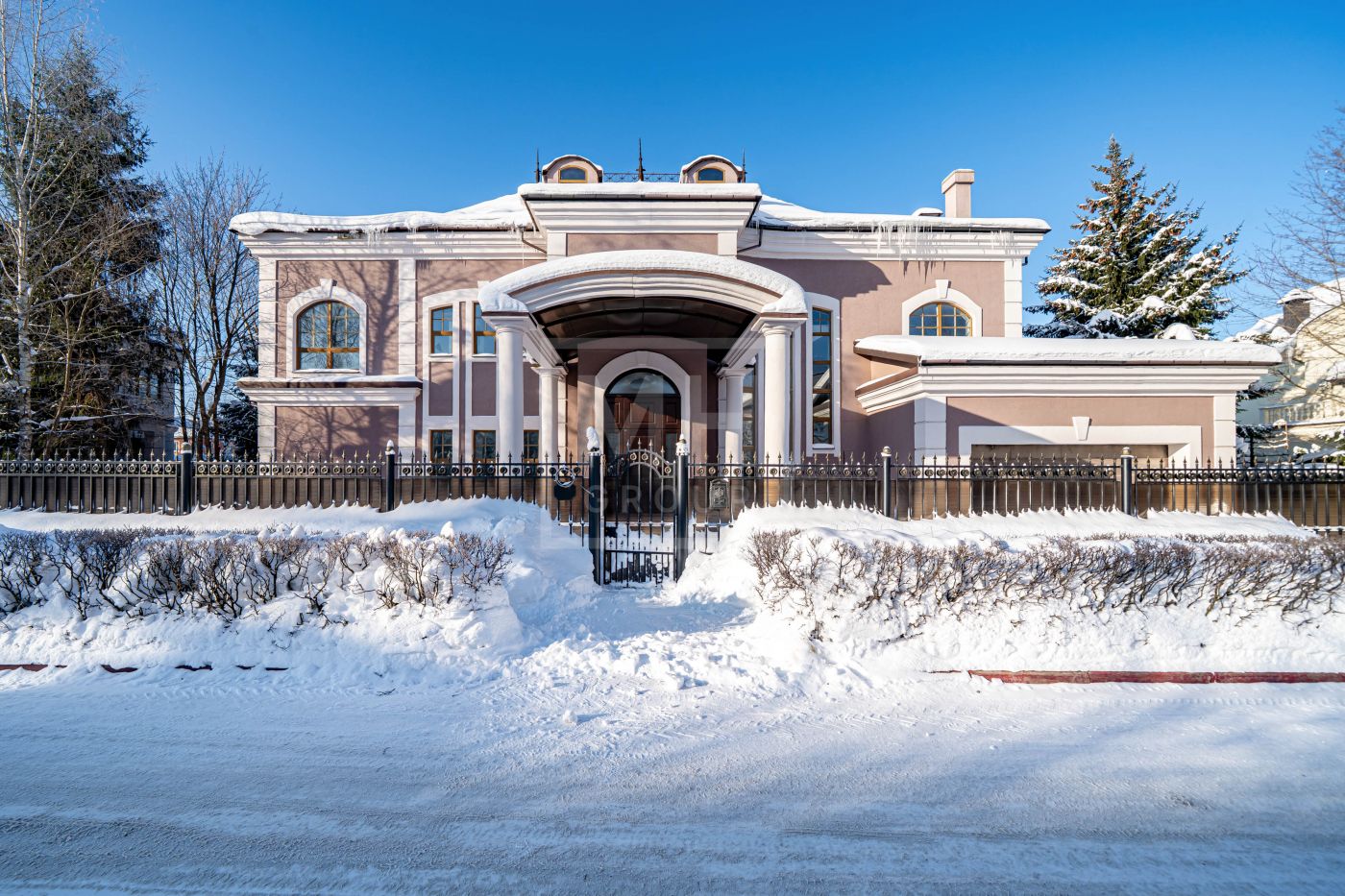 Дом выполнен в классическом стиле, создавая ощущение прочности и элегантности. Элементы барельефов, арочные окна и изысканная колоннада придают фасаду неповторимый стиль.Интерьеры выполнены с акцентом на натуральные материалы: дуб, мрамор и ковка. Центральным элементом является мраморная лестница с коваными ограждениями и дубовыми перилами.