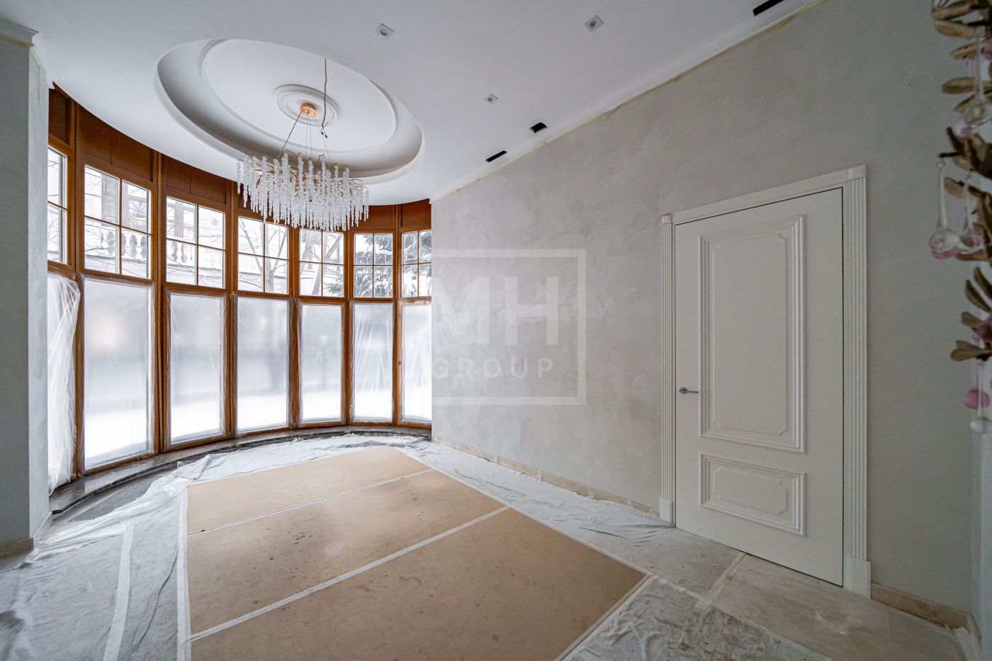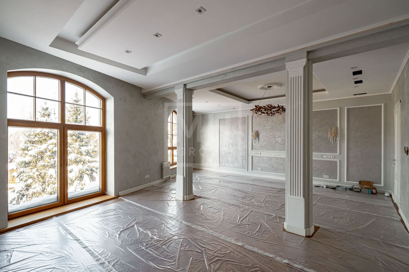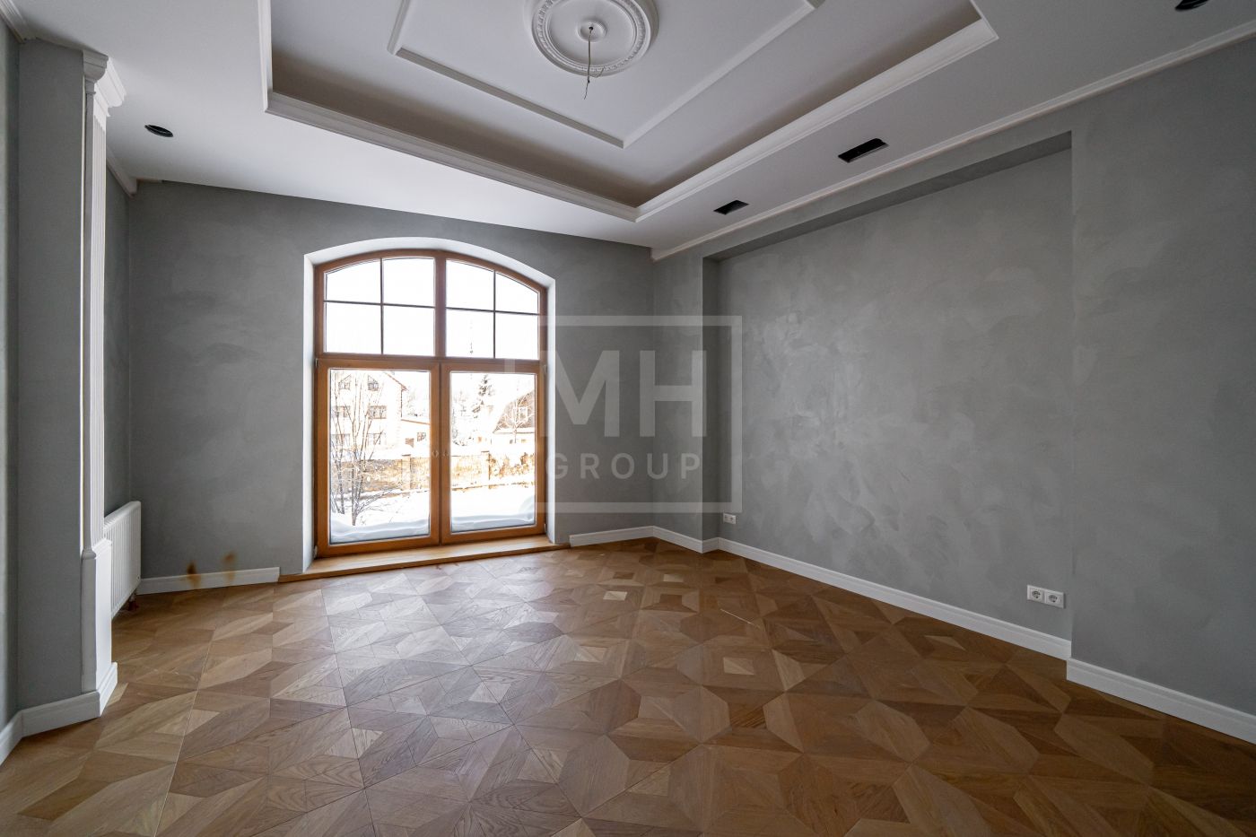 Высота потолков составляет 3,5 м, что создаёт ощущение лёгкости и простора. Наборный дубовый паркет на полу подчеркивает атмосферу уюта и тепла. На первом этаже предусмотрен тёплый пол, на втором этаже – в санузлах. Установлена приточно-вытяжная вентиляция.