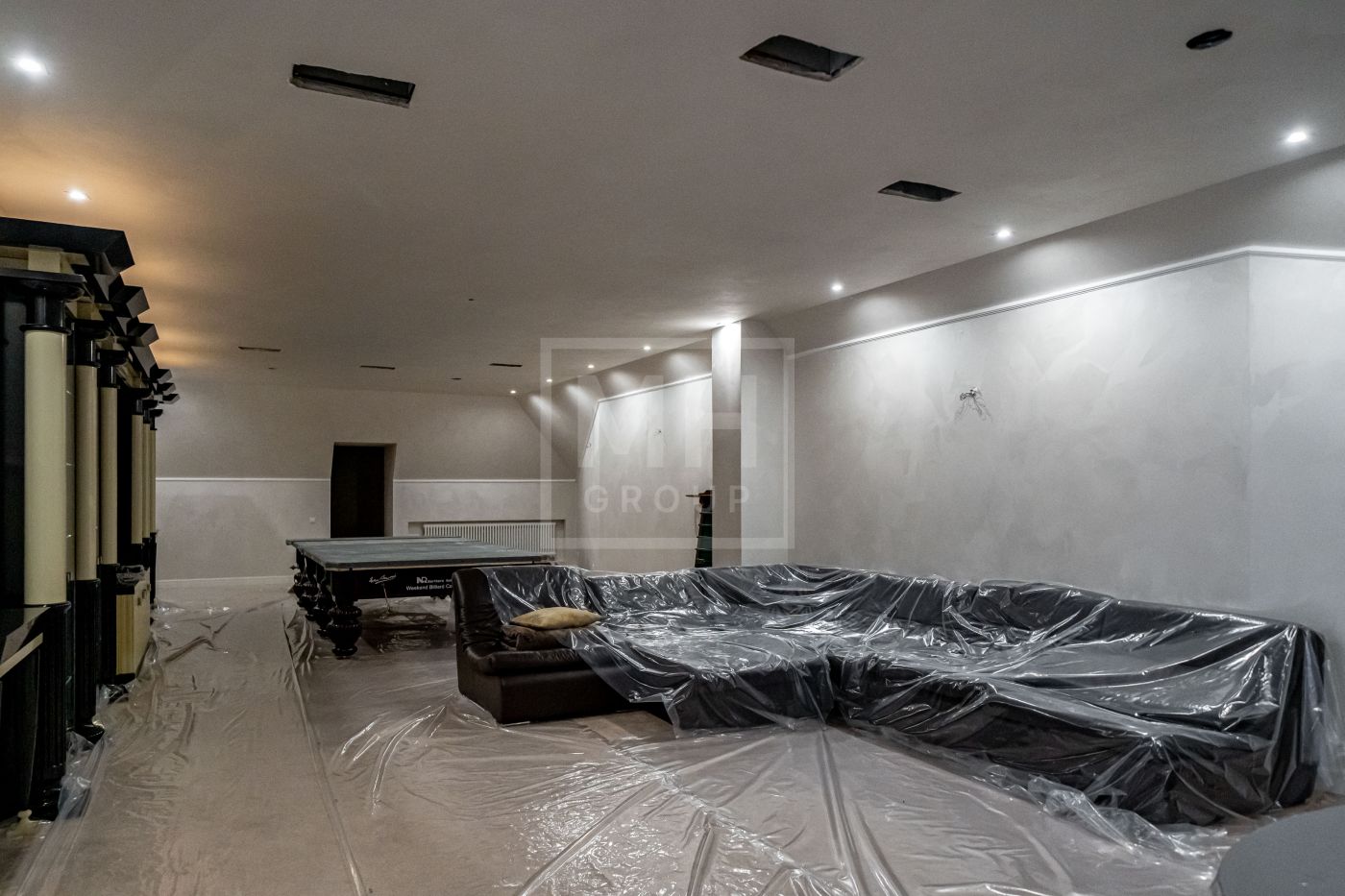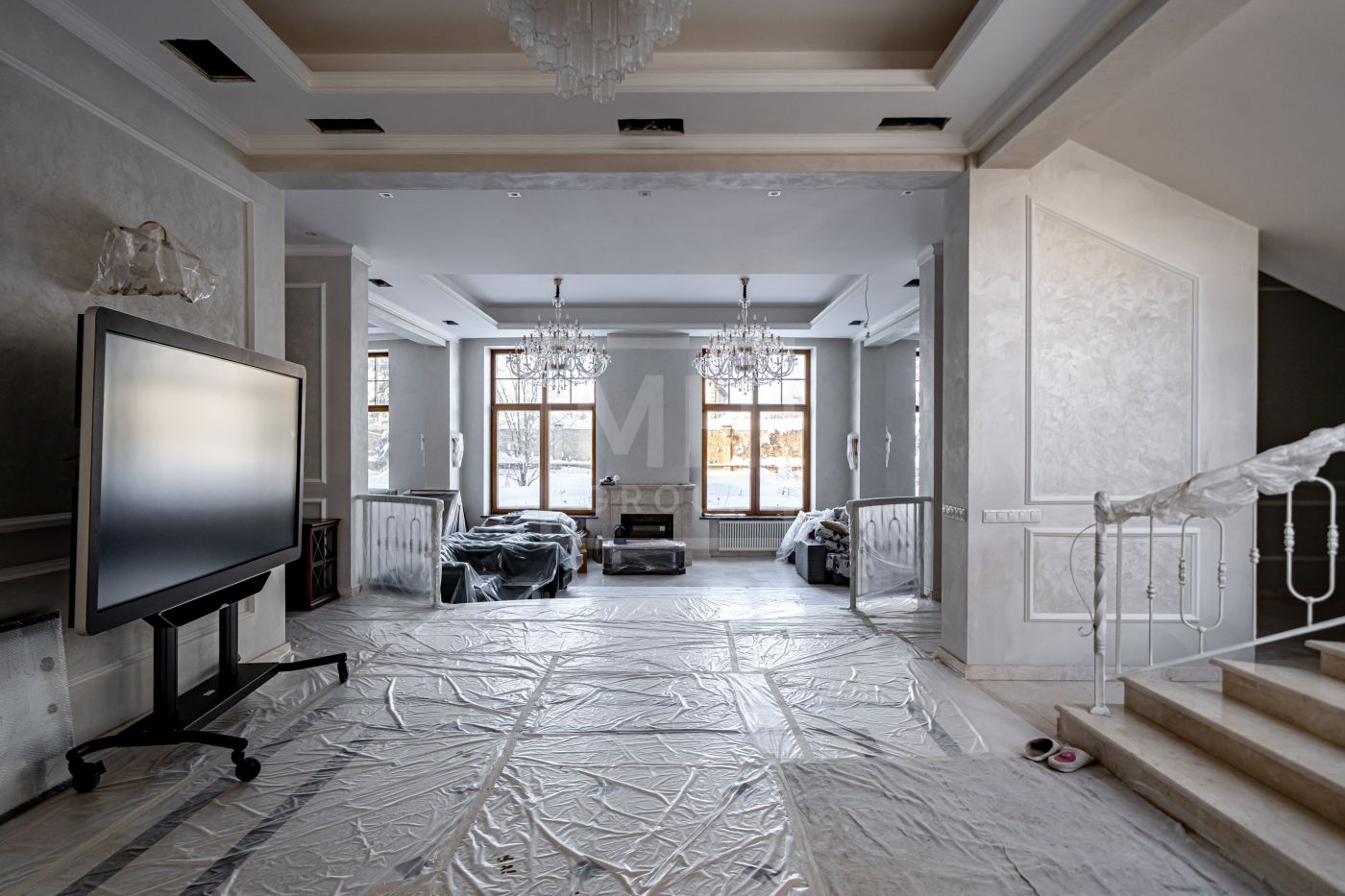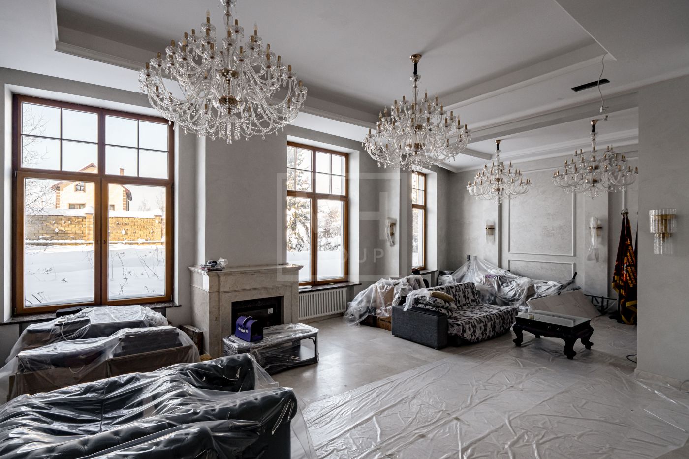 Высота потолков составляет 3,5 м, что создаёт ощущение лёгкости и простора. Наборный дубовый паркет на полу подчеркивает атмосферу уюта и тепла. На первом этаже предусмотрен тёплый пол, на втором этаже – в санузлах. Установлена приточно-вытяжная вентиляция.