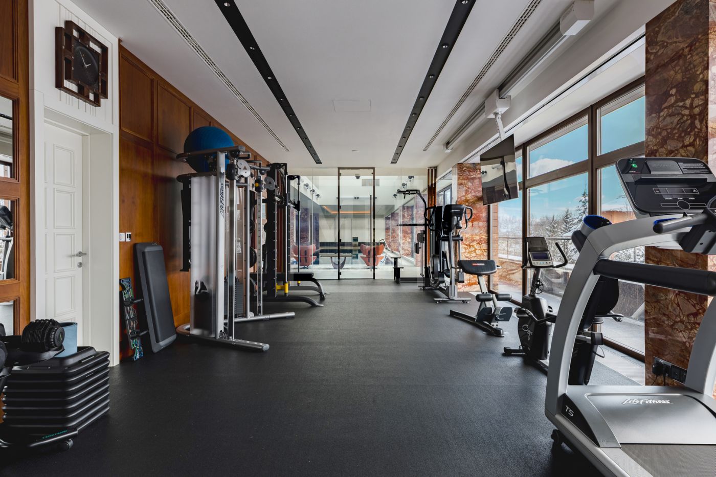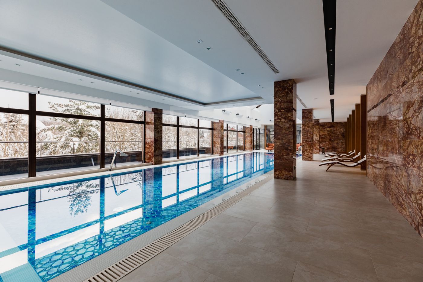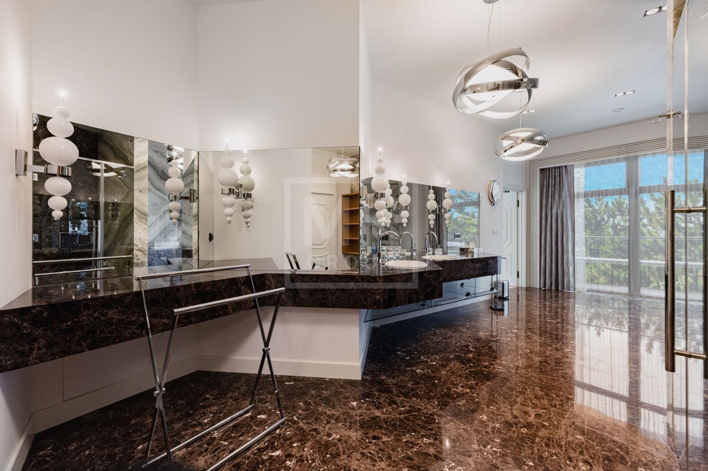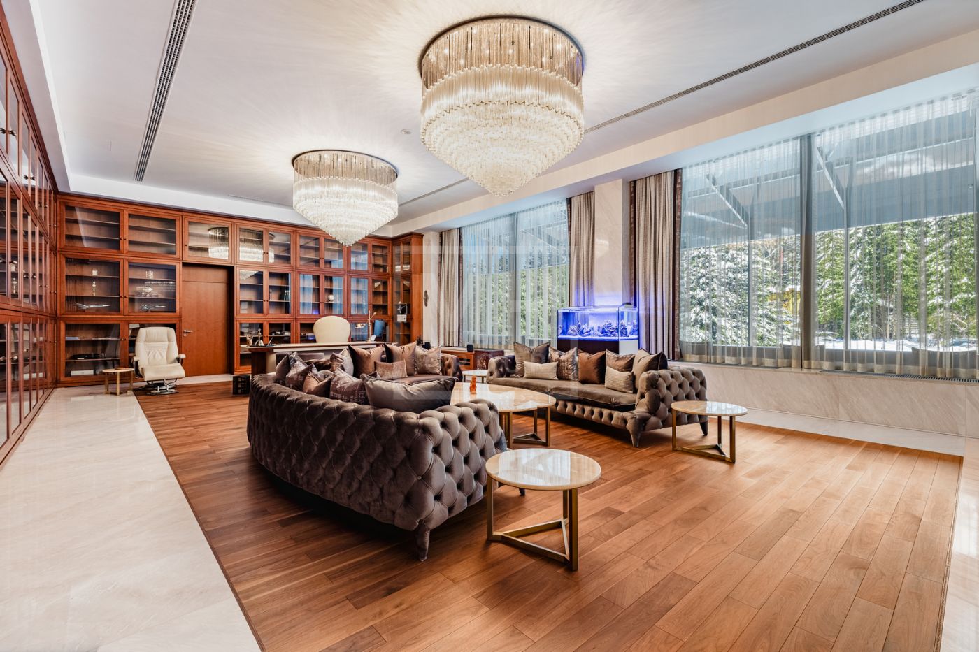 Этаж 2: мастер-спальня №1: 2 с/у, 2 гардеробные; мастер-спальня №2: с/у, гардеробная; бассейн 25×5 м, спортзал, массажная, сауна, хамам, мини-кухня, раздевалка, аквариумы с морской водой и настоящими кораллами, серверная