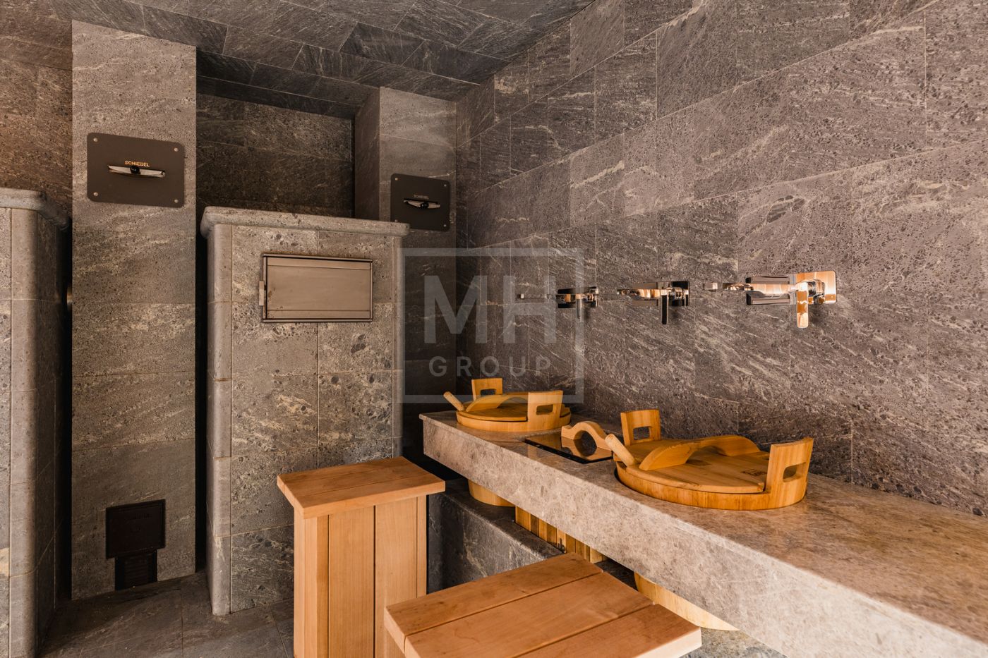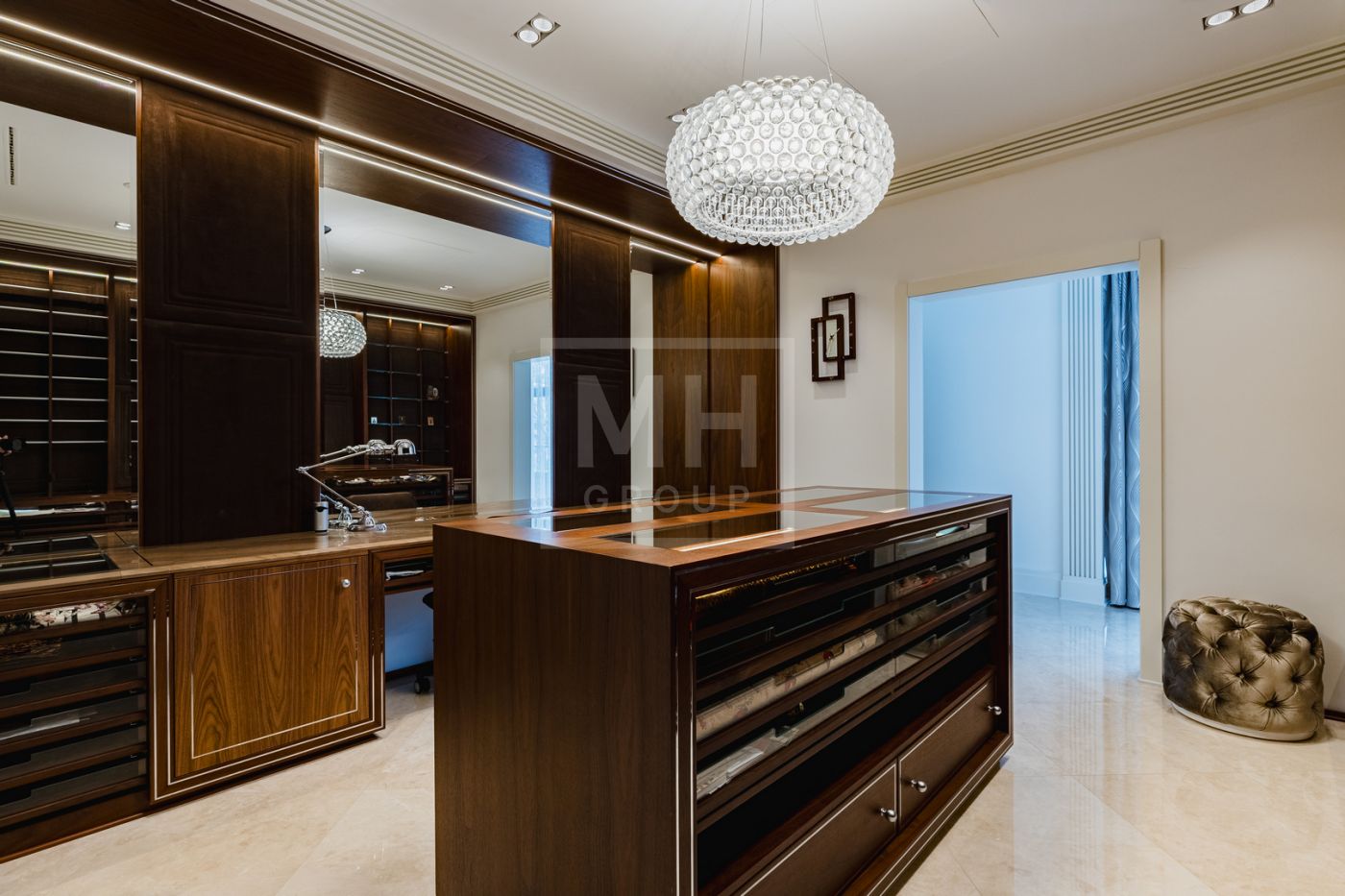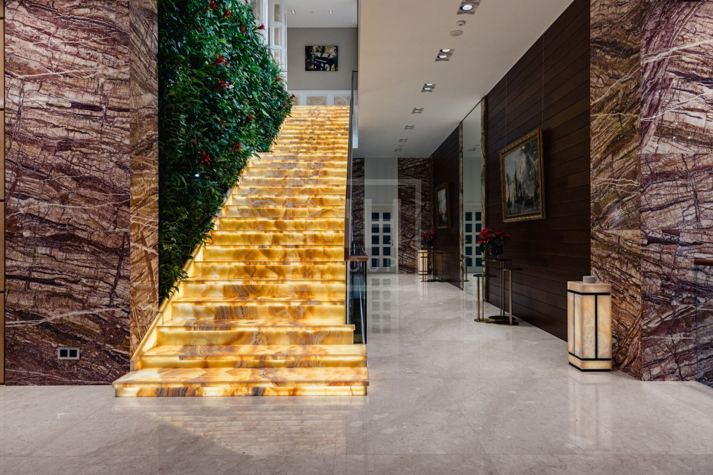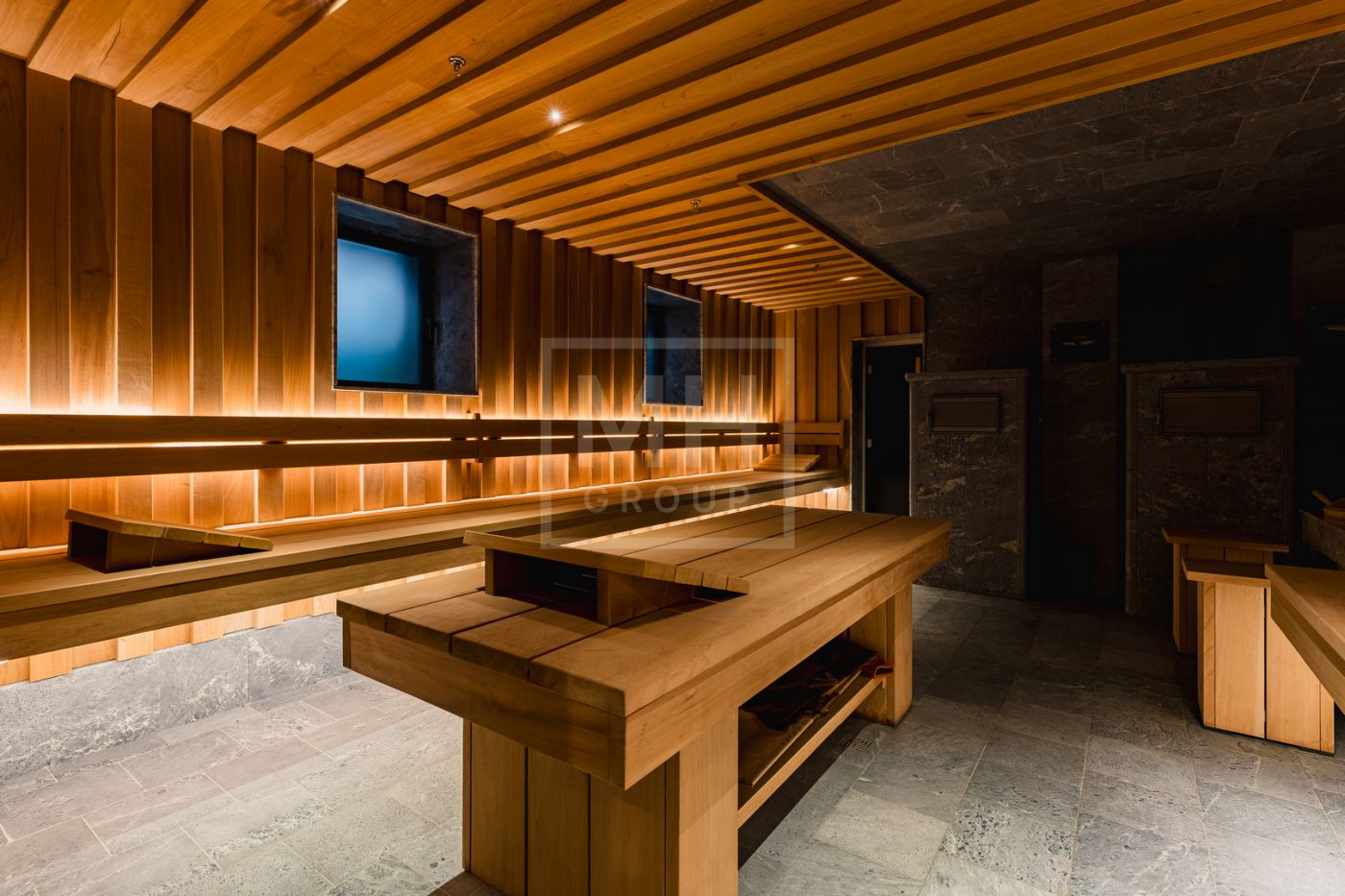 Этаж 2: мастер-спальня №1: 2 с/у, 2 гардеробные; мастер-спальня №2: с/у, гардеробная; бассейн 25×5 м, спортзал, массажная, сауна, хамам, мини-кухня, раздевалка, аквариумы с морской водой и настоящими кораллами, серверная