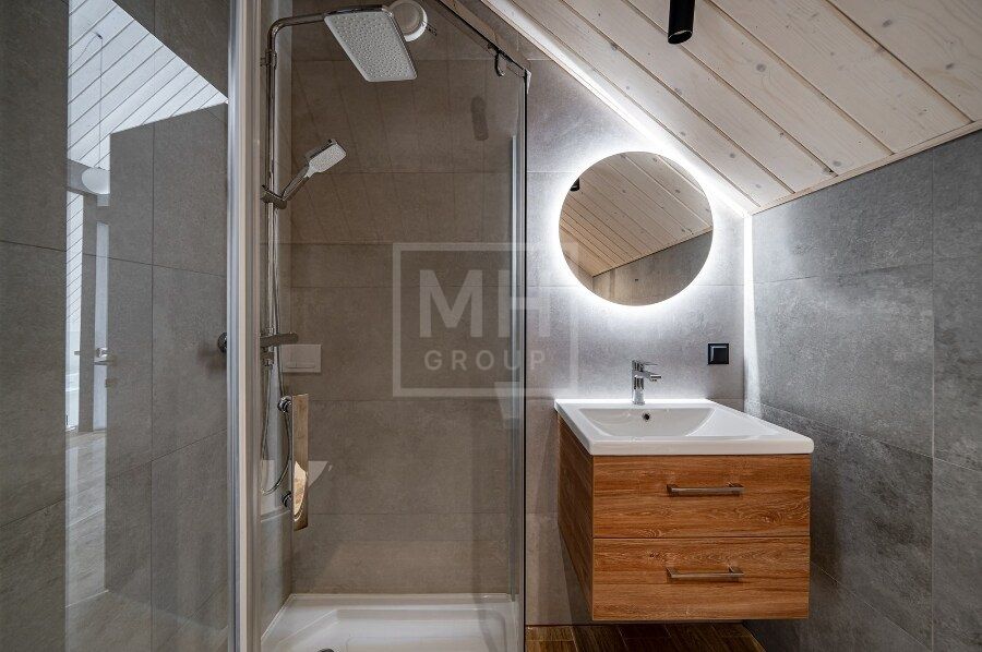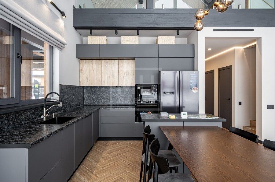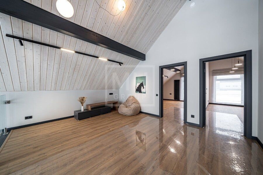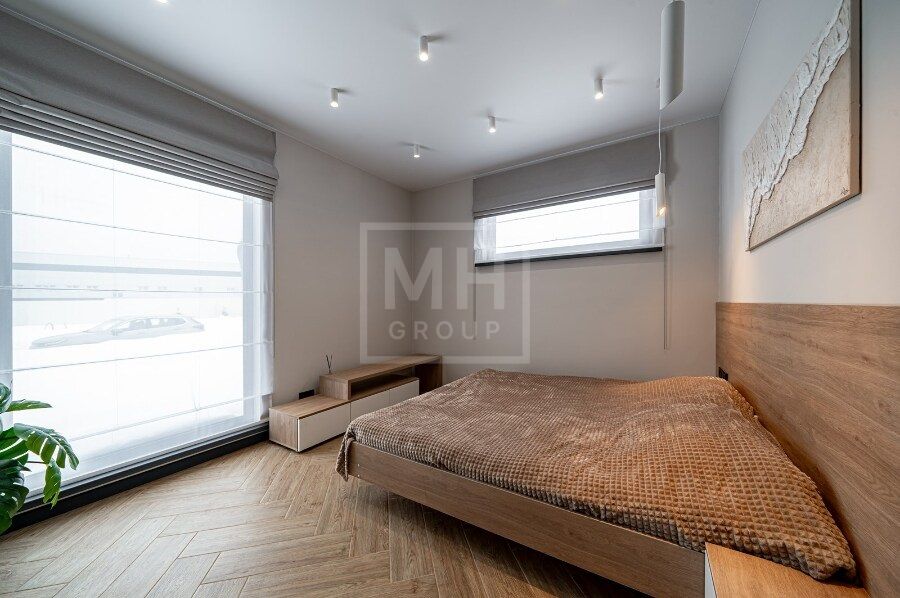 Планировка: 3 спальни, включая мастер-спальню с собственным гардеробом и с/у, две просторные детские комнаты, кабинет/гостевая на первом этаже, 3 с/у, гардеробные и места хранения, уличная терраса, хозблок.