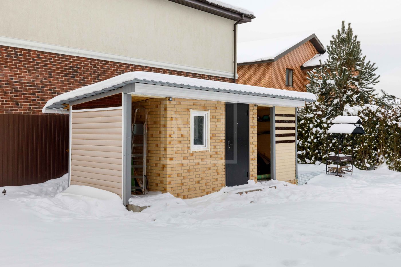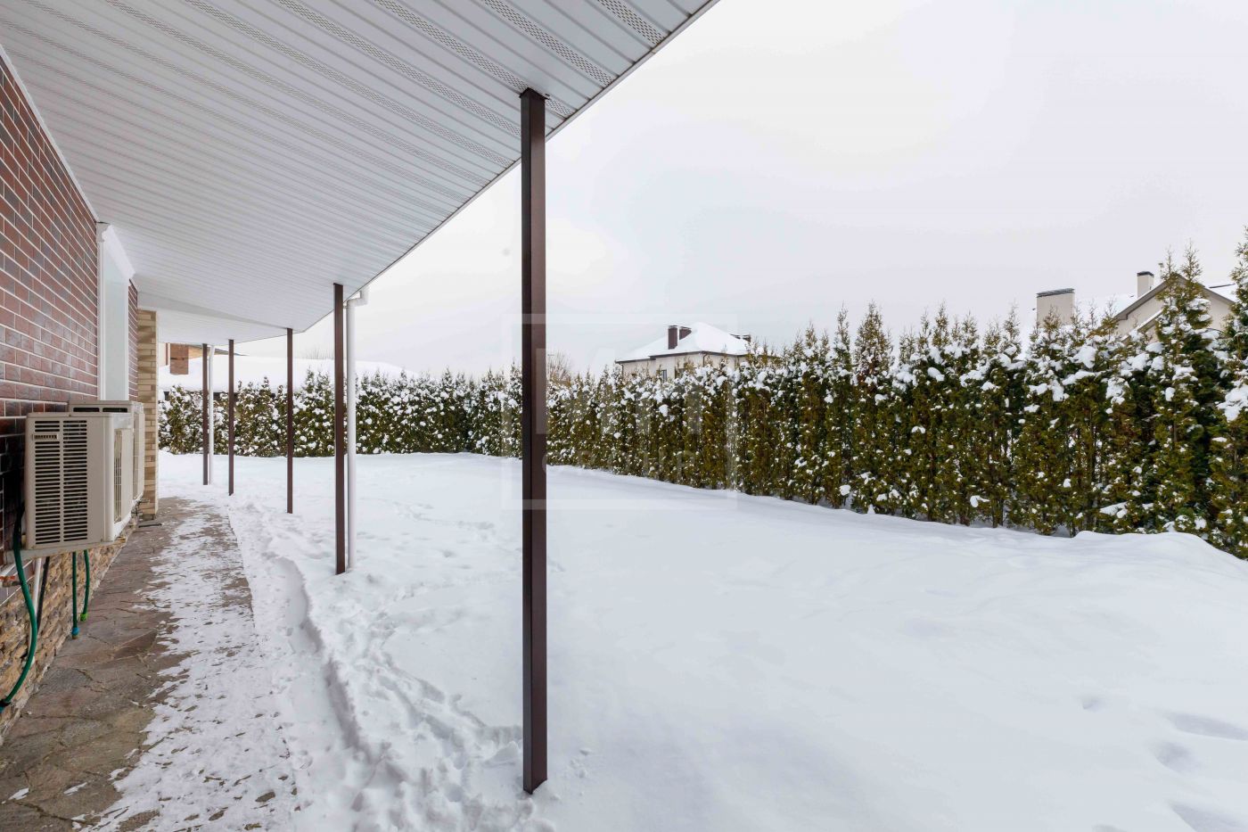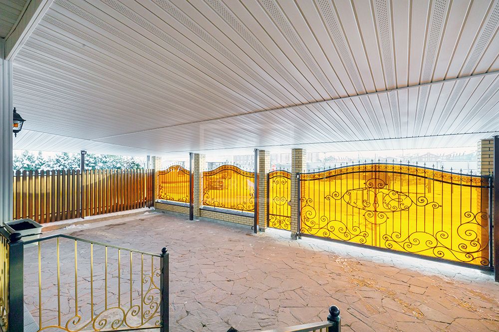 Участок благоустроен туи по периметру, английский газон, молодые плодовые деревья, два тёплых парника, плиточные дорожки, кованый забор и навес на четыре автомобиля.
