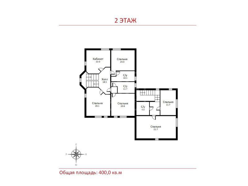 Этаж 2: кабинет, спальня с ванной комнатой, 2 спальни, ванная комната, гостевой блок с 2-мя спальнями и с/у.
