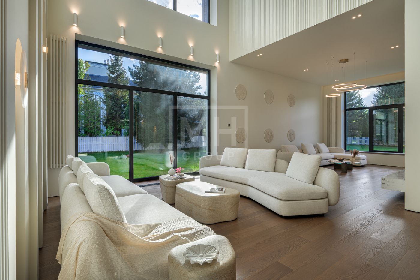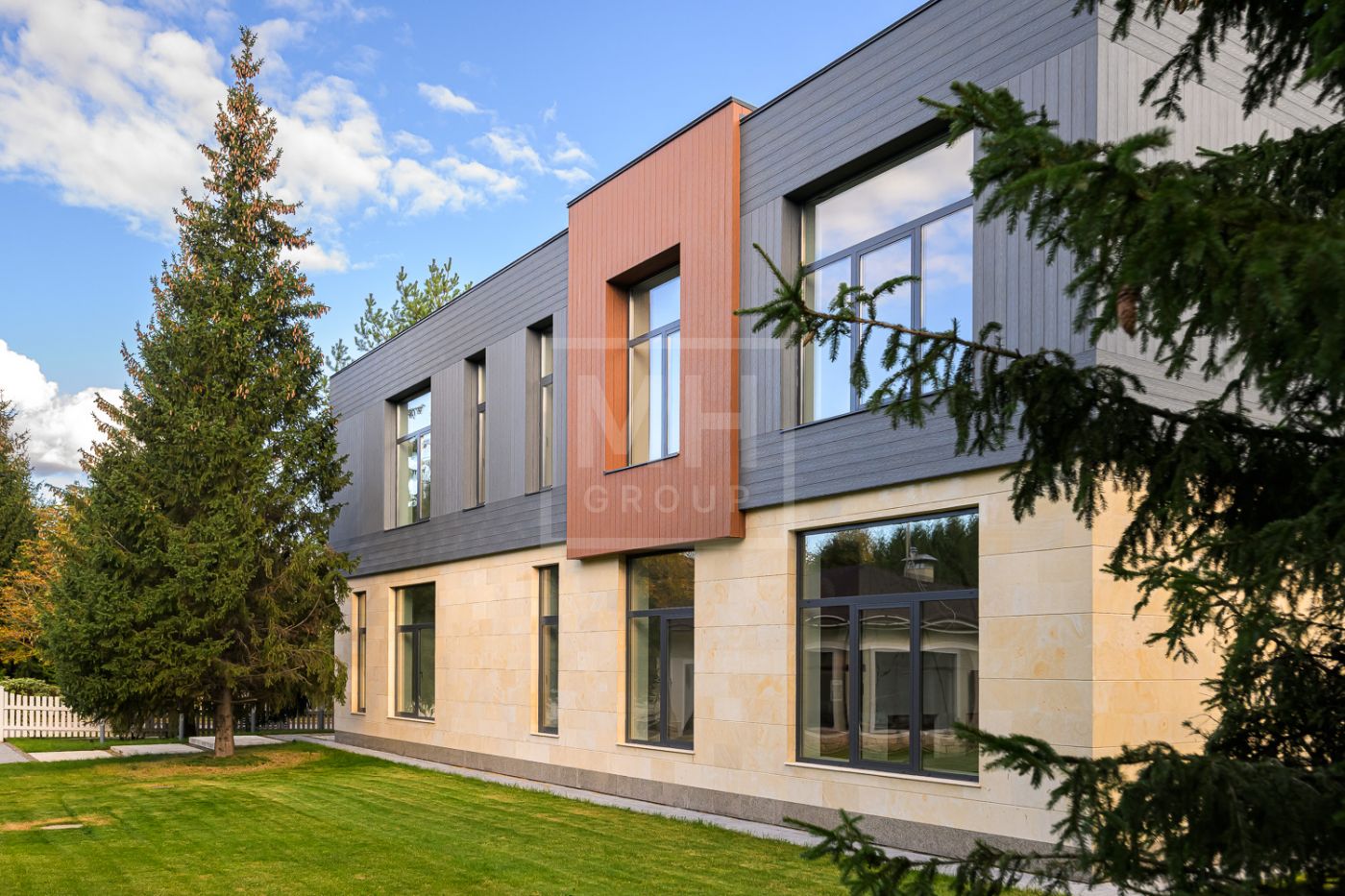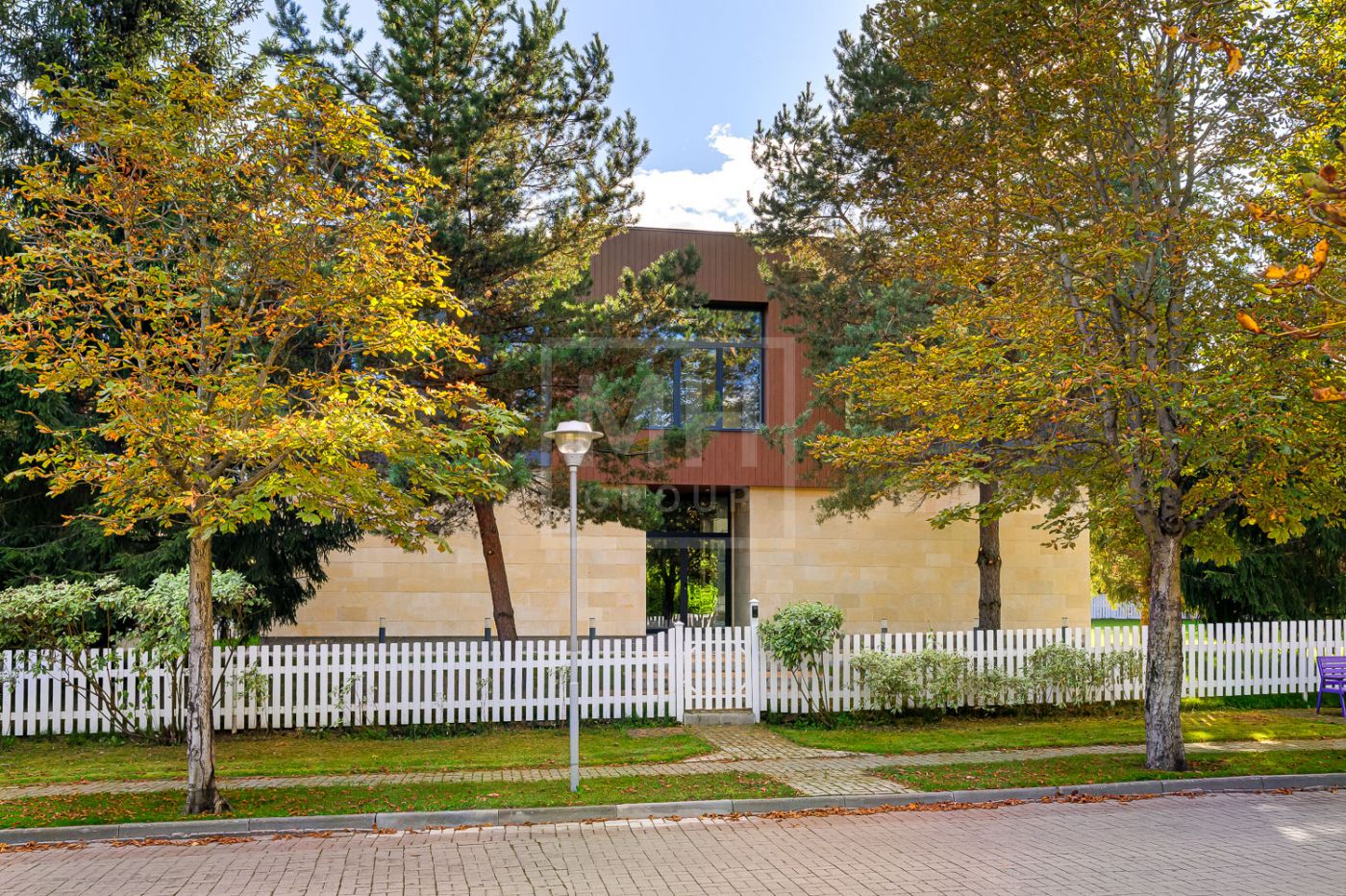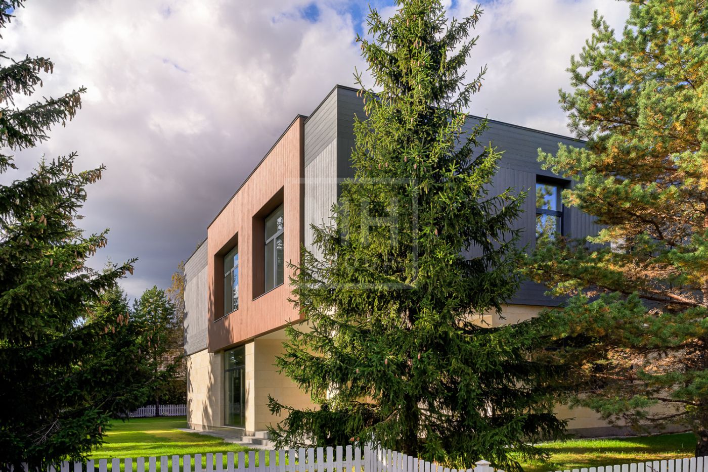 Дом под ключ, в КП «Резиденции Бенилюкс». Дом расположен на участке со взрослыми хвойными деревьями. Посадка дома учитывает соседние дома, до которых более 20м и обеспечивает ощущение приватности и отсутствие ситуации «окна в окна». Взрослые деревья на собственном и соседних участках создают полное ощущение светлого хвойного леса. Все соседние участки застроены. На участке построен гараж на 2 машиноместа с техническими помещениями и квартирой персонала, площадью 123м. Предусмотрена открытая парковка на 5 машиномест.